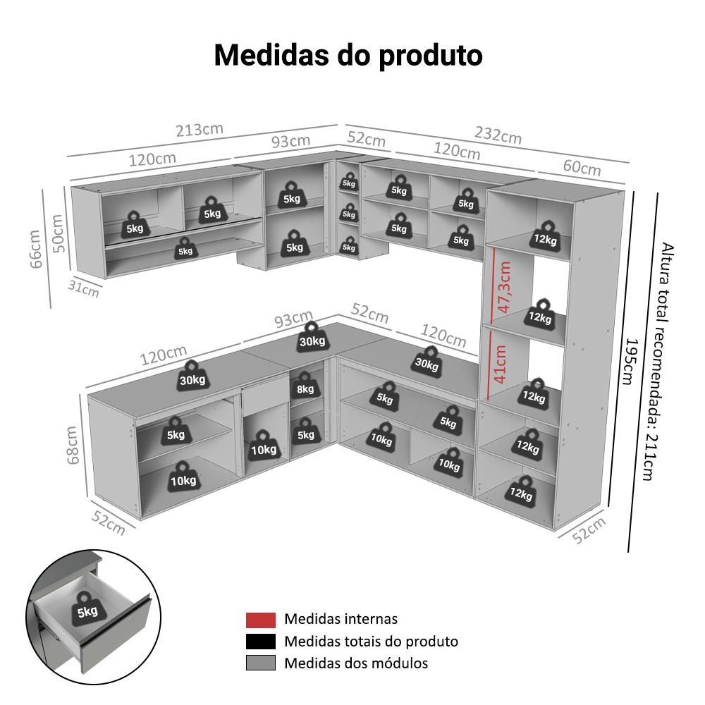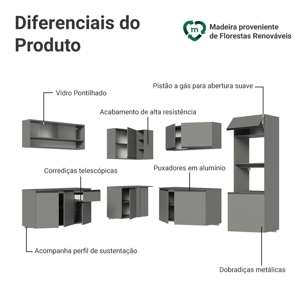 A Cozinha Nice combina um visual moderno e características que facilitam o uso no dia a dia.A linha Nice se diferencia por ser suspensa, acompanhando ferragens para fixação. O acabamento de alta resistência em cinza e os puxadores em alumínio reforçam o visual moderno, enquanto as corrediças proporcionam abertura total das gavetas. Os balcões acompanham tampo, garantindo praticidade.O destaque fica por conta do armário aéreo com porta de vidro pontilhado, adega integrada e torre quente com espaço dedicado para forno ou micro-ondas.Medidas totais:- 211 cm de altura- 445 cm de largura- 52 cm de profundidade nos balcões e torre quente e 31 cm nos aéreosInformações técnicas:- Material: MDP- Peso total suportado: 283 kgO que você recebe:- Uma Torre Quente de 60cm- Um Aéreo de 120cm- Dois Balcões de 120cm- Um Aéreo de Canto com adega acoplada- Um Balcão de Canto- Um aéreo de 120cm com vidro pontilhadoCódigo do produto: GCNC4450033BÉ importante saber:- Imagens meramente ilustrativas, a decoração não acompanha o produto- A Madesa não disponibiliza serviço de montagem- O produto segue com manual de instalação e todas as ferragens necessárias para sua montagemA Madesa possui compromisso com a sustentabilidade. Geramos energia limpa em nossa própria usina, priorizamos fornecedores responsáveis e utilizamos plástico reciclado em nossa produção. Além disso, reinserimos sobras no ciclo de reciclagem e investimos no desenvolvimento de nossos colaboradores e da comunidade.Garantia: Este produto conta com 1 ano de garantia total, sendo 3 meses de garantia legal e 9 meses de garantia contratual. A garantia cobre exclusivamente defeitos de fabricação e vícios ocultos. Não estão cobertos: problemas decorrentes de montagem incorreta, uso inadequado, exposição à umidade, calor ou luz solar direta, modificações no produto ou desgaste natural.