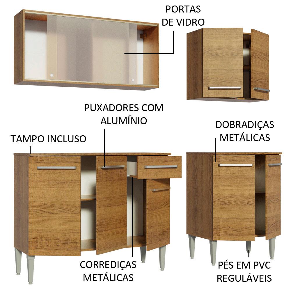 A Cozinha Completa Emilly Box tem espaço para tudo. São dois balcões e dois armários aéreos que permitem uma melhor organização de talheres, louças e demais utensílios de cozinha.Um dos grandes destaques é o armário aéreo maior, que possui duas portas de correr de vidro, um detalhe que traz muita sofisticação e elegância à sua cozinha.Todos os módulos são separados e podem ser montados conforme a necessidade do espaço. Além disso, são fabricados com materiais de qualidade, como puxadores com detalhe em alumínio e corrediças e dobradiças metálicas.Para completar, ambos os balcões possuem tampo em MDP e contam com pés reguláveis em PVC, que facilitam a limpeza e podem ser ajustados para nivelar pequenas imperfeições no piso.O acabamento é no padrão amadeirado Rustic, em Pintura Poliéster ecológica com 7 camadas de proteção, que oferecem resistência contra os efeitos da água e do calor.Os armários aéreos precisam ser fixados na parede.Medidas totais: 186 cm de altura x 169 cm de largura x 44 cm profundidade nos balcões e 27 cm nos aéreos.Imagens meramente ilustrativas: a decoração não acompanha o produto.Itens inclusos:- Um (1) Armário Aéreo com duas (2) portas em vidro e dois (2) nichos internos- Um (1) Balcão com três (3) portas, uma (1) gaveta e tampo- Um (1) Armário Aéreo com uma (1) prateleira interna e duas (2) portas - Um (1) Balcão com duas (2) portas e tampoCódigo do produto: GREM1690035ZObs.: A Madesa não disponibiliza serviço de montagem. O produto segue com manual de instalação e todas as ferragens necessárias para sua montagem.1-O produto é novo ou usado?R.: Todos os produtos da Madesa são novos, enviados da nossa fábrica diretamente para as casas de nossos clientes.2-O produto vem montado? Se não, vocês realizam a montagem?R.: A Madesa não disponibiliza serviço de montagem. Todos os produtos seguem com manual de instalação e as ferragens necessárias. Alguns produtos possuem vídeo explicando o passo a passo da montagem.3-Vocês possuem loja física? Posso retirar meu produto em mãos?R.: Não possuímos loja física, apenas loja virtual. Confira as opções de envio ao colocar o seu CEP.4-Qual é o valor do envio? Posso pagar separadamente?R.: O valor do envio é calculado com base no peso e volume do produto, e no CEP de destino. Você pode calcular o valor e prazo de entrega no simulador.5-A Madesa entrega em todo Brasil? Como é feita a entrega?R.: Sim, entregamos no Brasil inteiro através de transportadoras parceiras.6-O produto acompanha Nota Fiscal?R.: Sim, todos os produtos são entregues com suas respectivas notas fiscais.7-Os produtos possuem garantia?R.: Sim. A Madesa oferece 3 meses de garantia para defeitos de fabricação.A Madesa se dedica à sustentabilidade com várias iniciativas: temos uma usina própria para gerar energia que abastece uma de nossas fábricas. Selecionamos nossos fornecedores, priorizando aqueles que possuem um compromisso com a sustentabilidade e proteção do meio ambiente. Todo o plástico utilizado no setor produtivo é proveniente de reciclagem e as suas sobras são encaminhadas ao fornecedor que os recicla. Também investimos no desenvolvimento contínuo de nossos colaboradores e em ações educacionais que beneficiem a comunidade.