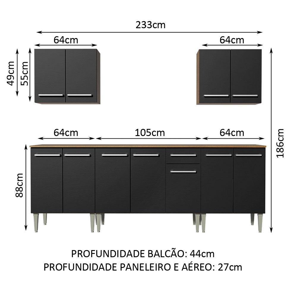 A linha de cozinha Emilly da Madesa é fabricada com materiais de qualidade, como puxadores com detalhe em alumínio e corrediças e dobradiças metálicas. Todos os módulos são separados, possibilitando a montagem conforme a necessidade do seu espaço.Os pés são em PVC, pensando em facilitar a limpeza e reguláveis para nivelar pequenas imperfeições no piso. Internamente, o espaço é muito bom para organizar louças e demais utensílios de cozinha. Para completar, ambos os balcões acompanham tampo em MDP.O acabamento da estrutura é no padrão amadeirado Rustic e as portas e frente são pretas. As partes internas das costas e da gaveta são brancas. O processo é feito em Pintura Poliéster ecológica com 7 camadas de proteção, que oferecem resistência contra os efeitos da água e do calor.Medidas totais: 186 cm de altura x 233 cm de largura x 44 cm profundidade nos balcões e 27 cm nos aéreos.(Imagens meramente ilustrativas: a decoração não acompanha o produto. O armário aéreo e o paneleiro precisam ser fixados na parede.)Itens inclusos:- Dois (2) Armários Aéreos com duas (2) portas cada- Dois (2) Balcões com duas (2) portas e um (1) tampo cada- Um (1) Balcão com três (3) portas, uma (1) gaveta e tampoCódigo do produto: GREM2330017KObs.: A Madesa não disponibiliza serviço de montagem. O produto segue com manual de instalação e todas as ferragens necessárias para sua montagem.1-O produto é novo ou usado?R.: Todos os produtos da Madesa são novos, enviados da nossa fábrica diretamente para as casas de nossos clientes.2-O produto vem montado? Se não, vocês realizam a montagem?R.: A Madesa não disponibiliza serviço de montagem. Todos os produtos seguem com manual de instalação e as ferragens necessárias. Alguns produtos possuem vídeo explicando o passo a passo da montagem.3-Vocês possuem loja física? Posso retirar meu produto em mãos?R.: Não possuímos loja física, apenas loja virtual. Confira as opções de envio ao colocar o seu CEP.4-Qual é o valor do envio? Posso pagar separadamente?R.: O valor do envio é calculado com base no peso e volume do produto, e no CEP de destino. Você pode calcular o valor e prazo de entrega no simulador.5-A Madesa entrega em todo Brasil? Como é feita a entrega?R.: Sim, entregamos no Brasil inteiro através de transportadoras parceiras.6-O produto acompanha Nota Fiscal?R.: Sim, todos os produtos são entregues com suas respectivas notas fiscais.7-Os produtos possuem garantia?R.: Sim. A Madesa oferece 3 meses de garantia para defeitos de fabricação.A Madesa se dedica à sustentabilidade com várias iniciativas: temos uma usina própria para gerar energia que abastece uma de nossas fábricas. Selecionamos nossos fornecedores, priorizando aqueles que possuem um compromisso com a sustentabilidade e proteção do meio ambiente. Todo o plástico utilizado no setor produtivo é proveniente de reciclagem e as suas sobras são encaminhadas ao fornecedor que os recicla. Também investimos no desenvolvimento contínuo de nossos colaboradores e em ações educacionais que beneficiem a comunidade.