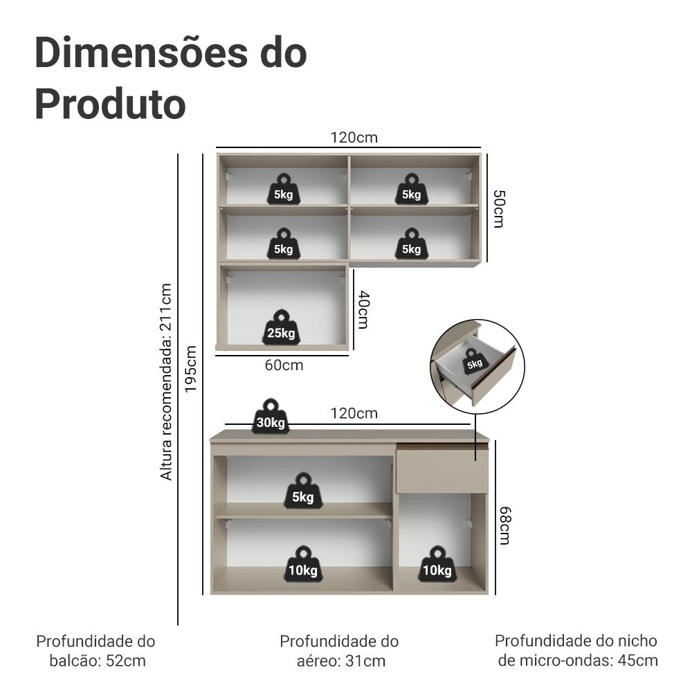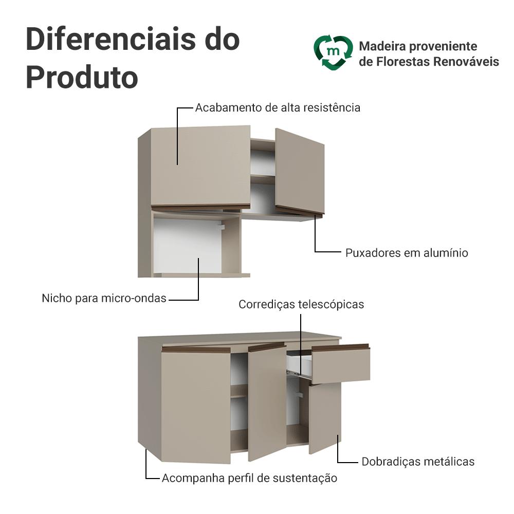 A Cozinha Compacta da linha Nice possui módulos essenciais para o dia a dia. Um dos grandes diferenciais dessa cozinha é o nicho aéreo, que oferece espaço para acomodar forno ou micro-ondas, otimizando ainda mais a organização do ambiente.A linha Nice chega em uma versão no tom crema, tonalidade que proporciona uma sensação de aconchego e leveza. Os puxadores em tom bronze metalizado são detalhes que valorizam o design trazendo um toque contemporâneo. Além disso, os móveis podem ser instalados de forma suspensa, trazendo mais praticidade para a rotina.Produzido com materiais de qualidade, o balcão conta com dobradiças metálicas nas portas e puxadores em perfil de alumínio, discretos e resistentes. As gavetas possuem corrediças que permitem abertura total. O tampo é removível, possibilitando a instalação de cuba ou pedra e o acabamento é de alta resistência, garantindo durabilidade no uso diário.Medidas totais:- 211 cm de altura- 120 cm de largura- 52 cm de profundidade no balcão, 31 cm no aéreo e 45 cm no nicho de micro-ondasO que você recebe: - Um Armário Aéreo de 120 cm com duas portas- Um Nicho aéreo de 60 cm com espaço para forno- Um Balcão de 120 cm com três portas e uma gavetaCódigo do produto: GRNC1200067PÉ importante saber:- Material: MDP- O produto não possui pés, deve ser instalado de forma suspensa.- Imagens meramente ilustrativas, a decoração não acompanha o produto.- A Madesa não oferece serviço de montagem.- O produto segue com manual e todas as ferragens necessárias para a instalação.A Madesa se dedica à sustentabilidade com várias iniciativas: temos uma usina própria que gera energia para uma das fábricas. Priorizamos fornecedores responsáveis com o meio ambiente. Todo o plástico utilizado na produção é reciclado, e as sobras também são reaproveitadas. Investimos no desenvolvimento de nossos colaboradores e em ações que beneficiem a comunidade.
