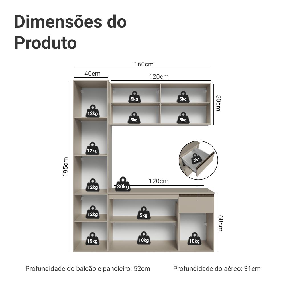 A Cozinha Compacta de 160 cm da linha Nice possui módulos essenciais para o dia a dia, proporcionando tudo o que você precisa em um ambiente prático e organizado. Um dos grandes diferenciais dessa cozinha é o paneleiro espaçoso, que facilita a organização de utensílios, louças e mantimentos.A linha Nice chega em uma nova versão no tom crema, uma tonalidade suave que transmite aconchego e leveza. Outro diferencial está nos puxadores em bronze metalizado, que acrescentam um toque contemporâneo.Produzido com materiais de qualidade, o balcão conta com dobradiças metálicas nas portas e puxadores em perfil de alumínio, discretos e resistentes. As gavetas possuem corrediças que permitem abertura total. O tampo é removível, possibilitando a instalação de cuba ou pedra e o acabamento de alta resistência mantém a beleza do móvel por muito mais tempo.Medidas totais:- 160 cm de largura- 211 cm de altura- 52 cm de profundidade nos balcões e paneleiro e 31 cm nos aéreosO que você recebe: - Um Paneleiro de 40 cm com duas portas- Um Aéreo de 120 cm com duas portas- Um Balcão de 120 cm com uma gaveta, três portas e tampoCódigo do produto: GRNC1600027PÉ importante saber:- Imagens meramente ilustrativas, a decoração não acompanha o produto.- A Madesa não oferece serviço de montagem.- O produto segue com manual e todas as ferragens necessárias para a instalação.- Por segurança, é necessário fixar o paneleiro na parede.- A cozinha não acompanha pés, deve ser instalada de forma suspensa, com fixação na parede.A Madesa se dedica à sustentabilidade com várias iniciativas: temos uma usina própria que gera energia para uma das fábricas. Priorizamos fornecedores responsáveis com o meio ambiente. Todo o plástico utilizado na produção é reciclado, e as sobras também são reaproveitadas. Investimos no desenvolvimento de nossos colaboradores e em ações que beneficiem a comunidade.