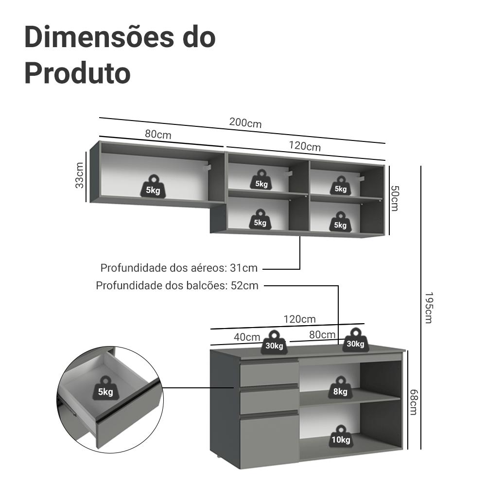 O Armário de Cozinha Nice Madesa foi desenvolvido para quem busca elegância, funcionalidade e um aproveitamento inteligente do espaço.Produzido com materiais de alta qualidade, inclui dobradiças metálicas duráveis, corrediças telescópicas para abertura total das gavetas e puxadores de alumínio.O espaço interno e externo do móvel é ótimo para louças, panelas, utensílios e eletroportáteis. Além disso, o formato suspenso facilita a limpeza e deixa a cozinha ainda mais estilosa.Para completar, o acabamento cinza de alta resistência segue as últimas tendências de decoração.Medidas totais:- 195 cm de altura- 200 cm de largura- 52 cm de profundidade nos balcões e 31 cm nos aéreosO que você recebe:- Um (1) Aéreo de 80 cm com uma (1) porta basculante- Um (1) Aéreo de 120 cm com duas (2) portas- Um (1) Balcão de 40 cm com três (3) gavetas e tampo- Um (1) Balcão de 80 cm com duas (2) portas e tampo- Manual e ferragensCódigo do produto: GRNC2000053BÉ bom saber:- Imagens meramente ilustrativas- A Madesa não disponibiliza serviço de montagem- A cozinha não acompanha pés, deve ser instalada de forma suspensa, com fixação na paredeA Madesa se dedica à sustentabilidade com várias iniciativas: temos uma usina própria para gerar energia que abastece uma de nossas fábricas. Selecionamos nossos fornecedores, priorizando aqueles que possuem um compromisso com a sustentabilidade e proteção do meio ambiente. Todo o plástico utilizado no setor produtivo é proveniente de reciclagem e as suas sobras são encaminhadas ao fornecedor que os recicla. Também investimos no desenvolvimento contínuo de nossos colaboradores e em ações educacionais que beneficiem a comunidade.