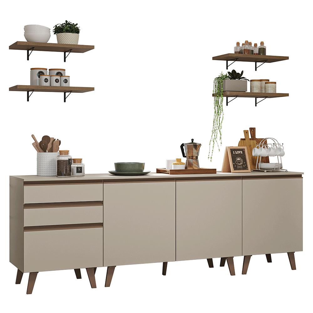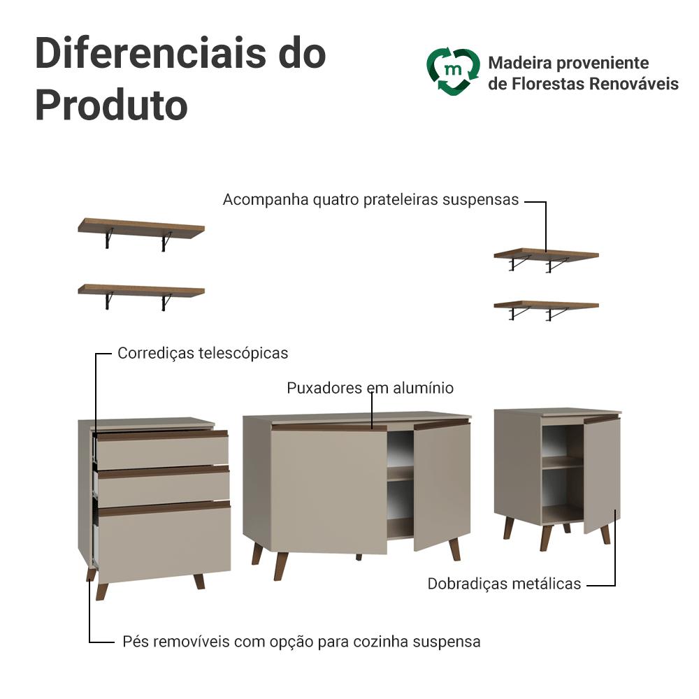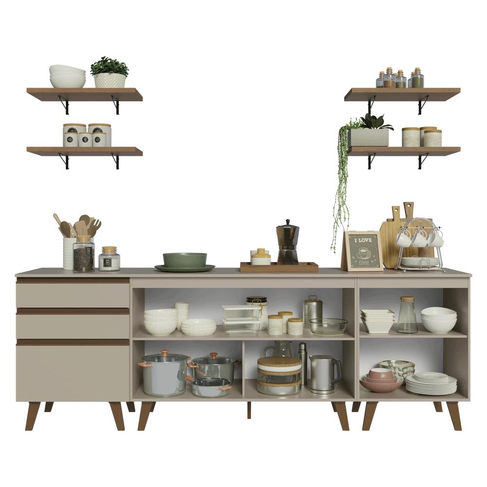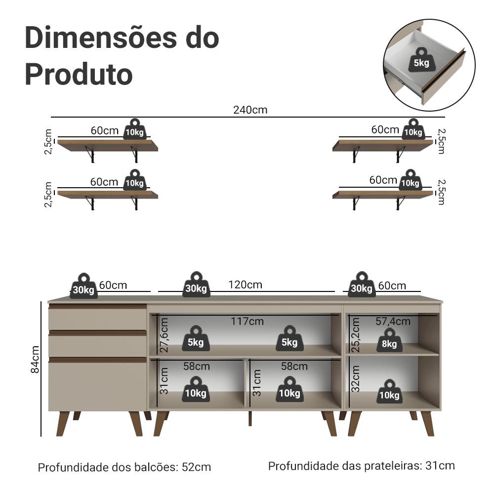 Uma cozinha funcional, moderna e pensada para deixar a rotina mais organizada.Composta por três balcões com ótimo espaço interno, ideais para organizar utensílios ou panelas. Na parte superior, conta com quatro prateleiras abertas, perfeitas para itens decorativos ou deixar objetos de uso frequente sempre à mão.Os módulos inferiores possuem pés, que garantem mais estabilidade. Os balcões já acompanham tampo, proporcionando ainda mais praticidade. O acabamento de alta resistência é no tom crema, os puxadores e os pés em bronze, reforçando o visual elegante. Além disso, possui corrediças que proporcionam abertura total das gavetas. Medidas totais:- 84 cm de altura- 240 cm de largura- 52 cm de profundidade nos balcões e 31 cm nas prateleirasInformações técnicas:- Material: MDP- Peso total suportado: 193 kg- Altura dos pés: 16cmO que você recebe:- Um Balcão de 120cm- Dois Balcões de 60cm- Quatro Prateleiras de 60cmCódigo do produto: GRNC2400017PÉ importante saber:- Imagens meramente ilustrativas, a decoração não acompanha o produto- A Madesa não disponibiliza serviço de montagem- O produto segue com manual de instalação e todas as ferragens necessárias para sua montagemA Madesa possui compromisso com a sustentabilidade. Geramos energia limpa em nossa própria usina, priorizamos fornecedores responsáveis e utilizamos plástico reciclado em nossa produção. Além disso, reinserimos sobras no ciclo de reciclagem e investimos no desenvolvimento de nossos colaboradores e da comunidade.Garantia: Este produto conta com 1 ano de garantia total, sendo 3 meses de garantia legal e 9 meses de garantia contratual. A garantia cobre exclusivamente defeitos de fabricação e vícios ocultos. Não estão cobertos: problemas decorrentes de montagem incorreta, uso inadequado, exposição à umidade, calor ou luz solar direta, modificações no produto ou desgaste natural.