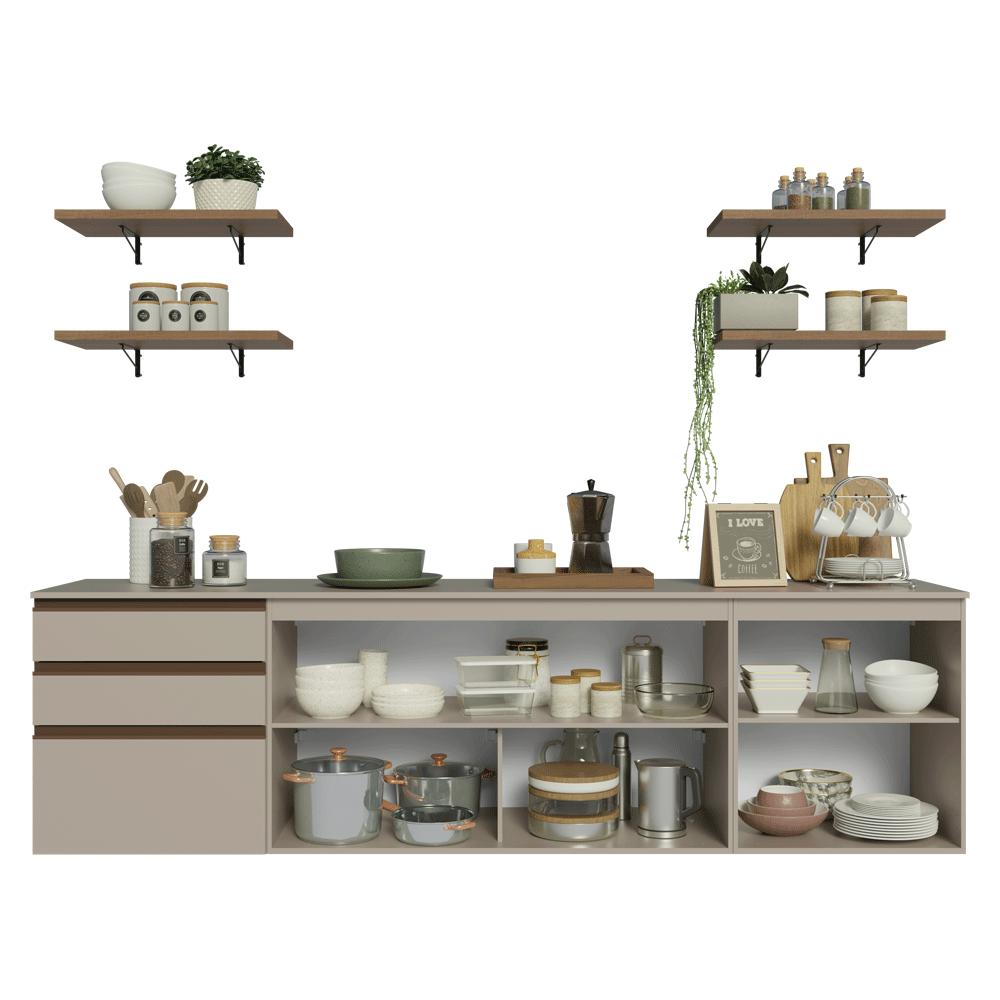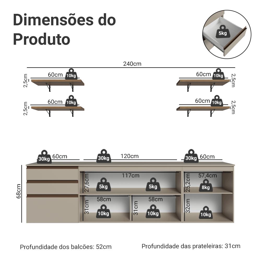 Uma cozinha funcional, moderna e pensada para deixar a rotina mais organizada.Composta por três balcões com ótimo espaço interno, ideais para organizar utensílios ou panelas. Na parte superior, conta com quatro prateleiras abertas, perfeitas para itens decorativos ou deixar objetos de uso frequente sempre à mão.A linha Nice se diferencia por ser suspensa, acompanhando ferragens para fixação. Os balcões já acompanham tampo, proporcionando ainda mais praticidade. O acabamento de alta resistência é no tom crema, os puxadores em bronze, reforçando o visual elegante. Além disso, possui corrediças que proporcionam abertura total das gavetas. Medidas totais:- 68 cm de altura- 240 cm de largura- 52 cm de profundidade nos balcões e 31 cm nas prateleirasInformações técnicas:- Material: MDP- Peso total suportado: 193 kgO que você recebe:- Um Balcão de 120cm- Dois Balcões de 60cm- Quatro Prateleiras de 60cmCódigo do produto: GRNC2400107PÉ importante saber:- Imagens meramente ilustrativas, a decoração não acompanha o produto- A Madesa não disponibiliza serviço de montagem- O produto segue com manual de instalação e todas as ferragens necessárias para sua montagemA Madesa possui compromisso com a sustentabilidade. Geramos energia limpa em nossa própria usina, priorizamos fornecedores responsáveis e utilizamos plástico reciclado em nossa produção. Além disso, reinserimos sobras no ciclo de reciclagem e investimos no desenvolvimento de nossos colaboradores e da comunidade.Garantia: Este produto conta com 1 ano de garantia total, sendo 3 meses de garantia legal e 9 meses de garantia contratual. A garantia cobre exclusivamente defeitos de fabricação e vícios ocultos. Não estão cobertos: problemas decorrentes de montagem incorreta, uso inadequado, exposição à umidade, calor ou luz solar direta, modificações no produto ou desgaste natural.