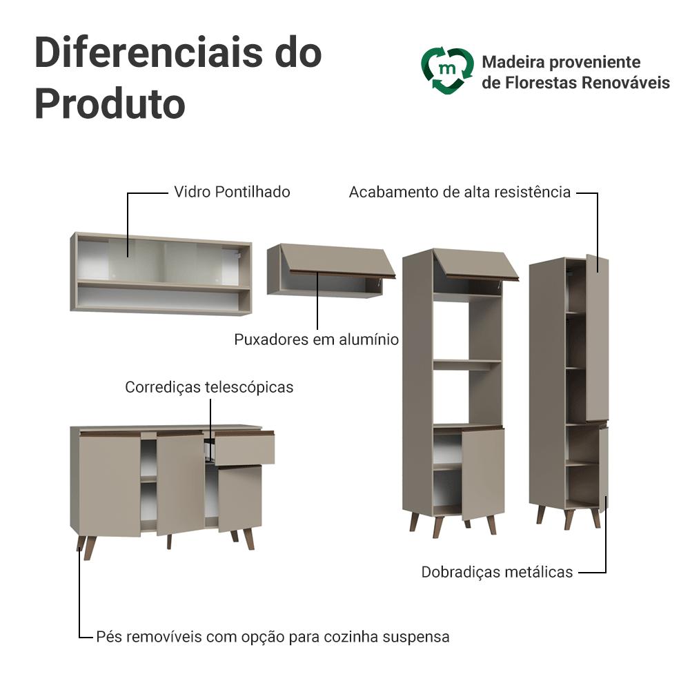 A Cozinha Completa Nice oferece praticidade, organização e um visual moderno.O destaque fica para o paneleiro com ótimo espaço interno, torre-quente para eletrodoméstico e para o armário aéreo com vidro pontilhado, para manter tudo em ordem.Os módulos inferiores possuem pés, que garantem mais estabilidade. Além disso, o balcão já acompanha tampo. O acabamento de alta resistência é no tom crema, os puxadores e os pés em bronze, reforçando o visual elegante. Possui corrediças que proporcionam abertura total das gavetas.Medidas totais:- 211 cm de altura- 300 cm de largura- 52 cm de profundidade nos balcões, paneleiro, torre-quente e 31 cm nos aéreosInformações técnicas:- Material: MDP- Peso total suportado: 206kg- Altura dos pés: 16cmO que você recebe:- Um Paneleiro de 40cm- Um Aéreo de 80cm- Um Aéreo de 120cm- Um Balcão de 120cmCódigo do produto: GRNC3000087PÉ importante saber:- Imagens meramente ilustrativas, a decoração não acompanha o produto- A Madesa não disponibiliza serviço de montagem- O produto segue com manual de instalação e todas as ferragens necessárias para sua montagemA Madesa possui compromisso com a sustentabilidade. Geramos energia limpa em nossa própria usina, priorizamos fornecedores responsáveis e utilizamos plástico reciclado em nossa produção. Além disso, reinserimos sobras no ciclo de reciclagem e investimos no desenvolvimento de nossos colaboradores e da comunidade.Garantia: Este produto conta com 1 ano de garantia total, sendo 3 meses de garantia legal e 9 meses de garantia contratual. A garantia cobre exclusivamente defeitos de fabricação e vícios ocultos. Não estão cobertos: problemas decorrentes de montagem incorreta, uso inadequado, exposição à umidade, calor ou luz solar direta, modificações no produto ou desgaste natural.