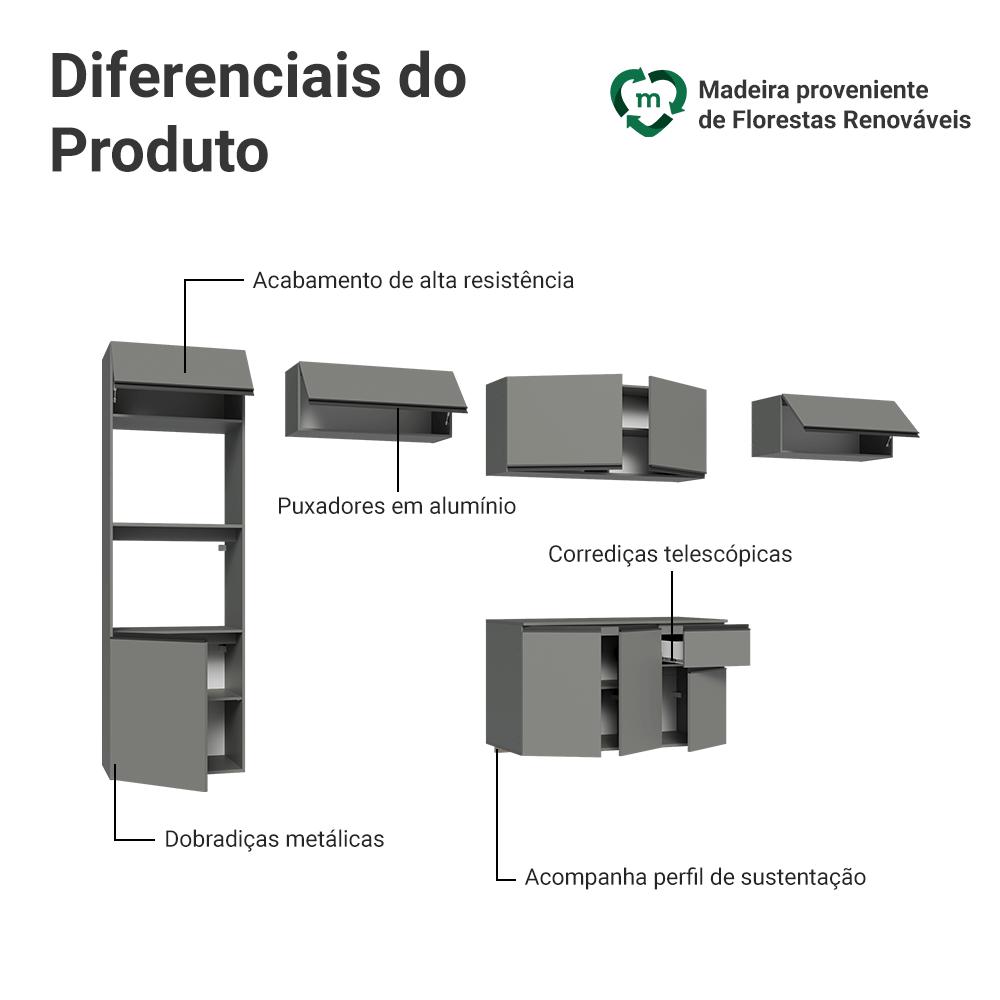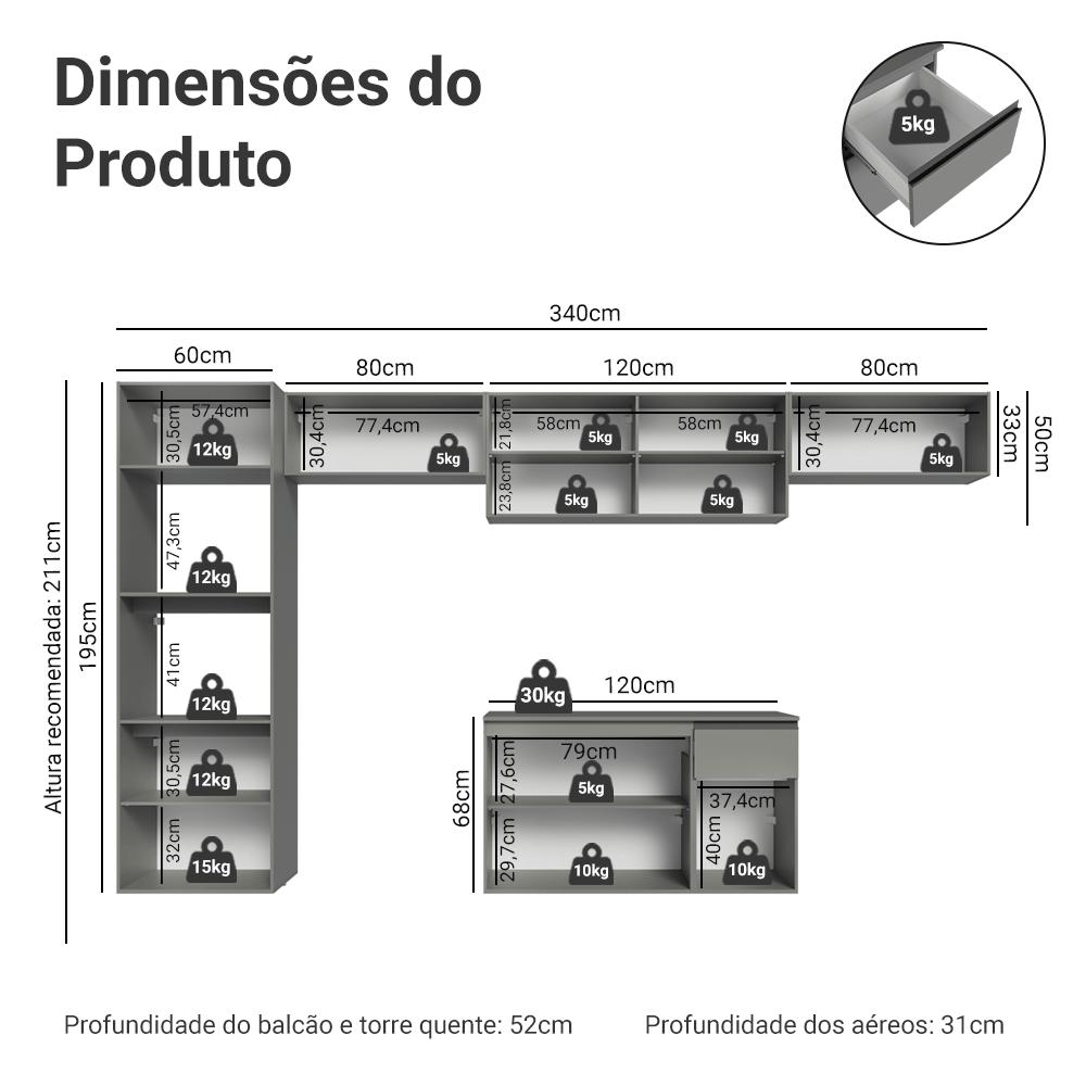 A Cozinha Completa da linha Nice é perfeita para quem deseja um ambiente moderno e organizado.A linha Nice se diferencia por ser suspensa, acompanhando ferragens para fixação. Entre os destaques, estão a torre quente e os armários aéreos com porta basculante. O acabamento de alta resistência no tom Cinza, os puxadores em alumínio reforçam o visual elegante. Possui corrediças que proporcionam abertura total das gavetas, e a porta basculante permanece suspensa durante o uso. Os balcões acompanham tampo, garantindo mais praticidade.Medidas totais:- 211 cm de altura- 340 cm de largura- 52 cm de profundidade nos balcões e torre quente e 31 cm nos aéreosInformações técnicas:- Material: MDP- Peso total suportado: 153 kgO que você recebe:- Uma Torre Quente de 60cm- Dois Aéreos de 80cm- Um Aéreo de 120cm- Um Balcão de 120cm com três portasCódigo do produto: GRNC3400023BÉ importante saber:- Imagens meramente ilustrativas, a decoração não acompanha o produto.- A Madesa não oferece serviço de montagem.- O produto segue com manual e todas as ferragens necessárias.A Madesa possui compromisso com a sustentabilidade. Geramos energia limpa em nossa própria usina, priorizamos fornecedores responsáveis e utilizamos plástico reciclado em nossa produção. Além disso, reinserimos sobras no ciclo de reciclagem e investimos no desenvolvimento de nossos colaboradores e da comunidade.Garantia: Este produto conta com 1 ano de garantia total, sendo 3 meses de garantia legal e 9 meses de garantia contratual. A garantia cobre exclusivamente defeitos de fabricação e vícios ocultos. Não estão cobertos: problemas decorrentes de montagem incorreta, uso inadequado, exposição à umidade, calor ou luz solar direta, modificações no produto ou desgaste natural.