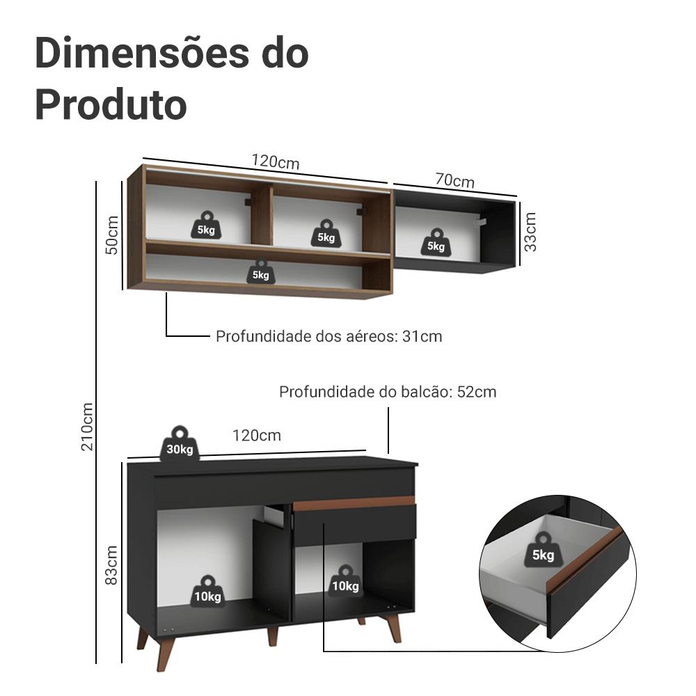 Modernidade, elegância e um toque retrô. Confira a Cozinha Compacta Reims da Madesa.Com três módulos avulsos, oferece materiais de alta qualidade, como corrediças e dobradiças metálicas, puxadores embutidos de alumínio e pés de madeira maciça. O vidro reflex no aéreo adiciona sofisticação ao ambiente.Seu espaço amplo permite organizar louças, panelas e utensílios com facilidade. O balcão conta com tampo em MDP, que pode ser removido para instalação de pia na medida 120 x 52 cm.O acabamento preto e amadeirado Rustic garante resistência e um visual refinado.Medidas totais:- 190 cm de largura- 210 cm de altura- 52 cm de profundidade no balcão e 31 cm nos aéreosItens inclusos:- Um (1) Armário Aéreo de 70 cm com uma (1) porta basculante- Um (1) Armário Aéreo de 120 cm com duas (2) portas de vidro reflex- Um (1) Balcão de 120 cm com duas (2) portas, uma (1) gaveta e tampoCódigo do produto: GRRM190006D8Obs.:- A Madesa não disponibiliza serviço de montagem- O produto segue com manual e todas as ferragens necessárias para a instalação- Imagens meramente ilustrativas, os eletros e as decorações não acompanham o produtoA Madesa se dedica à sustentabilidade com várias iniciativas: temos uma usina própria para gerar energia que abastece uma de nossas fábricas. Selecionamos nossos fornecedores, priorizando aqueles que possuem um compromisso com a sustentabilidade e proteção do meio ambiente. Todo o plástico utilizado no setor produtivo é proveniente de reciclagem e as suas sobras são encaminhadas ao fornecedor que os recicla. Também investimos no desenvolvimento contínuo de nossos colaboradores e em ações educacionais que beneficiem a comunidade.
