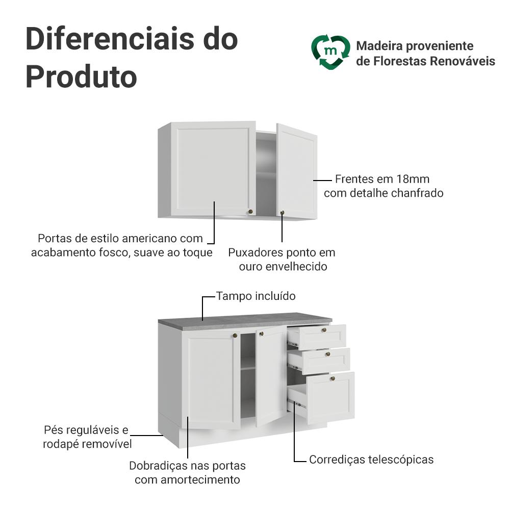 Com 120 cm de largura, a Cozinha Compacta da linha Vik oferece organização inteligente e um design elegante, ideal para transformar sua cozinha em um ambiente prático e cheio de estilo.O acabamento de alta resistência da estrutura e das frentes é em Branco, e possui uma textura suave ao toque. O destaque fica por conta dos puxadores ponto em ouro envelhecido, feitos com metal resistente, trazem personalidade e um charme único. Outro diferencial está no detalhe chanfrado das frentes, que forma molduras elegantes e dá profundidade ao design.A linha Vik é funcional em cada detalhe. As portas possuem dobradiças com amortecimento, garantindo um fechamento suave e silencioso, enquanto as gavetas permitem abertura total, para você organizar tudo com mais facilidade.Medidas:- 225 cm de altura- 120 cm de largura- 52 cm de profundidade nos balcões e 31cm nos aéreosO que você recebe:- Um Aéreo de 120 cm com duas portas - Um Balcão de 120 cm com duas portas e três gavetas (Acompanha o tampo)Código do produto: GRVK12000109É importante saber:- Material: MDP- Imagens meramente ilustrativas, a decoração não acompanha o produto- A Madesa não disponibiliza serviço de montagem- O produto segue com manual de instalação e todas as ferragens necessárias para sua montagemA Madesa se dedica à sustentabilidade com várias iniciativas: temos uma usina própria que gera energia para uma das fábricas. Priorizamos fornecedores responsáveis com o meio ambiente. Todo o plástico utilizado na produção é reciclado, e as sobras também são reaproveitadas. Investimos no desenvolvimento de nossos colaboradores e em ações que beneficiem a comunidade.