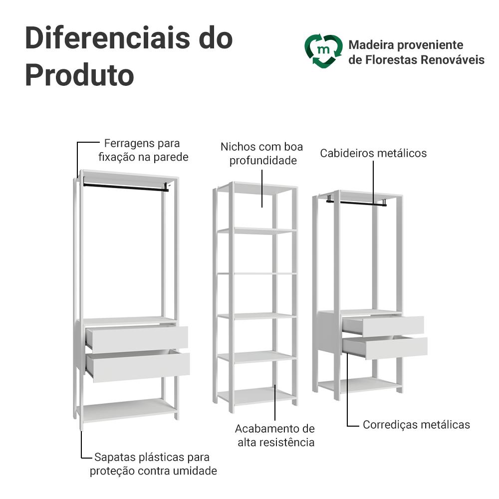 O Closet modulado Valencia une funcionalidade e um design moderno. Composto por três módulos abertos, ele oferece um layout inteligente que garante fácil acesso às roupas e acessórios, mantendo tudo à mão no dia a dia. Um dos módulos conta com cinco prateleiras amplas, enquanto os outros dois módulos de 70 cm de largura oferecem duas gavetas espaçosas, um cabideiro e uma prateira em cada, garantindo um espaço de armazenamento eficiente e organizado.Além disso, o móvel conta com acabamento branco de alta resistência, pés com sapatas plásticas que protegem contra a umidade e ferragens incluídas para a fição na parede, garantindo mais estabilidade e segurança.Medidas totais:- 180 cm de altura- 199 cm de largura- 45 cm de profundidadeO que você recebe: - Um Closet aberto de 59 cm de largura com cinco prateleiras- Dois Closets abertos de 70 cm de largura com duas gavetas, um cabideiro e uma prateleira em cadaCódigo do produto: MDDR03000209É importante saber:- Imagens meramente ilustrativas, a decoração não acompanha o produto.- A Madesa não oferece serviço de montagem.- O produto segue com manual e todas as ferragens necessárias para a instalação.- Por segurança, é obrigatório fir o móvel na parede.A Madesa se dedica à sustentabilidade com várias iniciativas: temos uma usina própria que gera energia para uma das fábricas. Priorizamos fornecedores responsáveis com o meio ambiente. Todo o plástico utilizado na produção é reciclado, e as sobras também são reaproveitadas. Investimos no desenvolvimento de nossos colaboradores e em ações que beneficiem a comunidade.