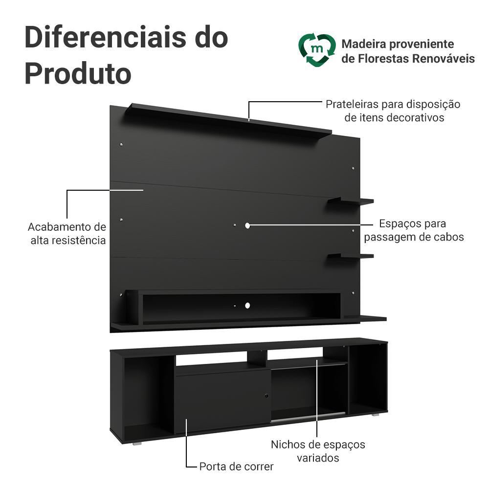 Com design moderno e composição funcional, o Conjunto de Rack e Painel para TV Cancun da Madesa valoriza o ambiente com praticidade no dia a dia.O Painel para TV comporta TVs de até 60 polegadas e conta com espaço para passagem de fios e cabos, ajudando a manter tudo organizado e com visual mais limpo. O Rack possui nichos de tamanhos variados, com espaços que facilitam a organizaçã, oferecendo melhor aproveitamento do espaço.O acabamento preto confere elegância e personalidade ao Conjunto, ideal para ambientes modernos.Medidas do Painel:- 135 cm de altura- 180 cm de largura- 32 cm de profundidadeMedidas do Rack:- 50 cm de altura- 180 cm de largura- 32 cm de profundidadeInformações técnicas:- Material: MDP- Peso total suportado: 116 kgO que você recebe:- Um Painel para TV de até 60 Polegadas- Um Rack de 180 cm de larguraCódigo do produto: MDES0200458NÉ importante saber:- Imagens meramente ilustrativas, a decoração não acompanha o produto.- A Madesa não oferece serviço de montagem- O produto segue com manual e todas as ferragens necessárias.A Madesa possui compromisso com a sustentabilidade. Geramos energia limpa em nossa própria usina, priorizamos fornecedores responsáveis e utilizamos plástico reciclado em nossa produção. Além disso, reinserimos sobras no ciclo de reciclagem e investimos no desenvolvimento de nossos colaboradores e da comunidade.Garantia: Este produto conta com 1 ano de garantia total, sendo 3 meses de garantia legal e 9 meses de garantia contratual. A garantia cobre exclusivamente defeitos de fabricação e vícios ocultos. Não estão cobertos: problemas decorrentes de montagem incorreta, uso inadequado, exposição à umidade, calor ou luz solar direta, modificações no produto ou desgaste natural.