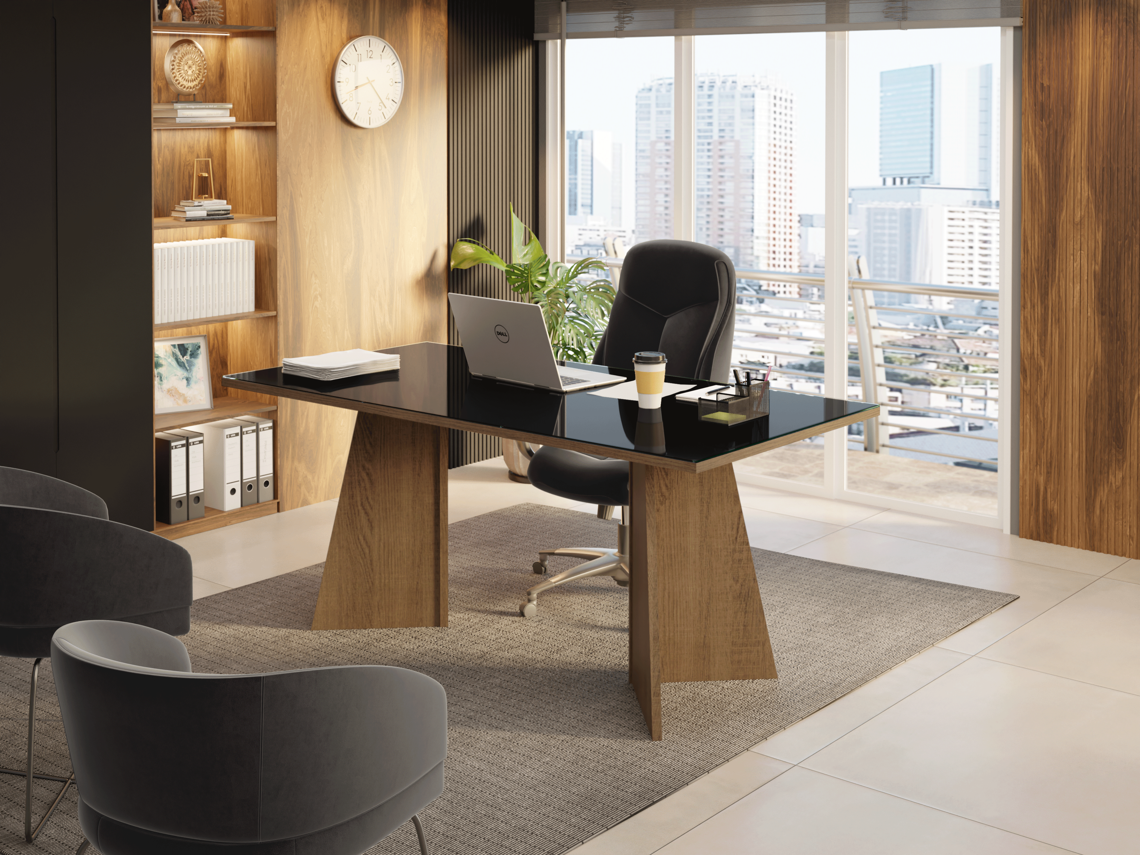 Desenvolvida para quem busca sofisticação e eficiência no ambiente corporativo. A Mesa oferece amplo espaço para acomodar computador, documentos e acessórios de trabalho, garantindo conforto e organização ao longo do dia.O tampo de vidro sobreposto confere um toque moderno e elegante, enquanto a base em formato trapézio proporciona firmeza e design diferenciado. A combinação perfeita entre funcionalidade e estilo, ideal para escritórios de diretoria ou presidência que valorizam ambientes profissionais.O acabamento da mesa combina o tom amadeirado Rustic com o tampo em Preto, realçando um visual moderno e imponente. Com design sofisticado e estrutura resistente, é a escolha ideal para quem busca unir estilo, funcionalidade e durabilidade em um só móvel.Medidas totais:- 78 cm de altura- 180 cm de largura- 90 cm de profundidadeO que você recebe- Uma mesa de Escritório com tampo em MDP e Vidro sobrepostoCódigo do produto: MDFC010011D8É importante saber:- Material: MDP- Imagens meramente ilustrativas, a decoração não acompanha o produto- A Madesa não disponibiliza serviço de montagem- O produto segue com manual de instalação e todas as ferragens necessárias para sua montagemA Madesa se dedica à sustentabilidade com várias iniciativas: temos uma usina própria que gera energia para uma das fábricas. Priorizamos fornecedores responsáveis com o meio ambiente. Todo o plástico utilizado na produção é reciclado, e as sobras também são reaproveitadas. Investimos no desenvolvimento de nossos colaboradores e em ações que beneficiem a comunidade.