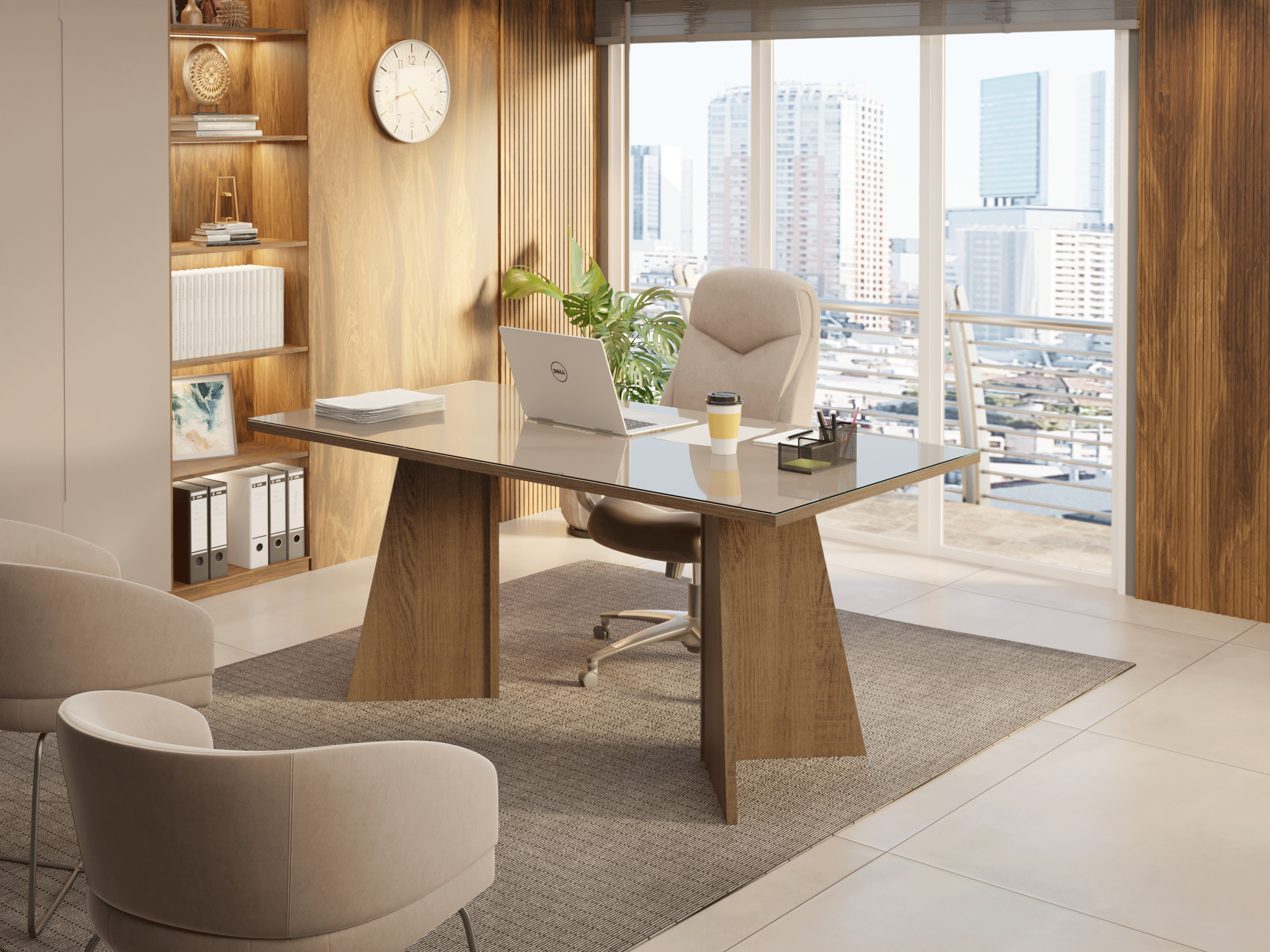 Desenvolvida para quem busca sofisticação e eficiência no ambiente corporativo. A Mesa oferece amplo espaço para acomodar computador, documentos e acessórios de trabalho, garantindo conforto e organização ao longo do dia.O tampo de vidro sobreposto confere um toque moderno e elegante, enquanto a base em formato trapézio proporciona firmeza e design diferenciado. A combinação perfeita entre funcionalidade e estilo, ideal para escritórios de diretoria ou presidência que valorizam ambientes profissionais.O acabamento une o tom amadeirado Rustic com o tom Crema, criando um contraste sofisticado e atemporal. Com design marcante e estrutura resistente, é o móvel perfeito para transmitir elegância em qualquer espaço corporativo.Medidas totais:- 78 cm de altura- 180 cm de largura- 90 cm de profundidadeO que você recebe- Uma mesa de Escritório com tampo em MDP e Vidro sobrepostoCódigo do produto: MDFC010011J8É importante saber:- Material: MDP- Imagens meramente ilustrativas, a decoração não acompanha o produto- A Madesa não disponibiliza serviço de montagem- O produto segue com manual de instalação e todas as ferragens necessárias para sua montagemA Madesa se dedica à sustentabilidade com várias iniciativas: temos uma usina própria que gera energia para uma das fábricas. Priorizamos fornecedores responsáveis com o meio ambiente. Todo o plástico utilizado na produção é reciclado, e as sobras também são reaproveitadas. Investimos no desenvolvimento de nossos colaboradores e em ações que beneficiem a comunidade.