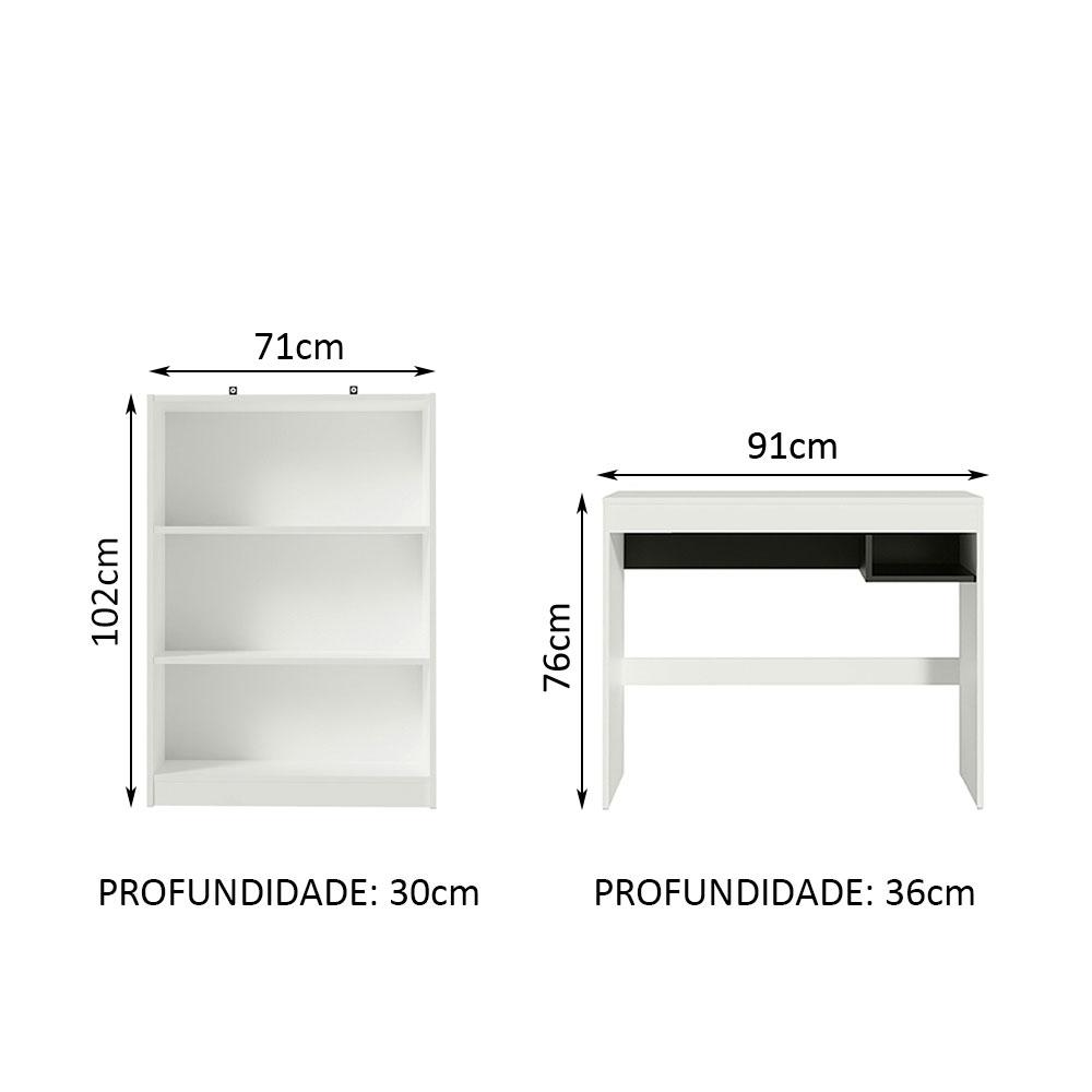 Um conjunto perfeito para renovar o seu ambiente de estudos ou trabalho. Este é o kit da Escrivaninha Rubi + Estante Livreiro 6907 da Madesa.Compacta e na medida certa, a Escrivaninha Rubi conta com tampo de madeira e um nicho na parte inferior além de acabamento frontal e traseiro para garantir melhor fixação e firmeza. Pode ser utilizada como escrivaninha ou mesa para notebook.A Estante conta com três nichos com ótimo espaço e distribuição. É ótima para organizar os seus materiais, como livros, revistas e objetos decorativos. Fabricada em MDP com ótima espessura, possui suportes de fixação na parte superior, que proporcionam maior segurança.O acabamento da estante é branco e a escrivaninha combina os tons branco e preto. É feito em Pintura Poliéster de alta resistência, método que oferece mais proteção ao móvel e é totalmente ecológico.Medidas totais da escrivaninha: 76 cm de altura x 91 cm de largura x 36 cm de profundidade.Medidas totais da estante: 102 cm de altura x 71 cm largura x 30 cm de profundidade.Imagens meramente ilustrativas. A decoração não acompanha o produto.Itens inclusos:- Uma (1) Escrivaninha com um (1) nicho- Uma (1) Estante com três (3) nichosCódigo do produto: MDFC0200107309Obs.: A Madesa não disponibiliza serviço de montagem. O produto segue com manual de instalação e todas as ferragens necessárias para a instalação.1 – O produto é novo ou usado?R.: Todos os produtos da Madesa são novos, enviados da nossa fábrica diretamente para as casas de nossos clientes.2 – O produto vem montado? Se não, vocês realizam a montagem?R.: A Madesa não disponibiliza serviço de montagem. Todos os produtos seguem com manual de instalação e as ferragens necessárias. Alguns produtos possuem vídeo explicando o passo a passo da montagem.3 – Vocês possuem loja física? Posso retirar meu produto em mãos?R.: Não possuímos loja física, apenas loja virtual. Confira as opções de envio ao colocar o seu CEP.4 – Qual é o valor do envio? Posso pagar separadamente?R.: O valor do envio é calculado com base no peso e volume do produto, e no CEP de destino. Você pode calcular o valor e prazo de entrega no simulador.5 – A Madesa entrega em todo Brasil? Como é feita a entrega?R.: Sim, entregamos no Brasil inteiro através de transportadoras parceiras.6 – O produto acompanha Nota Fiscal?R.: Sim, todos os produtos são entregues com suas respectivas notas fiscais.7 – Os produtos possuem garantia?R.: Sim. A Madesa oferece 3 meses de garantia para defeitos de fabricação.A Madesa se dedica à sustentabilidade com várias iniciativas: temos uma usina própria para gerar energia que abastece uma de nossas fábricas. Selecionamos nossos fornecedores, priorizando aqueles que possuem um compromisso com a sustentabilidade e proteção do meio ambiente. Todo o plástico utilizado no setor produtivo é proveniente de reciclagem e as suas sobras são encaminhadas ao fornecedor que os recicla. Também investimos no desenvolvimento contínuo de nossos colaboradores e em ações educacionais que beneficiem a comunidade.