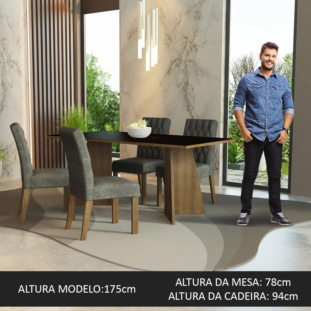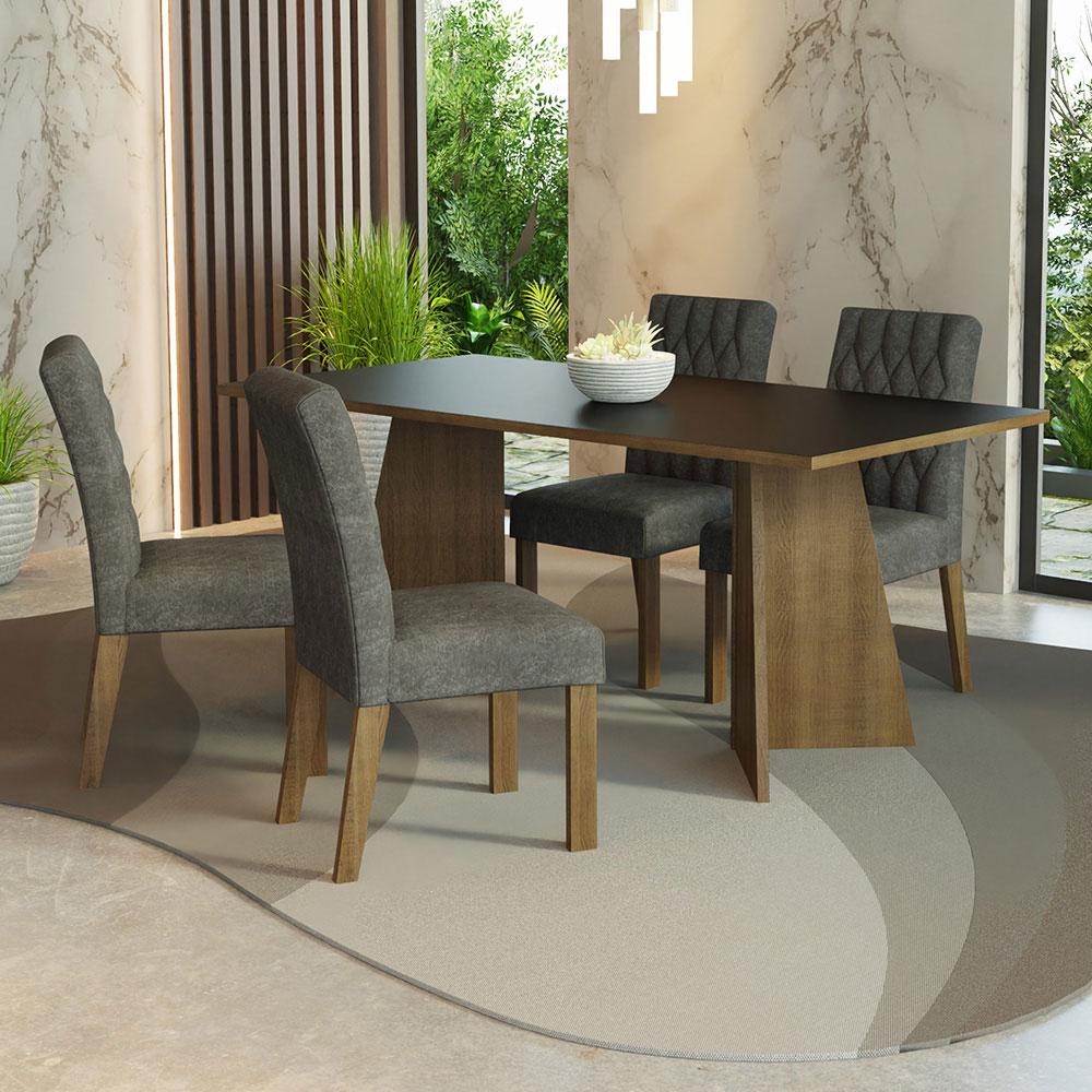Descubra o Conjunto de Jantar Ruby da Madesa, uma perfeita para renovar sua cozinha ou sala de jantar com a qualidade que você merece.A mesa se destaca por seu estilo inovador e elegante, contando com tampo em MDP com amplo espaço e um visual arrojado.As cadeiras complementam o conjunto com muito conforto. Com estrutura em MDP e MDF, possuem estofamento em espuma de alta densidade, revestido em tecido Suede Silver e uma costura especial no estilo matelassê.O acabamento combina os tons preto e amadeirado Rustic. É aplicado em Pintura Poliéster ecológica, garantindo resistência a álcool, água e calor.Medidas da cadeira: - 94 cm de altura- 45 cm de largura- 57 cm de profundidadeMedidas da mesa: - 78 cm de altura- 180 cm de largura- 90 cm de profundidadeO que você recebe: - Uma (1) Mesa com tampo de MDP- Quatro (4) Cadeiras com assento e encosto estofados- Manual e ferragens necessárias para a instalaçãoCódigo do produto: MDJA040194D8SLÉ bom saber: - Imagens meramente ilustrativas- A Madesa não oferece serviço de montagemA Madesa se dedica à sustentabilidade com várias iniciativas: temos uma usina própria para gerar energia que abastece uma de nossas fábricas. Selecionamos nossos fornecedores, priorizando aqueles que possuem um compromisso com a sustentabilidade e proteção do meio ambiente. Todo o plástico utilizado no setor produtivo é proveniente de reciclagem e as suas sobras são encaminhadas ao fornecedor que os recicla. Também investimos no desenvolvimento contínuo de nossos colaboradores e em ações educacionais que beneficiem a comunidade.