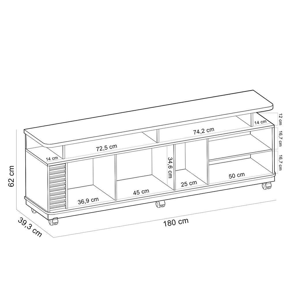Rack Para Sala De Estar 75 Pol Com Rodízios Laguna C04 Amêndoa Hortelã - Lyam DecorTransforme o seu ambiente com estilo e funcionalidade com o Rack para Sala De Estar 75 Pol com Rodízios Laguna C04 Amêndoa Hortelã, da Lyam Decor.Com um design contemporâneo e elegante, esse rack para sala é uma peça com detalhes que deixarão o seu ambiente lindo como nunca, a começar pelos apliques decorativos em forma de ripas e pela porta usinada com acabamento curvo. Já o tampo de 25mm garante resistência e , além do espaço amplo para TVs de até 75 polegadas, enquanto a prateleira, os nichos e as duas portas de abrir oferecem praticidade para aparelhos eletrônicos e decorações. Para completar, os 6 rodízios são responsáveis pela versatilidade e facilidade na movimentação do rack, a fim de deixar a sua rotina mais prática. Demais não é mesmo?! Então, aproveite e garanta agora mesmo o seu Rack Laguna e crie uma sala de estar moderna e funcional. Dimensões do produto (L x A x P) 180 x 62 x 39 cm. Características: Estrutura em produzida em MDP 25mm, MDP 15mm, MDF 25mm, MDF 15mm, HDF 3mm. Acabamento em pintura UV fosco. Suporta de até 75 polegadas. Peso máximo suportado 61 kg distribuídos. 02 portas de giro e dobradiças metálicas. 01 prateleira e 05 nichos para dispositivos eletrônicos e itens decorativos. Tampo, base e 01 porta com cantos curvos. Aplique ripado decorativo. 06 rodízios para mais versatilidade. - Produto entregue desmontado, acompanha manual de montagem. Sistema de montagem: Girofix, Cavilhas, Cantoneiras e Parafusos. - Este produto deve ser limpo com pano macio e seco. Não utilize produtos abrasivos como álcool e detergente, assim como esponjas rígidas ou palha de aço. - Proteja a superfície do móvel de objetos que transmitam calor ou umidade. Observações importantes: - Produto para uso residencial em ambiente interno, não devendo ficar exposto diretamente ao sol, calor e umidade excessivos. - Pode haver alguma diferença de tonalidade entre a imagem e o produto real, por conta do tratamento de imagens e a calibração de cores do seu monitor. - As imagens são meramente ilustrativas, não acompanham objetos de decoração e eletrônicos. - Ao receber a mercadoria, o cliente deve verificar as condições da embalagem, caso haja alguma não assine o de . - Montagem, desmontagem e outras instalações serão de responsabilidade do cliente. Não nos responsabilizamos, no ato da , por subir escadas/elevadores ou pelo por guincho em apartamentos. Eventuais despesas são de responsabilidade do comprador. - Confira as dimensões do produto e certifique-se de que passará normalmente por supostos elevadores, portas, escadas e/ou corredores de sua residência. Altura: 62 cm | Color: Amendoa Hortela | ColorFamily: Amêndoa | ColorSimple: Amêndoa | ColorSupplier: Amendoa Hortela | Com compartimento para alto-falantes: Não | Com rodas: Sim | Cor: Amendoa Hortela | Formato do móvel: Rack | Largura: 180 cm | Material: MDPMDF | Material da estrutura: MDPMDF | MaterialFamily: MDPMDF | Model: Laguna | OriginCountry: | OriginState: PR | ProductContents: 01 Rack | ProductHeight: 62 cm | ProductInstructions: Produto para uso em ambiente interno, nao devendo ficar exposto ao sol, calor e umidade excessivos. | ProductLength: 39 cm | ProductWarranty: 90 dias após o do produto | ProductWeight: 43 kg | ProductWidth: 180 cm | Profundidade: 39 cm | Quantidade de portas: 2 | Quantidade de prateleiras: 1 | Requer montagem: Sim | SizeDescription: Altura: 62 cm x Largura: 180 cm x Profundidade: 39 cm | SupplierSimpleName: Rack para Sala De Estar 75 Pol com Rodízios Júlia C04 Amêndoa Hortelã - Lyam Decor | Tamanho máximo de : 75 Polegadas