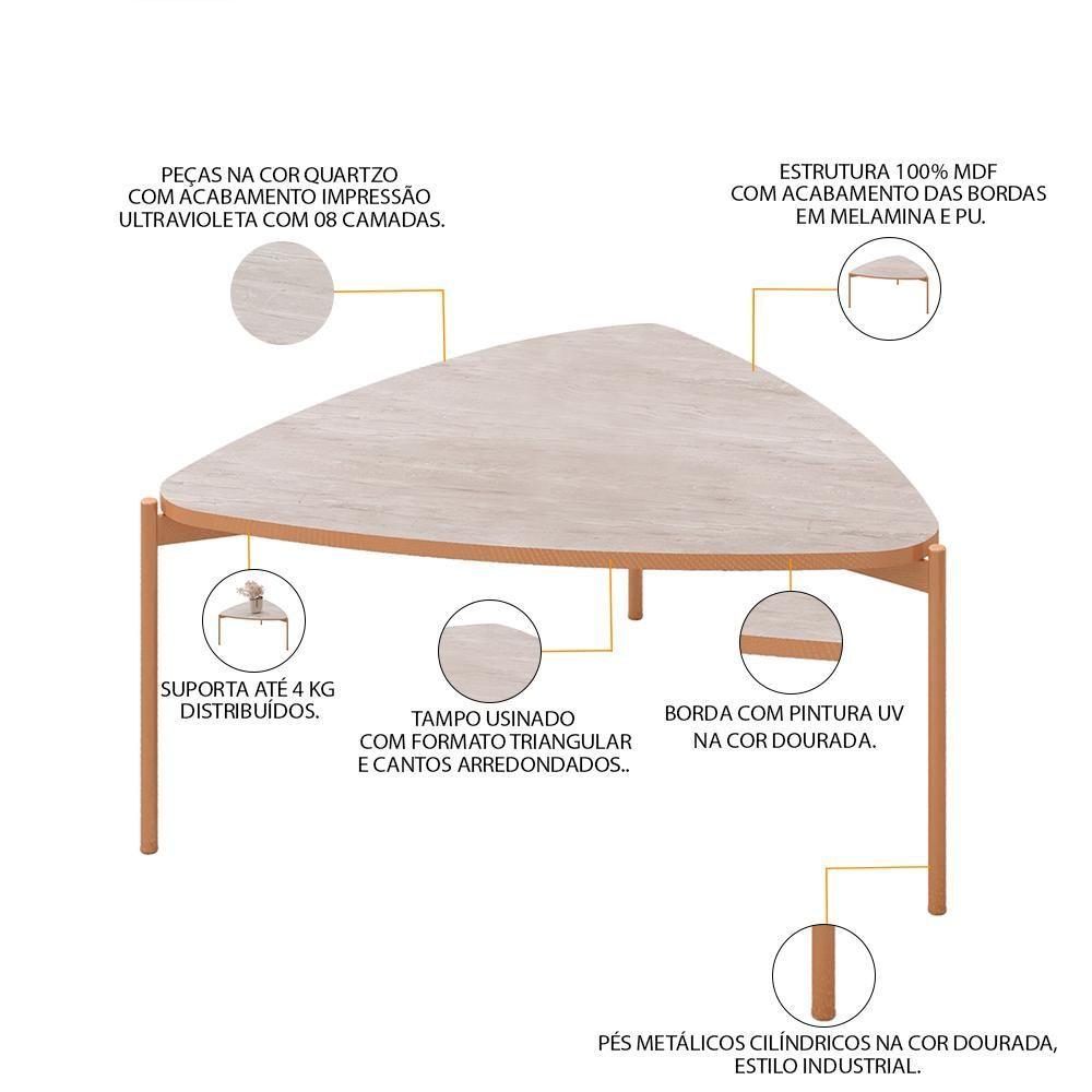 Kit Mesa De Centro Redonda Ellie E Mesa De Centro Trina D05 Off White Quartzo - Lyam DecorTenha uma sua sala de estar que seja um verdadeiro espetáculo de estilo com o exclusivo Kit Mesa de Centro Redonda Ellie e Mesa de Centro Trina D05 Off White Quartzo, da Lyam Decor!Composto por uma mesa de centro triangular e uma mesa de centro redonda, esse conjunto une a robustez do estilo industrial aos encantos de um design orgânico. Os pés metálicos conferem um toque contemporâneo, enquanto os cantos arredondados trazem suavidade e aconchego ao ambiente. Seja para receber amigos, desfrutar de um café ou simplesmente relaxar, essas mesas são perfeitas para qualquer ocasião. Seu formato inovador permite combinações criativas, otimizando o espaço e adicionando uma dose de personalidade à sua decoração. Deixe sua sala de estar mais convidativa e cheia de charme com esse kit que une funcionalidade e beleza. Dê o primeiro passo para um ambiente dos sonhos! Adicione ao seu carrinho! Dimensões da Mesa de Centro Trina (L x A x P) 76,5 x 33,5 x 72,5 cm. Características Mesa de Centro Trina: Estrutura 100% MDF com acabamento das bordas em Melamina e PU completo. Peças na cor Off White e Quartzo com impressão ultravioleta com 8 camadas de proteção. Tampo usinado com formato triangular e cantos arredondados. Suporta até 4 kg distribuídos. Pés metálicos cilíndricos na cor dourada, estilo industrial. Borda com pintura UV na cor dourada. Dimensões da Mesa de Centro Ellie (L x A x P) 69 x 36,5 x 69 cm. Características Mesa de Centro Ellie: Estrutura 100% MDF com acabamento das bordas em Melamina e PU completo. Peças na cor Off White com impressão ultravioleta e acabamento alto brilho, com 8 camadas de proteção. Tampo usinado com formato redondo e cantos arredondados. Suporta até 4 kg distribuídos. Pés metálicos cilíndricos na cor dourada, estilo industrial. Borda com pintura UV na cor dourada. - Produtos entregue desmontados, acompanha manual de montagem. Sistema de montagem: Parafusos. - Este produto deve ser limpo com pano macio e seco. Não utilize produtos abrasivos como álcool e detergente, assim como esponjas rígidas ou palha de aço. - Proteja a superfície do móvel de objetos que transmitam calor ou umidade. Observações importantes: - Produto para uso residencial em ambiente interno, não devendo ficar exposto diretamente ao sol, calor e umidade excessivos. - Pode haver alguma diferença de tonalidade entre a imagem e o produto real, por conta do tratamento de imagens e a calibração de cores do seu monitor. - As imagens são meramente ilustrativas, não acompanham objetos de decoração e eletrônicos. - Ao receber a mercadoria, o cliente deve verificar as condições da embalagem, caso haja alguma não assine o de . - Montagem, desmontagem e outras instalações serão de responsabilidade do cliente. Não nos responsabilizamos, no ato da , por subir escadas/elevadores ou pelo por guincho em apartamentos. Eventuais despesas são de responsabilidade do comprador. - Confira as dimensões do produto e certifique-se de que passará normalmente por supostos elevadores, portas, escadas e/ou corredores de sua residência. Altura: 24 cm | Color: Branco | ColorFamily: Branco | ColorSimple: Branco | ColorSupplier: Off White Quartzo | Cor: Off White Quartzo | Diâmetro: -1 | É adequada para exterior: Sim | É dobrável: Não | Forma: -1 | Formato de venda: Kit | Inclui acessórios de montagem da mesa: Não | Inclui manual de montagem: Sim | Largura: 78 cm | Material: Estrutura 100% MDF com acabamento das bordas em Melamina e PU completo. | MaterialFamily: Madeira | Model: Ellie & Trina | OriginCountry: | OriginState: PR | Peso: 10 kg | ProductContents: 02 Mesa | ProductHeight: 24 cm | ProductInstructions: Produto para uso em ambiente interno, nao devendo ficar exposto ao sol, calor e umidade excessivos. | ProductLength: 78 cm | ProductWarranty: 90 dias após o do produto | ProductWeight: 10 kg | ProductWidth: 78 cm | Requer montagem: Sim | SizeDescription: Altura: 24 cm x Largura: 78 cm x Profundidade: 78 cm | SupplierSimpleName: Kit Mesa de Centro Redonda Ellie e Mesa de Centro Trina D05 Off White Quartzo - Lyam Decor