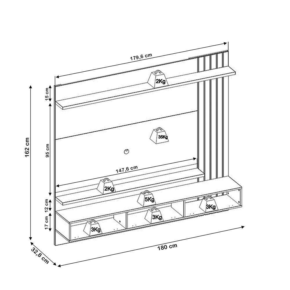 Painel Para Tv 70 Pol Com Bancada Suspensa 180cm Will C04 Off White Matte Freijó - Lyam DecorDesenvolvido para adicionar estilo e praticidade na sua sala de estar, o Painel Para TV Will, da Lyam Decor, é a opção certa para pessoas com gosto exigente.Além do quesito estético, com linhas retas, design minimalista e o toque moderno do ripado, esse painel suspenso também conta com prateleiras para dispor itens decorativos e, ainda, três portas espaçosas para armazenar os mais diversos objetos. Assim, deixar a bancada suspensa livre de bagunças nunca foi tão fácil. Ah, o painel para TV suporta aparelhos de até 70 polegadas e o passa-fios garante a organização dos cabos na parte traseira. Para finalizar, é um painel com bancada ideal para sala de estar pequena, já que permite fluidez ao ambiente, ao passo que garante um ar moderno e aconchegante. Aproveite e adicione agora mesmo ao seu carrinho! Dimensões total do produto (L x A x P) 180 x 162 x 32,8 cm Medidas Internas Espaço livre para TV (L x A): 180 x 95 cm Altura entre a prateleira e as portas: 12 cm Largura da prateleira inferior: 147,6 cm Características: Estrutura em MDP 25mm, 15mm e 12mm. Peças na cor Off White Matte e Freijó com acabamento em pintura UV fosco. Ideal para TV de até 70 polegadas. 03 Portas basculantes com dobradiças metálicas. 02 Prateleiras para itens decorativos. Painel com detalhe ripado na lateral. Acompanha passa fios, para melhor organização. Suporta até 48 kg distribuídos. - Produto entregue desmontado, acompanha manual de montagem. Sistema de montagem: Cavilhas, parafusos, girofix. - Este produto deve ser limpo com pano macio e seco. Não utilize produtos abrasivos como álcool e detergente, assim como esponjas rígidas ou palha de aço. - Proteja a superfície do móvel de objetos que transmitam calor ou umidade. Observações importantes: - Produto para uso residencial em ambiente interno, não devendo ficar exposto diretamente ao sol, calor e umidade excessivos. - Pode haver alguma diferença de tonalidade entre a imagem e o produto real, por conta do tratamento de imagens e a calibração de cores do seu monitor. - As imagens são meramente ilustrativas, não acompanham objetos de decoração e eletrônicos. - Ao receber a mercadoria, o cliente deve verificar as condições da embalagem, caso haja alguma não assine o comprovante de recebimento. - Montagem, desmontagem e outras instalações serão de responsabilidade do cliente. Não nos responsabilizamos, no ato da , por subir escadas/elevadores ou pelo transporte por guincho em apartamentos. Eventuais despesas são de responsabilidade do comprador. - Confira as dimensões do produto e certifique-se de que passará normalmente por supostos elevadores, portas, escadas e/ou corredores de sua residência. Altura: 162 cm | Color: OFF WHITE | ColorFamily: Off White | ColorSimple: Off White | ColorSupplier: Off White Matte Freijó | Com compartimento para alto-falantes: Não | Com rodas: Não | Cor: Off White Matte Freijó | Formato do móvel: Painel Suspenso | Largura: 180 cm | Materiais do corpo: MDP | Material: MDP | Material da estrutura: MDP | Material das corrediças: na | MaterialFamily: MDP | Model: Will | OriginCountry: Brasil | OriginState: PR | Peso: 57 Kg | ProductContents: 01 Painel | ProductHeight: 162 cm | ProductInstructions: Produto para uso em ambiente interno, nao devendo ficar exposto ao sol, calor e umidade excessivos. | ProductLength: 33 cm | ProductWarranty: 90 dias após o recebimento do produto | ProductWeight: 57 kg | ProductWidth: 180 cm | Profundidade: 33 cm | Quantidade de portas: 3 | Quantidade de prateleiras: 2 | Requer montagem: Sim | SizeDescription: Altura: 162 cm x Largura: 180 cm x Profundidade: 33 cm | SupplierSimpleName: Painel Para TV 70 Pol com Bancada Suspensa 180cm Will C04 Off White Matte Freijó - Lyam Decor | Tamanho máximo de TV: 70 Polegadas