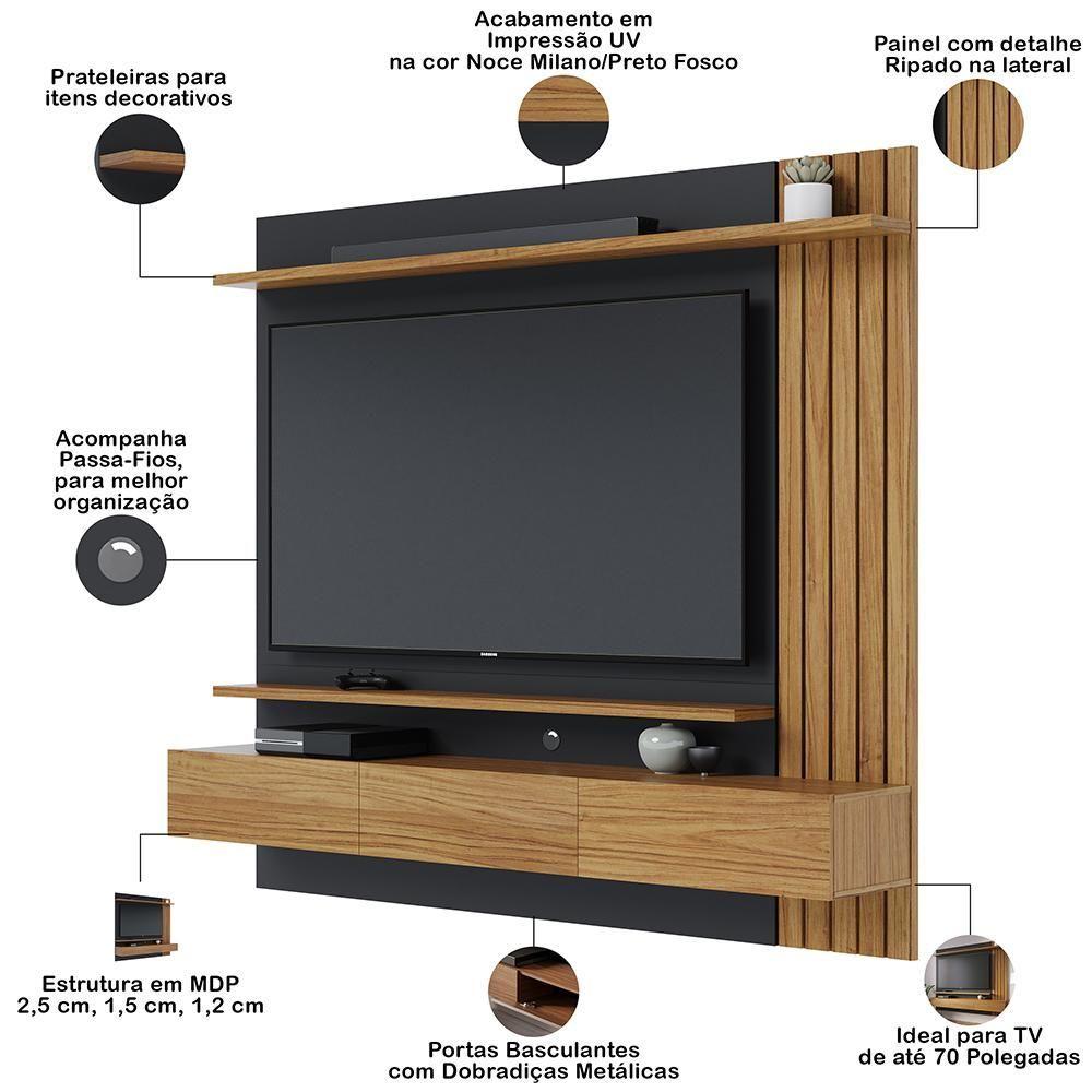 Painel Para Tv 70 Pol Com Bancada Suspensa 180cm Will C04 Noce Milano Preto Fosco - Lyam Decor