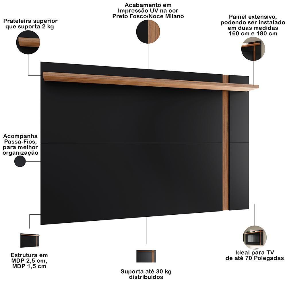 Painel Para Tv 70 Pol Extensível 180cm Lara C04 Preto Fosco Noce Milano - Lyam Decor