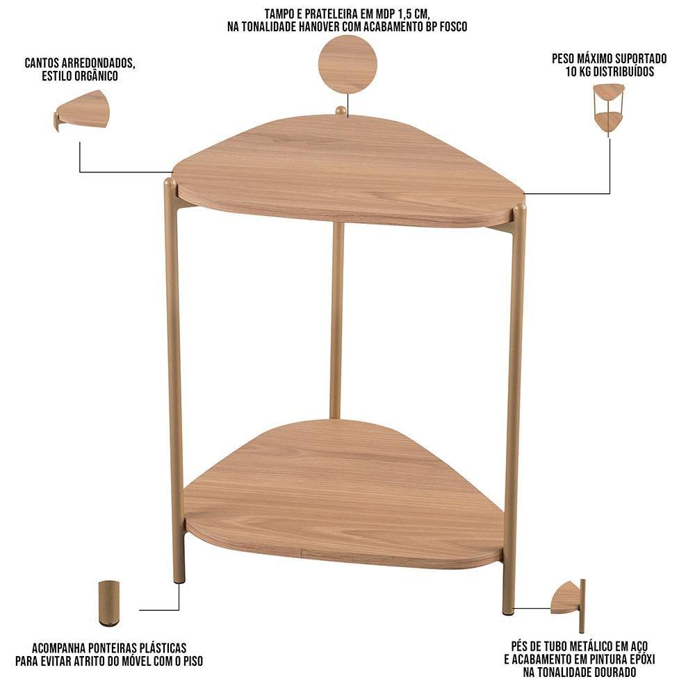 Mesa Lateral Para Sala De Estar Pés Metálicos Adek A03 Hanover Dourado - Lyam DecorEleve seu espaço com a Mesa Lateral Adek, da Lyam Decor, uma peça que combina a ousadia do estilo industrial com a suavidade do design orgânico. Ideal para quem busca funcionalidade sem abrir mão da estética, essa mesa lateral é perfeita para completar sua decoração com um toque de sofisticação.Com pés metálicos que garantem estabilidade e estilo, o tampo arredondado traz uma sensação de fluidez e leveza, fazendo dela uma opção encantadora para qualquer ambiente. Coloque-a ao lado do sofá, no canto da sala ou até mesmo como apoio no quarto; sua versatilidade permite que você a adapte a várias configurações. Em outras palavras, essa mesa de apoio é mais do que um simples suporte, ela é um convite à organização de pequenos objetos que fazem parte do seu dia a dia, como suas leituras atuais, enquanto aprecia aquela xícara de café que você adora. Ao escolher a mesa lateral Adek, você acrescenta um charme irresistível e prático à sua casa, onde cada detalhe faz a diferença. Dimensões da Mesa Lateral (L x A x P) 44,2 x 53,8 x 41 cm Características da Mesa Lateral: Tampo e prateleira em MDP 15mm, na tonalidade Hanover com acabamento BP fosco. Pés de tubo metálico em aço e acabamento em pintura epóxi na tonalidade Dourado. Acompanha ponteiras plásticas para evitar atrito do móvel com o piso. Cantos arredondados, estilo orgânico. Peso máximo suportado 10 kg distribuídos. - A limpeza deve ser feita com pano levemente umedecido em água limpa, sem esfregar, não utilizar produtos abrasivos, desengordurantes, álcool ou solvente. Observações importantes: - Produto para uso residencial em ambiente interno, não devendo ficar exposto diretamente ao sol, calor e umidade excessivos. - Pode haver alguma diferença de tonalidade entre a imagem e o produto real, por conta do tratamento de imagens e a calibração de cores do seu monitor. - As imagens são meramente ilustrativas, não acompanham objetos de decoração e eletrônicos. - Ao receber a mercadoria, o cliente deve verificar as condições da embalagem, caso haja alguma não assine o comprovante de recebimento. - Montagem, desmontagem e outras instalações serão de responsabilidade do cliente. Não nos responsabilizamos, no ato da , por subir escadas/elevadores ou pelo transporte por guincho em apartamentos. Eventuais despesas são de responsabilidade do comprador. - Confira as dimensões do produto e certifique-se de que passará normalmente por supostos elevadores, portas, escadas e/ou corredores de sua residência. Altura: 54 cm | Color: Marrom Claro | ColorFamily: Marrom Claro | ColorSimple: Marrom Claro | ColorSupplier: Hanover Dourado | Cor: Hanover Dourado | Diâmetro: na | É adequada para exterior: Não | É dobrável: Não | Forma: Orgânico | Formato de venda: Unitário | Inclui acessórios de montagem da mesa: Sim | Inclui manual de montagem: Sim | Largura: 44 cm | Material: Madeira Maciça, MDP | MaterialFamily: MDP | Model: Adek | OriginCountry: Brasil | OriginState: PR | Peso: 4 kg | ProductContents: 01 Mesa Lateral | ProductHeight: 54 cm | ProductInstructions: Produto para uso em ambiente interno, nao devendo ficar exposto ao sol, calor e umidade excessivos. | ProductLength: 41 cm | ProductWarranty: 90 dias após o recebimento do produto | ProductWeight: 4 kg | ProductWidth: 44 cm | Requer montagem: Sim | SizeDescription: Altura: 54 cm x Largura: 44 cm x Profundidade: 41 cm | SupplierSimpleName: Mesa Lateral Para Sala de Estar Pés Metálicos Adek A03 Hanover Dourado - Lyam Decor