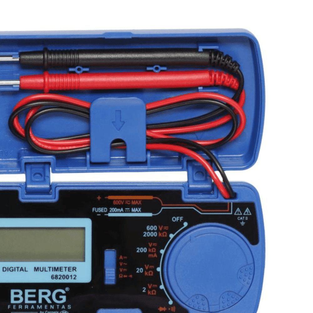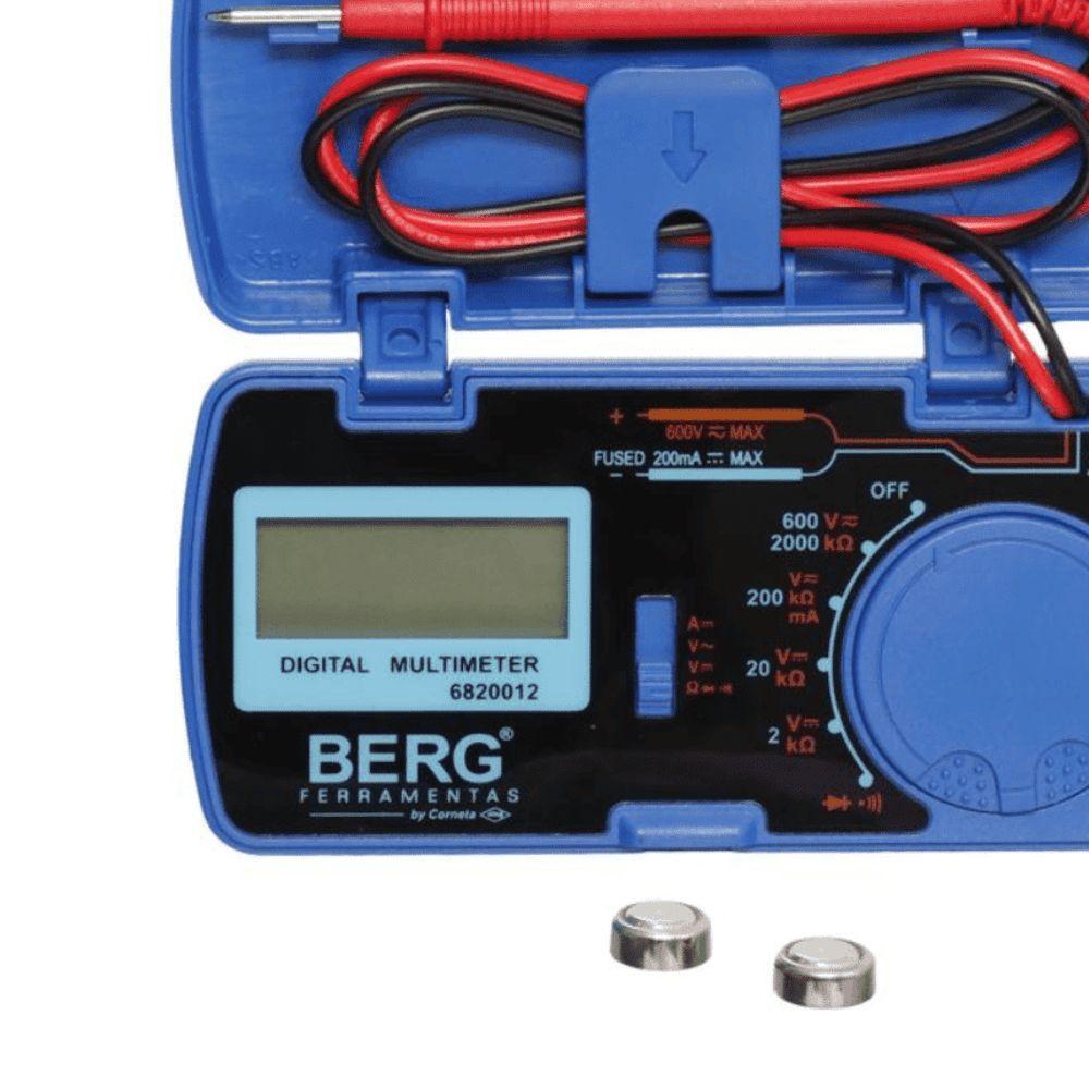 Multimetro Digital Western De BolsoEspecificacao TecnicaMultimetro digital de bolsoCaracteristicas Importantes:- Tensao Dc: 2V / 20V / 200V / 300V;- Tensao Ac: 200V / 300V;- Corrente Dc: 200Ma;- Teste De Diodo: Sim;- Bateria: Celula Botao De 1,5V, Lr44 Vem Com 2 Pecas;- Versao de Bolso;- Facil Transporte;- Compacto e Leve.Antes do Uso: Verificar se o produto esta em perfeitas condicoes de uso ou instalacaoPerigos:- Cuidado durante o manuseio do produto para evitar acidentes;- Evite molhar as partes que contem componentes eletronicos, compartimento de bateria e entrada USB;- Evite quedas e pancadas para nao danificar o produto.Cuidados: Utilize o equipamento de protecao individual necessario ao trabalho (oculos de protecao, luvas, botas etc.)Advertencia/ Atencao: Manter fora do alcance das criancas, Trabalhe seguroIndicacao:- Medicao de tensao DC/AC- Corrente DC- Resistencia- Teste de Diodo*Imagens meramente ilustrativas.DescricaoDimensoes da Peca:113 x 56 x 22mmEspessura:N/AN/ACapacidade:N/AN/ADimensoes da Embalagem:19, 7 x 14 x 1,5cmTipo de Embalagem:BLISTERQuantidade Inner:10 PecasDimensoes Inner:N/A x N/A x N/AQuantidade Master:60 PecasDimensoes Master:45 x 40 x 22Material:ABS, Resina epoxi, Fibra de vidro (placa de circuito) e Componentes eletronicosCor:Azul e PretoMarca:BERG FERRAMENTASOrigem:CHINAComposicao do Produto:1 unidade