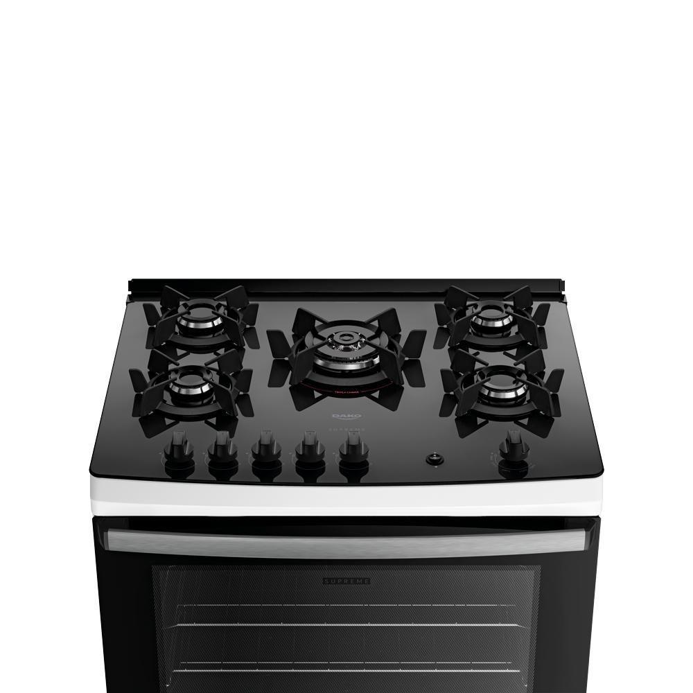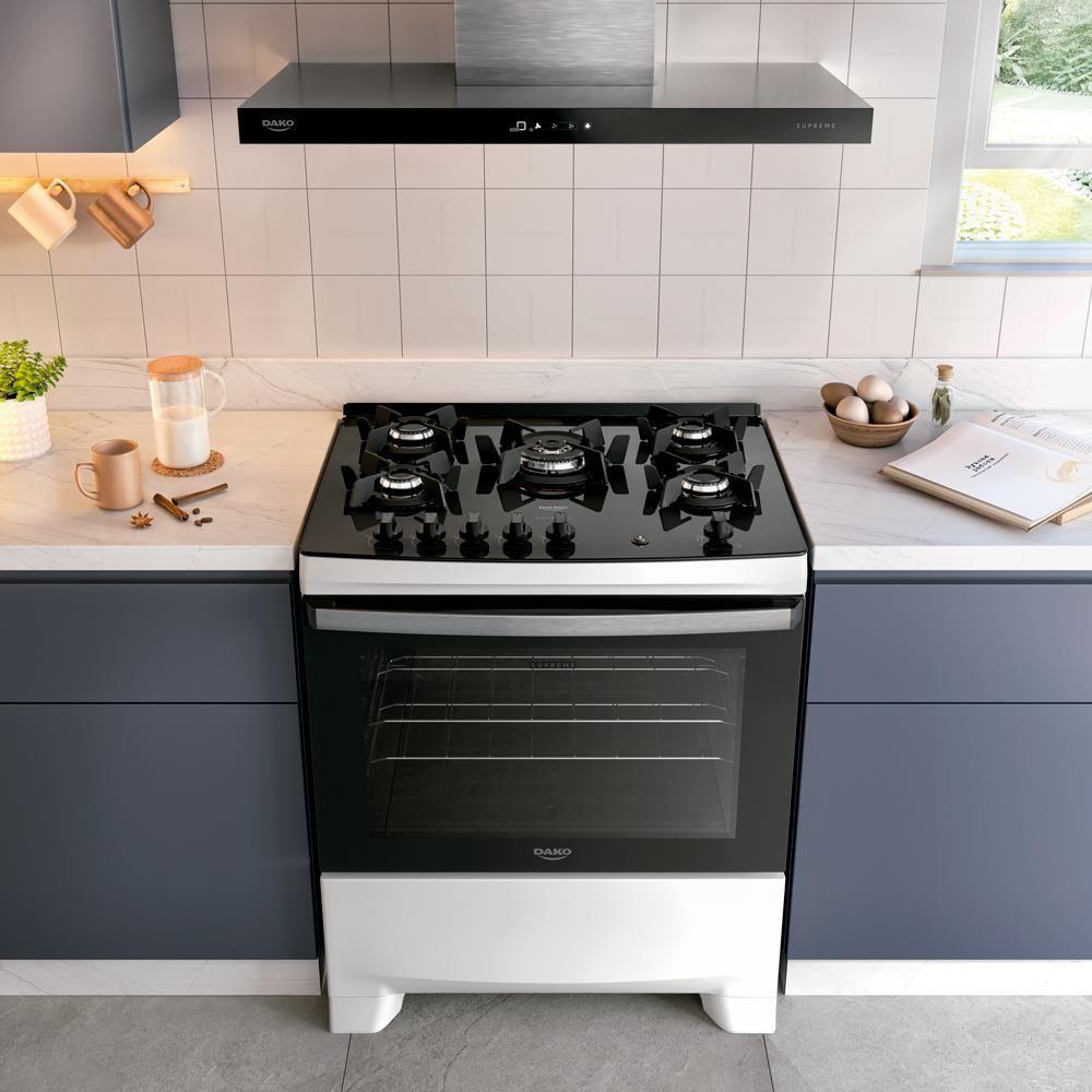 Fogão 5 Bocas Dako Supreme Com Mesa De Vidro BivoltOs tempos mudaram e o Supreme Glass também. Ele continua compacto por fora e gigante por dentro. Afinal, até os sucessos merecem ser reinventados.Tenha mais agilidade no preparo das refeições com a praticidade que você merece. Moderno, e eficiente, o fogão Dako Supreme Glass é perfeito para todos os estilos de cozinha. A versão de 5 bocas conta com Tripla Chama para um preparo rápido, enquanto as grades individuais de ferro fundido, com 6 pontos de apoio, garantem aderência e estabilidade para suas panelas.O puxador em alumínio escovado, além de ergonômico, dá um toque a mais de sofisticação no design. A prateleira deslizante torna ainda mais fácil colocar e retirar suas receitas com total praticidade. O visor amplo do forno permite acompanhar o preparo sem precisar abrir a porta, e o acabamento Limpa Fácil deixa a limpeza ainda mais rápida e descomplicada.Ter um Fogão Dako Supreme Glass é transformar a cozinha no coração da sua casa. É sentir o prazer de preparar refeições deliciosas com a confiança de estar utilizando um fogão que alia qualidade e inovação.Poucas coisas funcionam tão bem quanto um Fogão Dako Supreme Glass.Você vai perceber: na hora de comprar, a Dako surpreende!Confira demais características do produto:Voltagem: BivoltPadrão de Tomada: 10ACor: BrancoLinha: Supreme GlassQuantidade de Bocas: 5 bocasTipo de Acendimento: AutomáticoGarantia: 12 MesesAcabamento da Mesa: Vidro TemperadoInstalação: Fogão de PisoTurbo Convecção: NãoDimensões do Produto (largura x altura x profundidade): 76,6 x 95,0 x 65,2 cmComprimento do Cabo de Energia: 96 cmFuncionamento: GásCapacidade do Forno: 60 LitrosAcabamento do Forno: Limpa FácilLuz no Forno: Sim (lâmpada de 220v acompanha o produto)Vidro do Forno: Vidro DuploTampa: NãoTrempes: Ferro fundidoGrades do Forno: 2 Grades deslizantesTimer Digital: NãoBotões Removíveis: SimFabricação: Potência dos Queimadores: 2Q Semirrápido de 1,7 kW e 2Q Rápido de 2,0kWSistema Corta/Bloqueia Gás: SimEficiência Energética: AEAN: 7897180599164