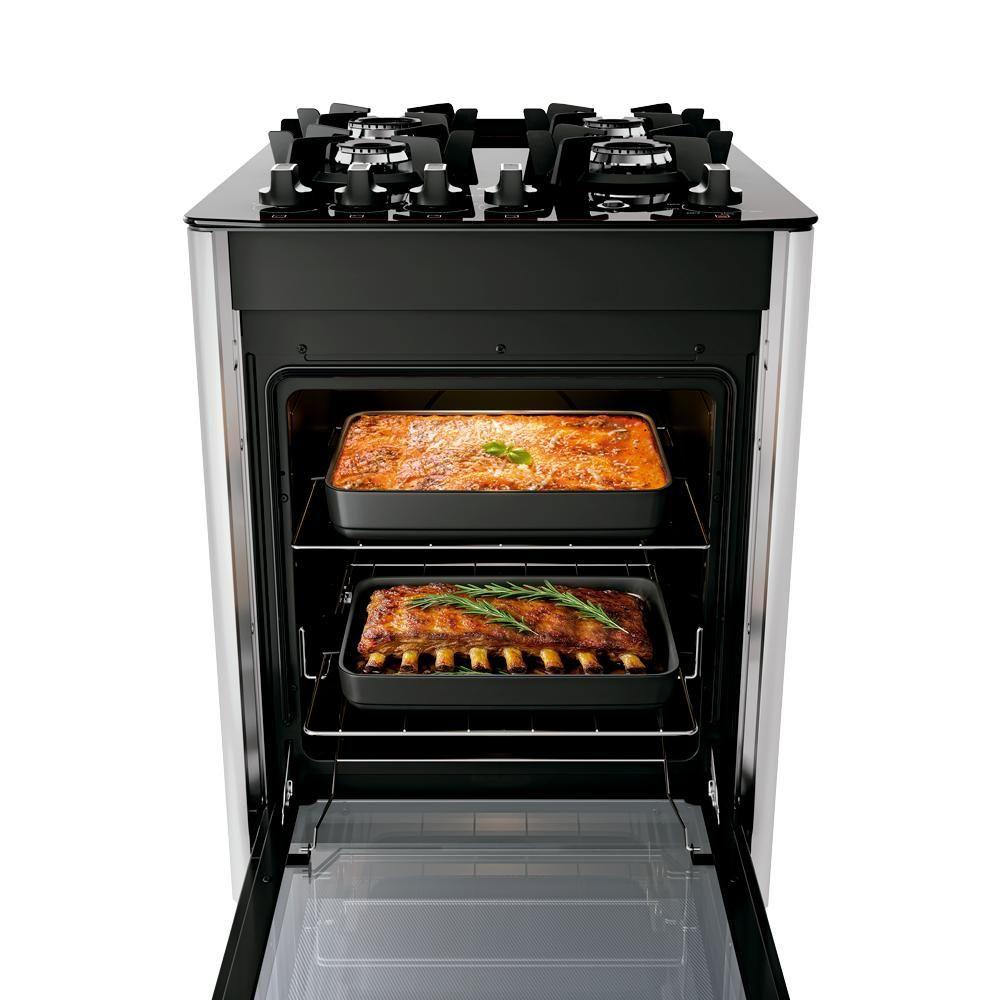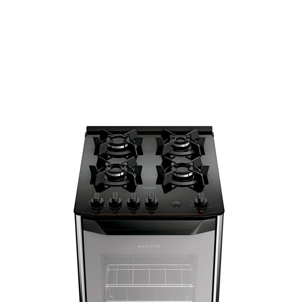 Fogão 4 Bocas Dako Magister Style Com Mesa De Vidro Espelhado BivoltFogão 4 Bocas Preto com Frente em Vidro Espelhado e Mesa de Vidro Dako Magister Style: as Definições de Fogão Foram Modernizadas!Design moderno com frente em vidro espelhado, mesa de vidro top control, acendimento automático, grades de ferro fundido com 6 pontos de apoio - que proporcionam maior e firmeza para as panelas, bordas laterais em inox, puxador amplo e ergonômico e pés robustos.A versão 4 bocas possui 2 queimadores de 1,7kW, 1 queimador família de 2,0kW e 1 queimador chama de 2,5kW.O forno possui excelente capacidade de 60 litros, acabamento limpa fácil, iluminação interna (lâmpada acompanha o produto), 1 grade autodeslizante e 1 deslizante e porta com vidro duplo - que preserva o calor.Atributos e Benefícios:Design que impressiona: A sofisticação da frente espelhada combinada com a modernidade da mesa de vidro temperado, criando um visual de alto impacto para sua cozinha.Estabilidade superior: Grades de ferro fundido com 6 pontos de apoio que garantem máxima e robustez para todos os tipos de panelas.Potência na medida certa: Versão 4 bocas com Chama para preparos mais rápidos.Praticidade que inspira: Duas prateleiras no forno, sendo uma autodeslizante para facilitar a retirada dos pratos e outra com altura ajustável para maior versatilidade.Visibilidade perfeita: Visor amplo e lâmpada interna que permite acompanhar suas receitas sem abrir a porta do forno.Economia para o seu dia a dia: Isolamento térmico com lã de basalto que preserva o calor, otimizando a temperatura e reduzindo o consumo de gás.Limpeza sem esforço: Forno com acabamento Limpa Fácil e mesa de vidro que tornam a limpeza muito mais rápida e prática.Ficha Técnica:Marca: DakoVoltagem: BivoltCor: PretoLinha: MagisterQuantidade de Bocas: 4 bocasTipo de Acendimento: AutomáticoGarantia: 12 MesesAcabamento da Mesa: Vidro TemperadoInstalação: Fogão de PisoDimensões do Produto (largura x altura x profundidade): 51,5 x 94,2 x 63,8 cmDimensões Internas do Forno (largura x altura x profundidade): 37 x 36 x 45 cmComprimento do Cabo de Energia: 96 cmFuncionamento: GásCapacidade do Forno: 60 LitrosAcabamento do Forno: Limpa FácilLuz no Forno: Sim (lâmpada acompanha o produto)Vidro do Forno: Vidro DuploTrempes: Individual de ferro fundido com 6 pontos de apoioGrades do Forno: 1 Grade autodeslizante e 1 deslizanteBotões Removíveis: SimFabricação: Potência dos Queimadores: 2Q Médios de 1,7kW, 1Q Família de 2,0kW e 1Q Chama de 2,5kWSistema Corta/Bloqueia Gás: SimEficiência Energética: ASKU: 300002159EAN: 7897180513405** Atenção nas compras com CNPJ:Para que o pedido seja processado corretamente, é obrigatório informar no momento da compra:- Se o CNPJ é Contribuinte: deve-se indicar se o cliente é Isento ou possui Inscrição (IE).Se o CNPJ é Não Contribuinte: essa condição também deve ser informada. Ex.: Isento- Pedidos sem essas informações serão automaticamente cancelados.- Não aceitamos atualizações via chat.