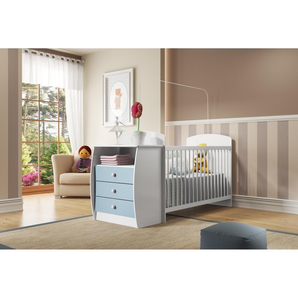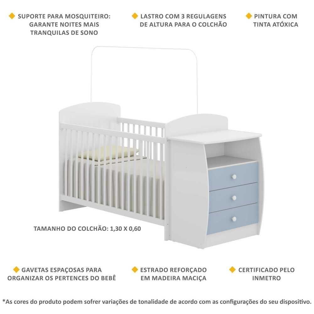 Pensando em descomplicar e otimizar o espaço no quarto do seu bebê, a Multimóveis apresenta o berço Rafael, que tem um design clean o que justamente deixa o quarto mais chamorso! A cômoda acoplada vai ajudar a mamãe, tornando seu dia-a-dia mais prático. Características:- Material: MDP- Cor: Branco / Azul- Rodízios: Não acompanha- Acompanha colchão: Não.- Lastro com 3 regulagens de altura- Suporte para mosquiteiro: Sim- Grade fixa: Sim- Acabamento: Acabamento em Pintura UV Tamanho do berço montado:Altura: 91,5 cmLargura: 173 cmProfundidade: 68,5 cmProduto composto por:01 Berço, manual de montagem e Certificado de Garantia.- Tapa Parafusos: Seguindo resolução do INMETRO portaria, este produto não acompanha tapa parafusos, assim não haverá perigo da criança colocar na boca. Monte você mesmo: Os berços da Multimóveis acompanham uma chave Allen para facilitar a montagem.Observações: O produto será entregue desmontado e a Multimóveis não disponibiliza serviço de montagem. Mas para facilitar a instalação, são enviados: Parafusos, pregos, cavilhas, entre outros.Em caso de dúvidas, favor consultar o manual de montagem.- Acompanha .Imagem ilustrativa: A decoração não acompanha o produto.