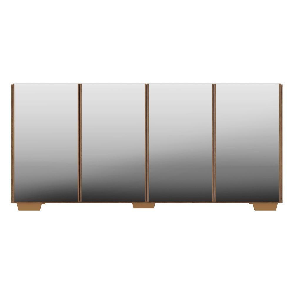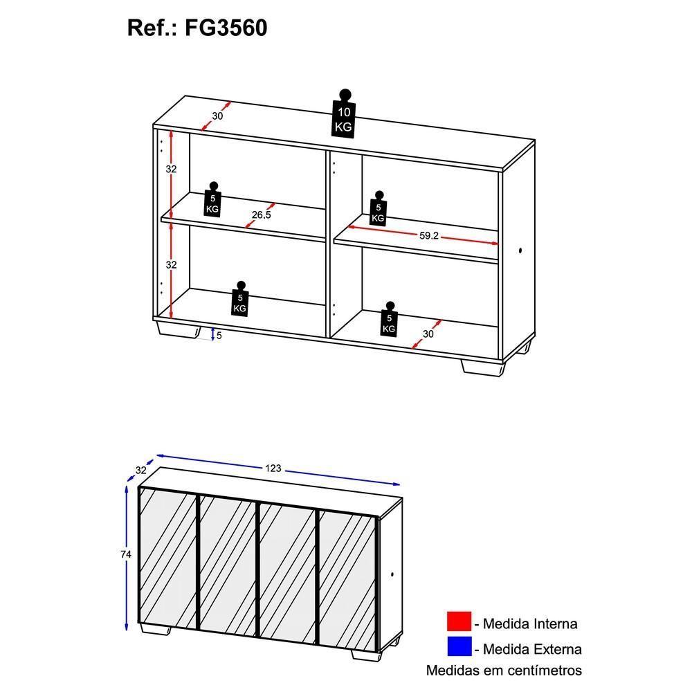 O Aparador Buffet 4 portas com Espelho e Pés Quadrados Vegas é produzido em MDP, que garante maior durabilidade, além de um acabamento superior. Com 4 portas, possui acabamento acetinado (cerca de 20% de brilho) e um excelente espaço interno para organizar seus pertences (as prateleiras internas suportam 5 Kg cada e o tampo 10 Kg). Os pés quadrados, em polipropileno, facilitam na hora da limpeza. Os detalhes com espelhos nas portas deixam o móvel mais requintado, criando um ambiente moderno e charmoso. Os espelhos são de vidro (o que evita que a imagem fique distorcida) e lapidados, ou seja, passam por um processo para que as bordas não fiquem cortantes, o que garante maior segurança. Seu design minimalista, torna o móvel muito versátil, podendo ser utilizado de diversas maneiras e em qualquer ambiente. Conteúdo da Embalagem:1 (um) aparador1 (um) kit com 5 pés quadrados1 (um) kit com 4 espelhosDimensões do produto montado:Altura: 74cm | Largura: 123cm | Profundidade: 32cm*Você pode consultar as medidas internas na imagem técnica do produto.*As cores do produto podem sofrer variações de tonalidade de acordo com as configurações do seu dispositivo.*Obrigatório fixar na parede.Imagem meramente ilustrativa. Decoração e eletros não acompanham o produto.O produto será entregue desmontado e não disponibilizamos o serviço de montagem.