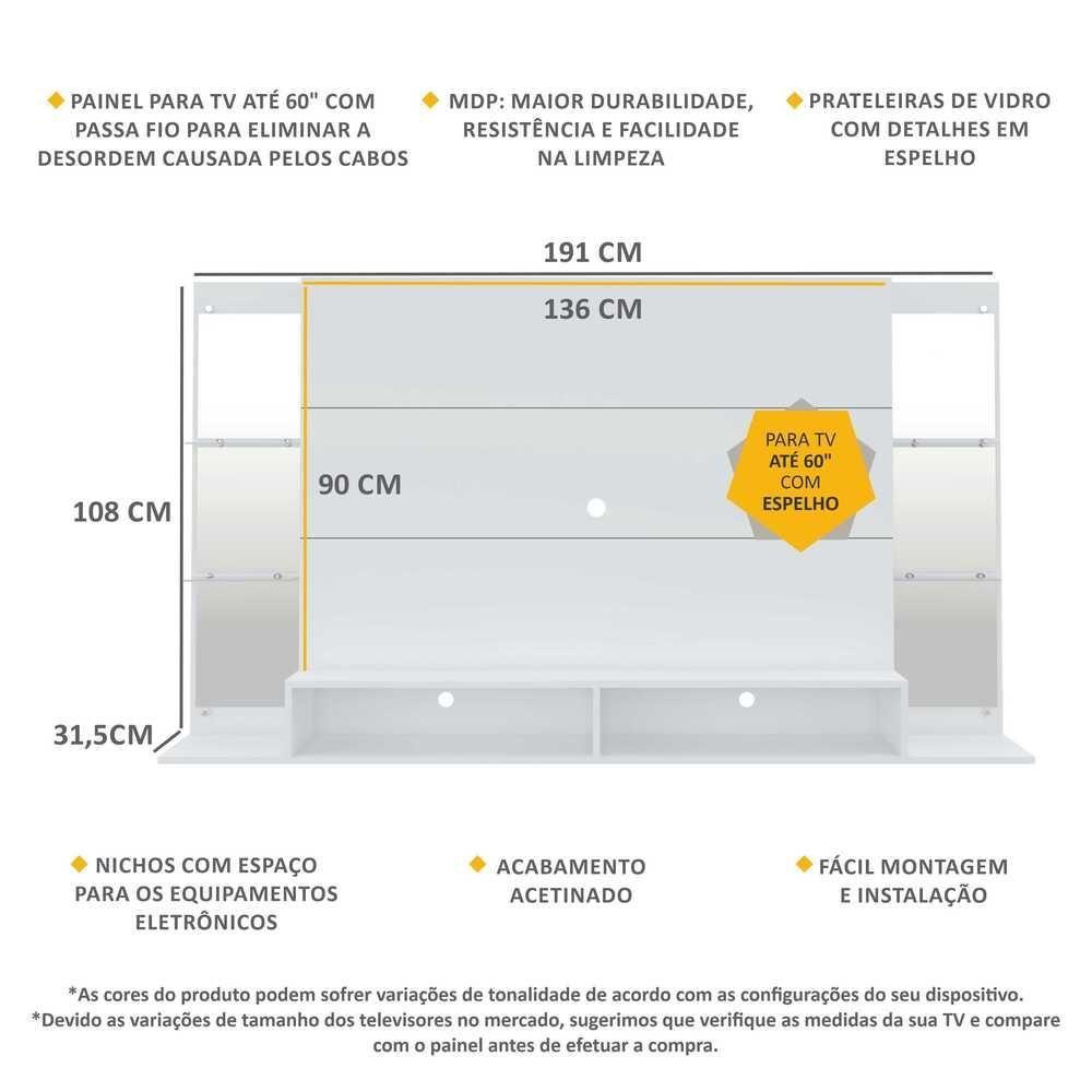 Prático e moderno para deixar sua sala de estar confortável para aproveitar o aconchego do seu lar. O Painel até 60 polegadas com espelho e prateleiras de vidro Nairóbi Multimóveis é uma escolha inteligente e super em conta para deixar o seu ambiente bonito e organizado. Produzido em MDP com acabamento acetinado (cerca de 20% de brilho), que garante maior durabilidade, resistência e facilidade na limpeza, possui painel para de até 60” (suporta até 28 kg) com espaçamento para a passagem dos fios, o que deixa um visual clean e os cabos organizados. Possui 4 prateleiras em vidro, com detalhes em espelho, que deixam o móvel mais requintado e 2 nichos para acomodar os equipamentos eletrônicos. Os espelhos são de vidro (o que evita que a imagem fique distorcida) e lapidados, ou seja, passam por um processo para que as bordas não fiquem cortantes, o que garante maior segurança.Conteúdo da Embalagem:1 (um) painel para 1 (um) kit com 4 prateleiras de vidro1 (um) kit com 6 espelhosDimensões do produto montado:Altura: 108 cm | Largura: 191 cm | Profundidade: 31,5 cmTamanho Painel : 136 x 90cm*Devido as variações de tamanho dos televisores no mercado, sugerimos que verifique as medidas da sua e compare com o painel antes de efetuar a compra.*Não recomendamos utilizar suporte de articulado.*Você pode consultar as medidas internas na imagem técnica do produto.*As cores do produto podem sofrer variações de tonalidade de acordo com as configurações do seu dispositivo.Imagem meramente ilustrativa. Decoração e eletros não acompanham o produto.O produto será entregue desmontado e não disponibilizamos o serviço de montagem.