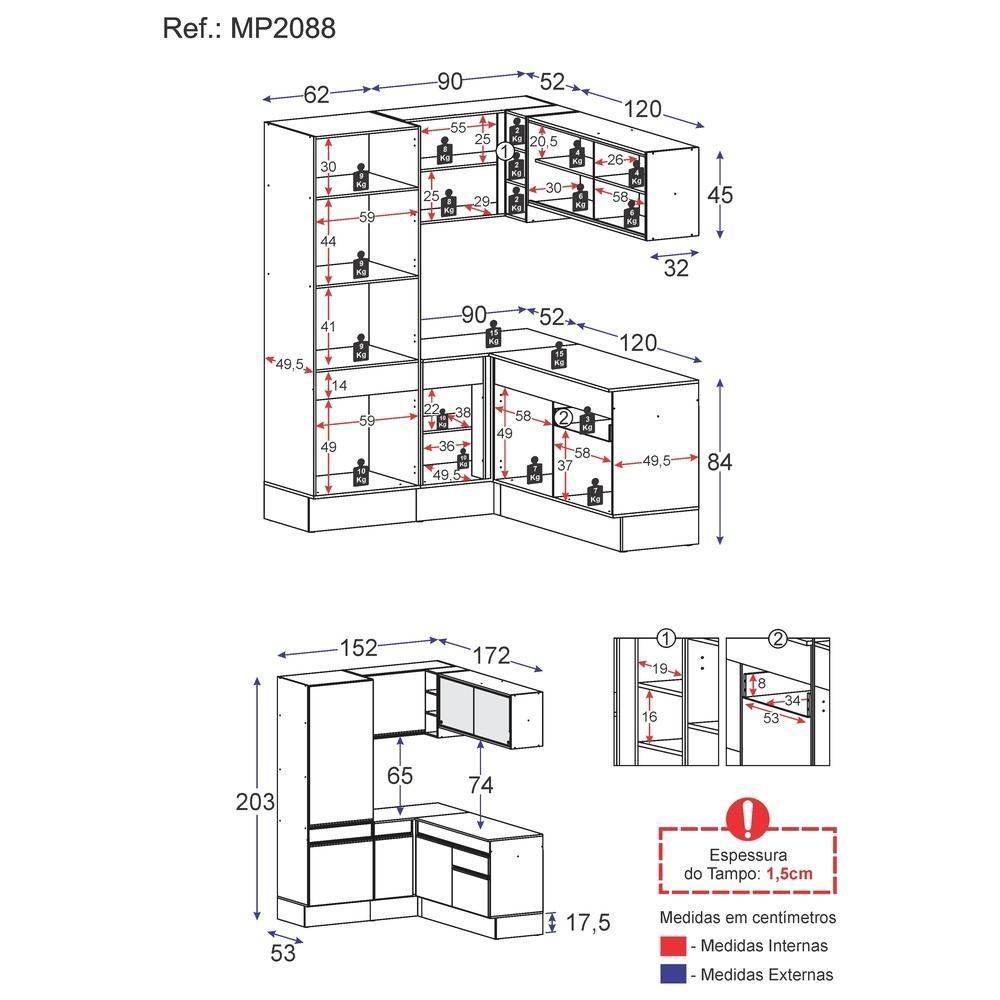A Cozinha Completa de Canto com Rodapé Veneza Multimóveis MP2088 com Armário e Balcão tem um excelente custo benefício e um amplo espaço interno. Produzida em MDP com acabamento acetinado (cerca de 20% de brilho), que garante maior durabilidade e resistência, possui corrediças metálicas (mais leveza no manuseio), rodapés, que deixam o ambiente mais estiloso, puxadores em ABS e tampo em MDP 15mm com pintura de alta resistência. Os módulos de canto podem ser montados dos dois lados (esquerdo ou direito), conforme a sua preferência. Esta cozinha conta, ainda, com balcão com tampo removível ( com pia de 120 cm), com 1 gaveta e 2 portas. Os módulos são individuais e você pode montar da maneira que se adaptar melhor ao seu ambiente. Para deixar sua cozinha mais bonita e organizada, possui vidro reflecta e compartimento especial para utensílios mais altos.Conteúdo da Embalagem:1 (um) paneleiro 62cm1 (um) armário aéreo de canto 90cm1 (um) armário aéreo com portas de vidro 120cm1 (um) balcão com tampo de canto 90cm1 (um) balcão com tampo 120cm1 (um) kit com rodapés Dimensões do produto montado:Altura: 203cm | Largura: 152 x 172cm | Profundidade: 32cm (aéreos) - 53cm (balcão com tampo e paneleiro)*Você pode consultar as medidas internas na imagem técnica do produto.Disponível nas cores:Branco - Preto Acetinado Texturizado*As cores do produto podem sofrer variações de tonalidade de acordo com as configurações do seu dispositivo.Imagem meramente ilustrativa. Decoração e eletros não acompanham o produto.O produto será entregue desmontado e não disponibilizamos o de montagem..