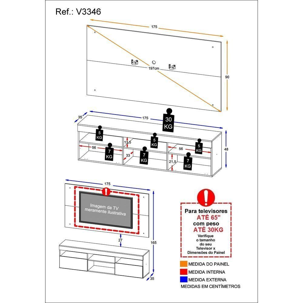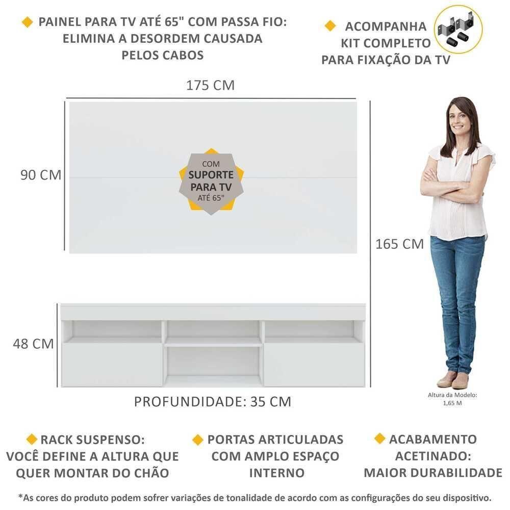 O Rack com Painel e Suporte 65" Suspenso Londres Multimóveis é produzido em MDP com acabamento acetinado, que garante maior durabilidade e facilidade na limpeza. Possui 4 nichos com espaço para os equipamentos eletrônicos e objetos decorativos, 2 portas articuladas com um amplo espaço interno para manter seus pertences organizados e ainda acompanha kit para ser montado de forma suspensa, conforme a altura que você quiser do chão. O painel para de até 65” possui espaçamento para passagem dos fios, que permite deixar os cabos mais organizados e o visual clean. Para facilitar a sua vida, este produto acompanha também o kit para fixação da . Muito prático e de fácil instalação, pode ser utilizado para ’s LCD, LED e plasma de 14” a 71”. Totalmente sobreposto, acompanha gabarito de montagem que auxilia na instalação. Conta com um sistema de encaixe rápido, possui 16mm de deslocamento que permite o ajuste do encaixe das peças. Uma ótima opção para deixar sua sala linda e confortável para curtir os melhores filmes e séries.Conteúdo da Embalagem:1 (um) rack com painel para 1 (um) kit com suporte para rack1 (um) kit com suporte para Dimensões do produto montado:Painel - Altura: 90cm | Largura: 175cm | Profundidade: 2,5cmRack - Altura: 48cm | Largura: 175cm | Profundidade: 35cm*Devido as variações de tamanho dos televisores no mercado, sugerimos que verifique as medidas da sua e compare com o painel antes de efetuar a compra.*Você pode consultar as medidas internas na imagem técnica do produto.As cores do produto podem sofrer variações de tonalidade de acordo com as configurações do seu dispositivo.Imagem meramente ilustrativa. Decoração e eletros não acompanham o produto. O produto será entregue desmontado e não disponibilizamos o serviço de montagem.
