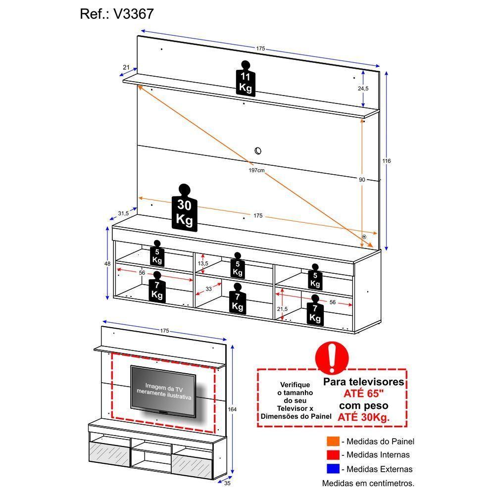 O Rack com Espelho e Painel 65" Madri Multimóveis é produzido em MDP com acabamento acetinado (cerca de 20% de brilho), que garante maior durabilidade e facilidade na limpeza, possui 4 nichos com espaço para os equipamentos eletrônicos, além de 2 portas articuladas com espelho e um amplo espaço interno para manter seus pertences organizados. Os espelhos de vidro (evita que a imagem fique distorcida) e lapidados, ou seja, passam por um processo para que as bordas não fiquem cortantes, o que garante maior segurança, deixam o móvel mais requintado. O painel para de até 65” (suporta até 30 Kg) com espaçamento para passagem dos fios, que permite deixar os cabos mais organizados e o visual clean, ainda possui uma prateleira para os objetos decorativos. Seu ambiente bonito e confortável para curtir os melhores filmes e séries.Conteúdo da Embalagem:1 (um) Rack com Painel para e Prateleira1 (um) Kit com 2 (dois) EspelhosDimensões do produto montado:Altura: 164cm | Largura: 175cm | Profundidade: 35cm*Devido as variações de tamanho dos televisores no mercado, sugerimos que verifique as medidas da sua e compare com o painel antes de efetuar a compra.*Não recomendamos utilizar suporte de articulado.*Você pode consultar as medidas internas na imagem técnica do produto.*As cores do produto podem sofrer variações de tonalidade de acordo com as configurações do seu dispositivo.Imagem meramente ilustrativa. Decoração e eletros não acompanham o produto. O produto será entregue desmontado e não disponibilizamos o serviço de montagem.