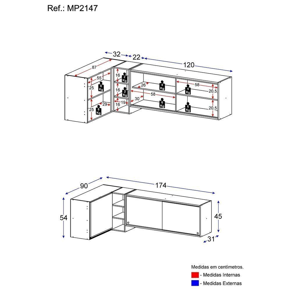 O Kit Armário de Cozinha Aéreo Canto 90cm e Aéreo 120cm Veneza Multimóveis MP2147 é a escolha perfeita para quem busca elegância e praticidade na cozinha. Fabricado em MDP com acabamento acetinado (cerca de 20% de brilho), garante durabilidade e resistência. Conta com uma porta de giro com puxador em ABS e duas portas de correr em vidro reflecta, que trazem um toque de sofisticação. Além disso, conta com três prateleiras internas e nichos que ajudam a manter todos os utensílios de cozinha organizados e ao alcance das suas mãos. Versátil, este kit é dividido em dois módulos separados, permitindo que você monte do jeito que preferir.Conteúdo da Embalagem:1 (um) Armário Aéreo de Canto 90cm1 (um) Armário Aéreo 120cmManual de MontagemKit FerragemDimensões do produto montado:Altura: 54cm | Largura: 174cm | Profundidade: 90cm*Você pode consultar as medidas detalhadas na imagem técnica do produto.*As cores do produto podem sofrer variações de tonalidade de acordo com as configurações do seu dispositivo.Imagem meramente ilustrativa. Decoração não acompanha o produto.O produto será entregue desmontado e não disponibilizamos o de montagem.