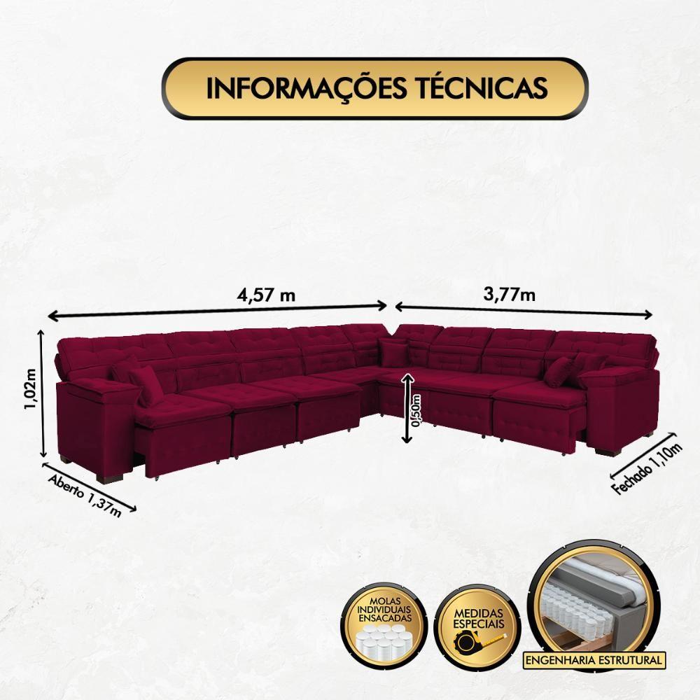 Sofá Magno 4.57x3.77m De Canto, Retrátil E Reclinável Vinho Sofá de Canto Magno Retrátil e Reclinável 4.57x3.77m – SofisticatoO Sofá Magno é um estofado de canto retrátil e reclinável com um sistema de molas ensacadas individualmente, que traz a sensação de um colchão box na sua sala de estar, proporcionando conforto e aumentando ainda mais a durabilidade do sofá.Seus assentos em molas ensacadas retrátil e reclinado, possui o sistema de módulos que se encaixa firme e facilmente, feito com espuma D35 Adaptavive Gray System que proporciona maior conforto, espaço, e qualidade para você aproveitar o melhor do sofá de canto.Desenvolvido com tecido Veludo Soft, traz maior conforto ao toque, com qualidade e durabilidade comprovada superior ao suede liso, suede e suede vegetalle.Outro diferencial do sofá é a possibilidade de abertura e inclinação de cada encosto e assento de forma independente, assim cada pessoa pode escolher a sua posição ideal para sentar ou deitar. Deixei sua casa mais linda e ganhe muito mais conforto para sua vida, peça o seu.Itens Inclusos:- 1 Sofá.Informações Técnicas Sofá Magno:-Encosto: Reclinável com 5 posições, almofadas fixas compostas de fibra siliconada.-Assento: Desenvolvido com assento retrátil com Pillow Top de espuma D35 Adptative Gray, e sistema de molas ensacadas individualmente.-Material da estrutura: Madeira Maciça de Eucalipto de reflorestamento, produto ecologicamente correto.-Enchimento do Assento: Espuma D-35 Adptative Gray.-Fixação da Estrutura: Grampos de aço galvanizados.-Revestimento do Tecido: Veludo Soft.-Marca: SofisticatoMedidas Sofá Magno:-Altura aproximada: 102cm (reclinável em pé), 50cm (chão ao assento).-Largura aproximada: 457cm x 377cm (esquerda/direita).-Profundidade aproximada: 110cm (fechado), 137cm (aberto).-Capacidade em Kg por Lugar: Aproximadamente 140kg.Garantia: 2 Anos (24 Meses).Recomendações e Manutenção Sofá Magno:-Não Necessita de montador Especializado, pode ser montado por uma pessoa sozinha sem maiores dificuldades.-A garantia é referente a s de , portanto, não cobre s que caracterizam mau uso pelo consumidor, como utilização de produtos abrasivos, cortantes, removedores de mancha, quebras por ou corte de linhas, ou seja, a garantia funciona para s ou vícios do produto que não apresente indícios de má utilização. Informações Relevantes:- A tonalidade pode variar entre a imagem de exibição e o item físico devido a diferença e configuração de tela visualizadora (/), mas não alterando as qualidades técnicas do produto;- Montagem: Para produtos modulados: necessita de instalação, porém não é necessário mão de obra especializada, a instalação é simples com sistema de encaixe;- : Não nos responsabilizamos pelo por escadas, elevadores, guincho ou içamento deste produto, qualquer despesa é de responsabilidade do cliente;- Verifique as dimensões do estofados e certifique-se que o percurso e de instalação permitem sua passagem e acomodação;- Os objetos que ambientam as fotos não acompanham o produto....Tag Você também pode buscar por – Sofá, sofá reclinável, sofá retrátil, sofá grande, sofá luxo, sofá confortável, sofá para casa, sofá 2 Lugares, Sofá 4 lugares, sofá com Pillow, sofá para apartamento, sofá clean, sofá designer.