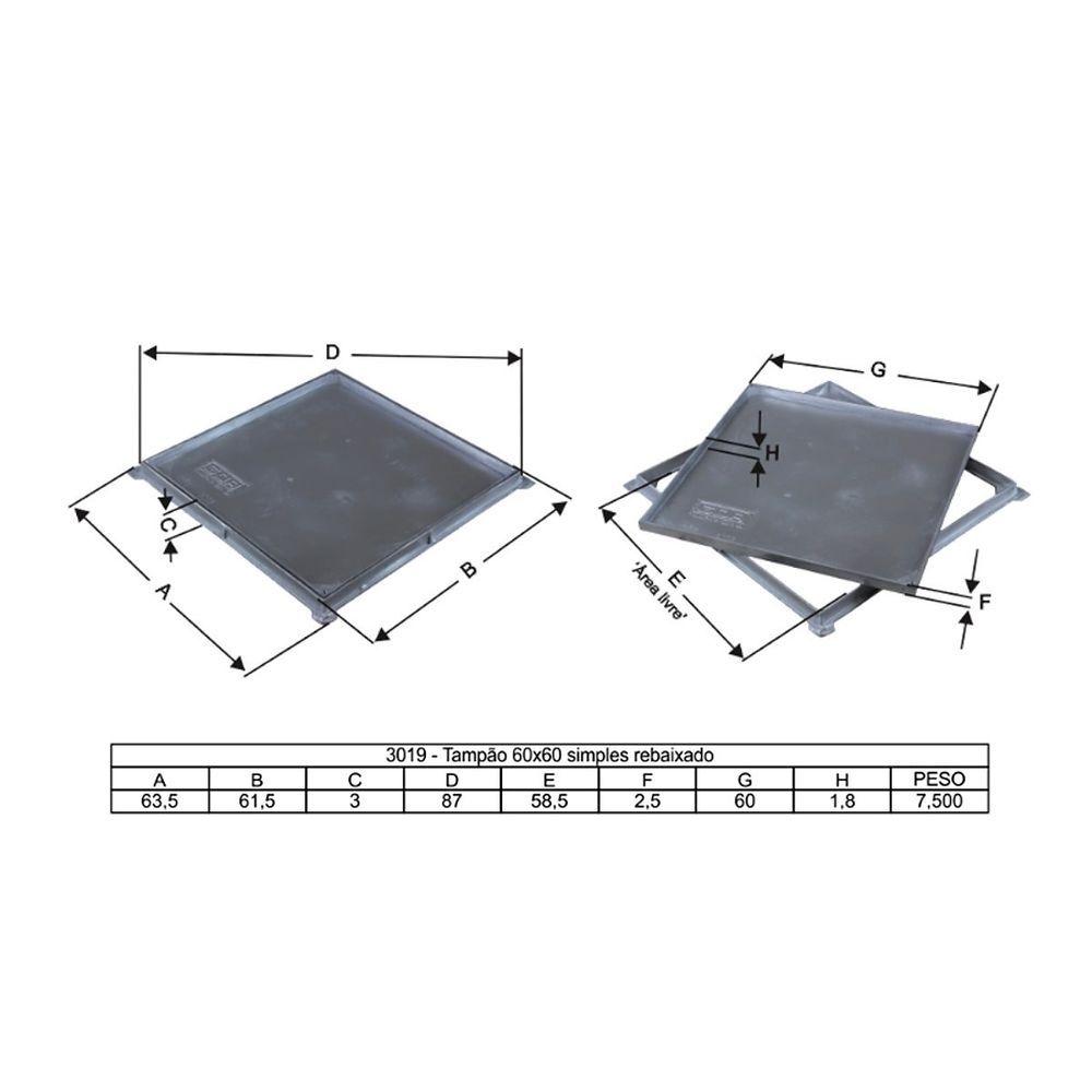 Tampa Tampão Chão Alumínio Fundido Simples Rebaixado 60x60cm