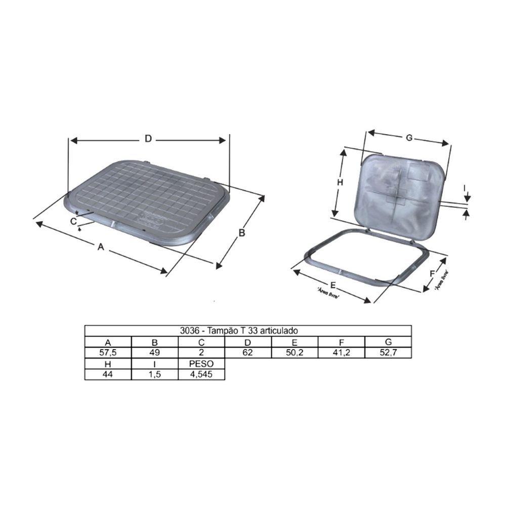 Tampa Tampão De Chão Articulado T33 Alumínio Fundido 58x49cmTampa Tampão de Chão Articulado T33 Alumínio Fundido 58x49cmProjetado para tampar caixas de passagem de tubulação, esgoto, águas pluviais, água potável, redes de telecomunicações, eletricidade entre outros. Sua articulação dificulta o furto da tampa. Possibilita fácil acesso às válvulas, registros e quadros de distribuição. Obs: Favor considerar as medidas das especificações técnicas, não podemos colocar virgula no título.Especificações Técnicas:Acabamento: Pintura cor alumínio (esmalte sintético).Carga Máxima Nominal por Eixo: 500Kg.Modelo: Tampão Retangular Articulado.Indicação: Caixa de Passagem.Material: Alumínio Fundido.Comprimento: 57,5cm.Largura: 49cm.Peso: 4,5Kg.Altura: 2cm.Itens Inclusos:01 Tampa Tampão de Chão Articulado T33 Alumínio Fundido 57,5x49cm.Código: 3036GDA