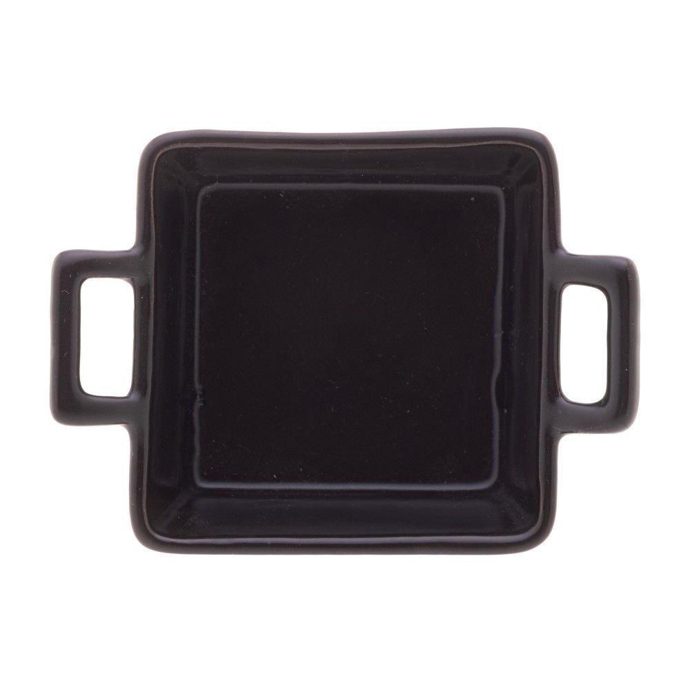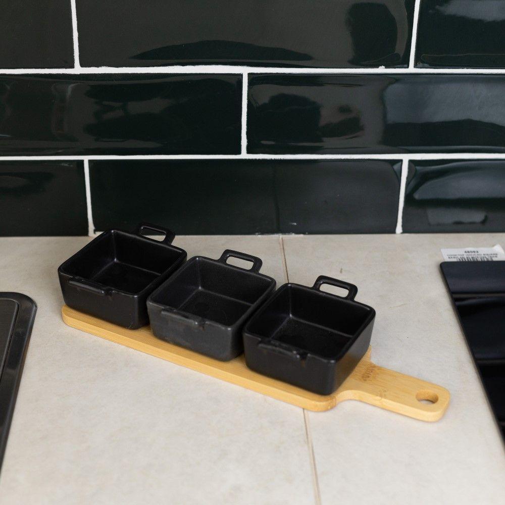 Conjunto 03 Petisqueiras Quadradas De Porcelana Preta Com Bandeja De Bambu Wolff