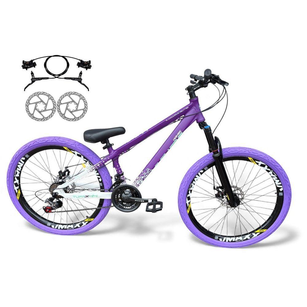 Bicicleta Aro 26 Vikingx Tuff X44 Freio Hidráulico 21v Freeride Rodas Vmaxx Garfo Suspensão Pneu Flame Roxo-Branco