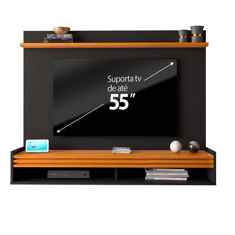 Painel Ripado Tv 55 Polegadas Com Nicho E Prateleira Ipanema - Preto E Cedro
