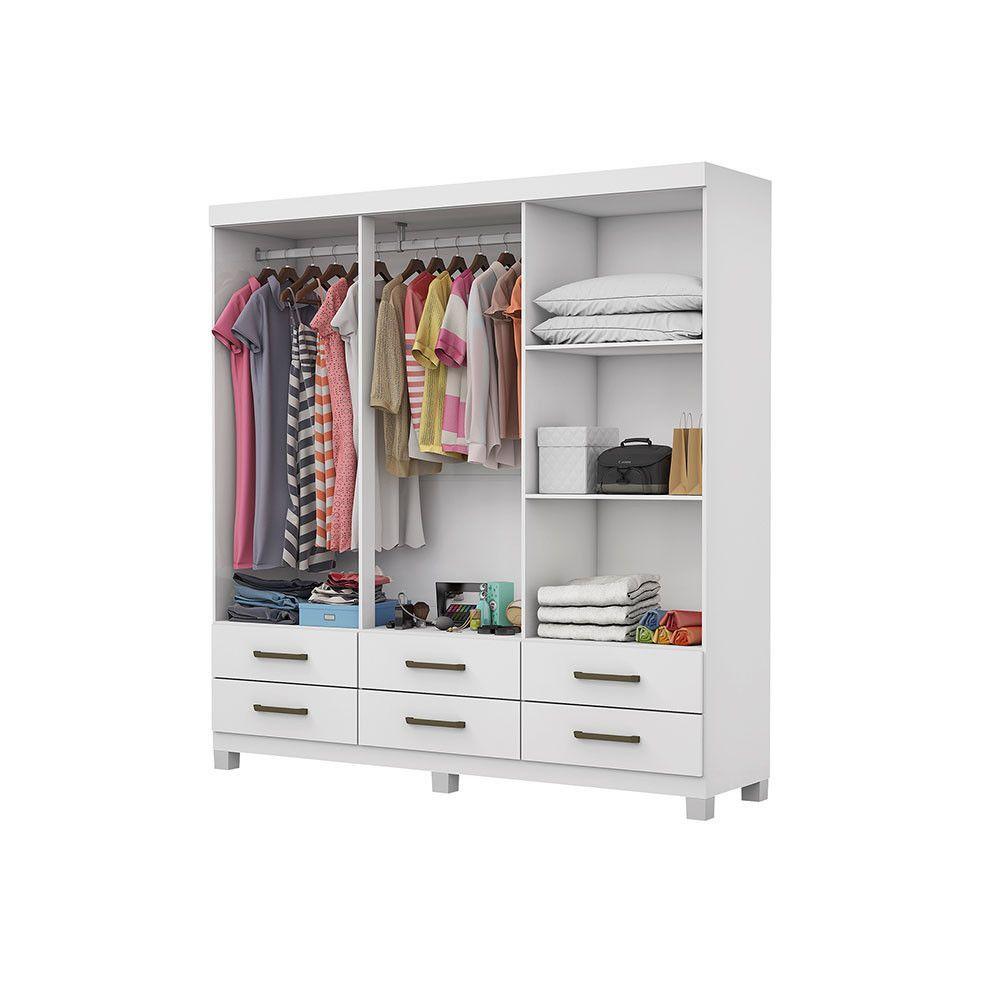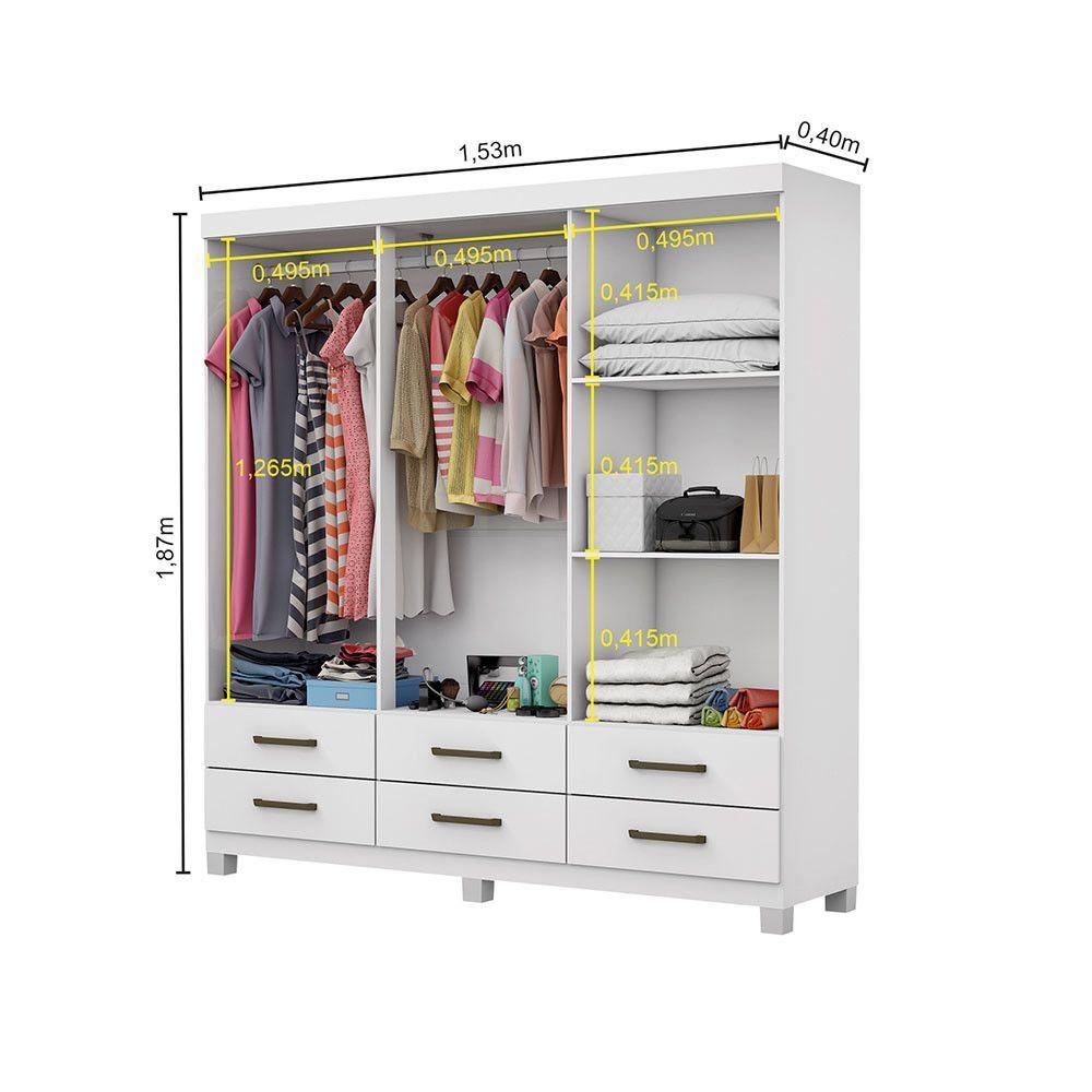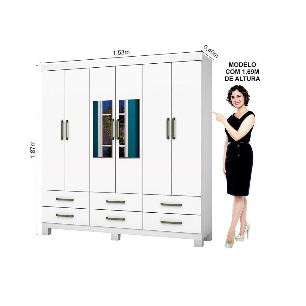 Guarda-roupa D22 6 Portas 6 Gavetas Com Espelho E Pés BrancoGuarda-Roupa D22 é um produto perfeito para quem possui um ambiente com espaço reduzido e ainda procura qualidade e durabilidade no mesmo móveis. Possui 1,87m de altura, 1,53m de largura e 0,40m de profundidade combinado com 6 portas, 6 gavetas, 3 prateleiras e um grande cabideiro, deixando o produto com uma ótima divisão interna. O maleiro é ideal para guardar malas, cobertores, edredons. O cabideiro além de resistente, é ideal para pendurar pares de blusas, camisas acessórios.As prateleiras são perfeitas para colocar roupas como blusas, shorts, regatas, kits de maquiagem, toalhas, caixinhas com acessórios e bolsas menores. As gavetasfixadas sobre corrediças metálicas, são ideais para guardas blusas dobradas, shorts, malhas e roupas íntimas. Estrutura do produto em MDP.Dimensões do produto:Altura: 187cmLargura: 175cmProfundidade: 40cmPeso: 72,15kgGarantia do fornecedor: 03 Branco