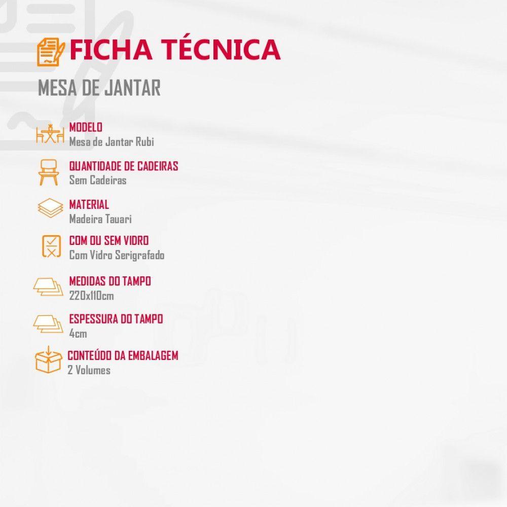 Mesa Rubi 220cm Madeira E Vidro Mobillare Off White Imbuia/cinamomoSofisticada e elegante como sua casa merece.Produto 100 em Madeira, a durabilidade que você precisa.Esse conjunto é composto por:01 - BASE DA MESA: EM LÂMINA DE MADEIRA CINAMOMO01 - Tampo: MDF LAMINADO E VIDRO SERIGRAFADO DE 4 MMDimensões:Altura: 78 cmLargura: 220 cmProfundidade: 110 cmOBSERVAÇÃO: CADEIRAS NÃO ACOMPANHAM O PRODUTOInformações Importantes:Os objetos que ambientam as fotos não acompanham o produto.Não disponibilizamos a montagem do produto.O produto acompanha manual de montagem. Não nos responsabilizamos por danos no produto causados por montagem de qualquer outra forma que não seja a descrita no manual.Verifique as dimensões do produto e certifique-se que o percurso que ele fará até o local de uso permite sua passagem.A Moderna Mobília reserva o direito de alterar as especificações técnicas sem prévio aviso.As medidas contidas no site podem sofrer variações de acordo com a montagem, tipo de costura etc.As tonalidades das cores podem sofrer alteração de acordo com a configuração de cada monitor.Garantia do fornecedor de 03 meses. Cor: Off White Imbuia/CinamomoN/A