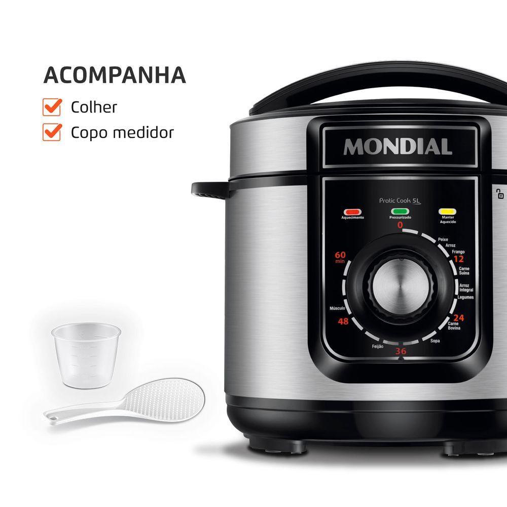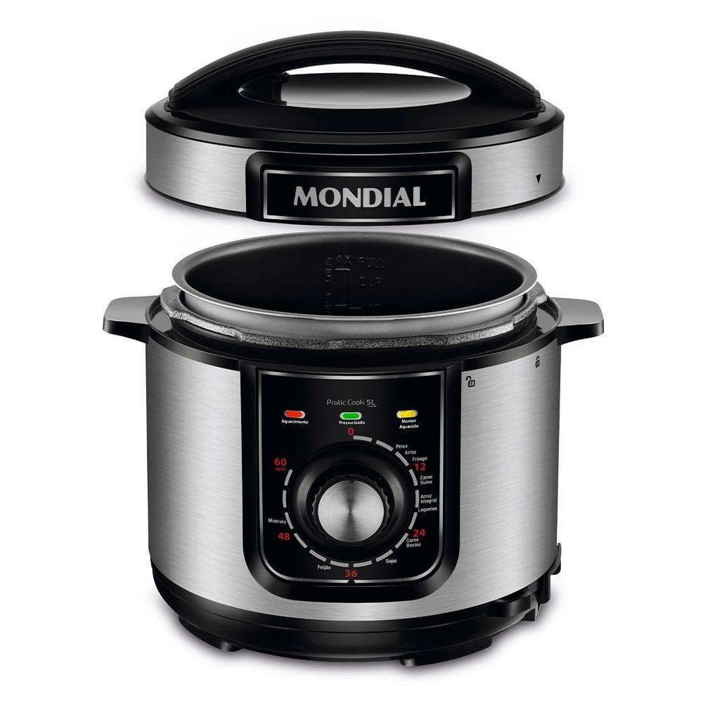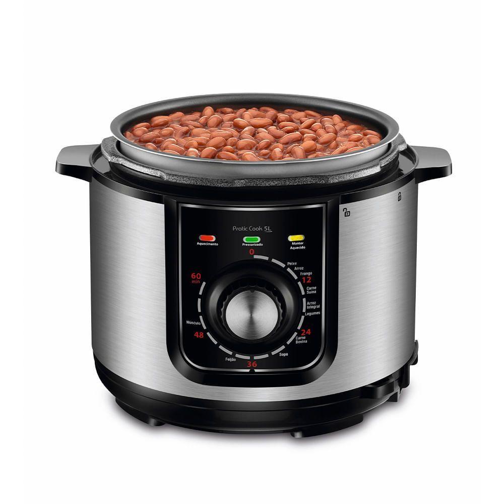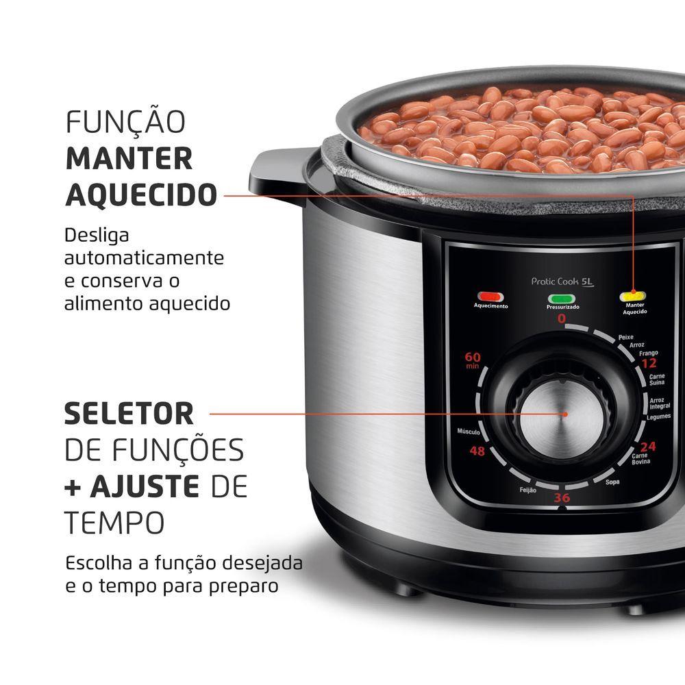 Pe-48-5l-i-panela Elétrica De Pressão-preto/inox Panela Elétrica De Pressão-220v-preto/inoxCom capacidade de 5L, a Panela de Pressão Elétrica Pratic Cook tem 10 funções programadas e ajuste manual do tempo. Ela desliga sozinha e mantém a comida quente. Sua cuba removível e antiaderente não gruda e é fácil de limpar. Ela vai até na máquina de lavar louças. Esta panela de pressão elétrica tem o tamanho ideal para as suas receitas. Ela prepara comidas como feijão, sopa, arroz, arroz integral, peixe, carne suína, carne, músculo, legumes, refogados e até doces. Sua tampa tem alça ergonômica, antitérmica e trava de . Com a panela de pressão elétrica, você recebe 1 colher, 1 copo medidor e 1 livro de receitas para reinventar seu cardápio. Seus 900W de potência garantem preparos mais rápidos. Ela é melhor para uso doméstico. Tudo isso com 1 ano de garantia - PE-48-5L-ICor - Preto/InoxVoltagem (Tensão) - 127V/220VItens inclusos - 01 Panela Elétrica - Manual de InstruçõesTipo de panela - Panela Elétrica de PressãoMaterial - PP e InoxCapacidade - 5LPotência - 900WRevestimento interno - SimAção do produto - Cozinhar, refogar e praparar alimentos de forma mais rá indicadora - SimAcessório para cozimento a vapor - NãoColher e copo medidor - SimAlimentação - Energia ElétricaDimensões do produto - 30cm x 33cm x 30,2cm (AxLxP)Peso do produto - 4,300kgComprimento do cabo - 1,50mGarantia - 1 ano