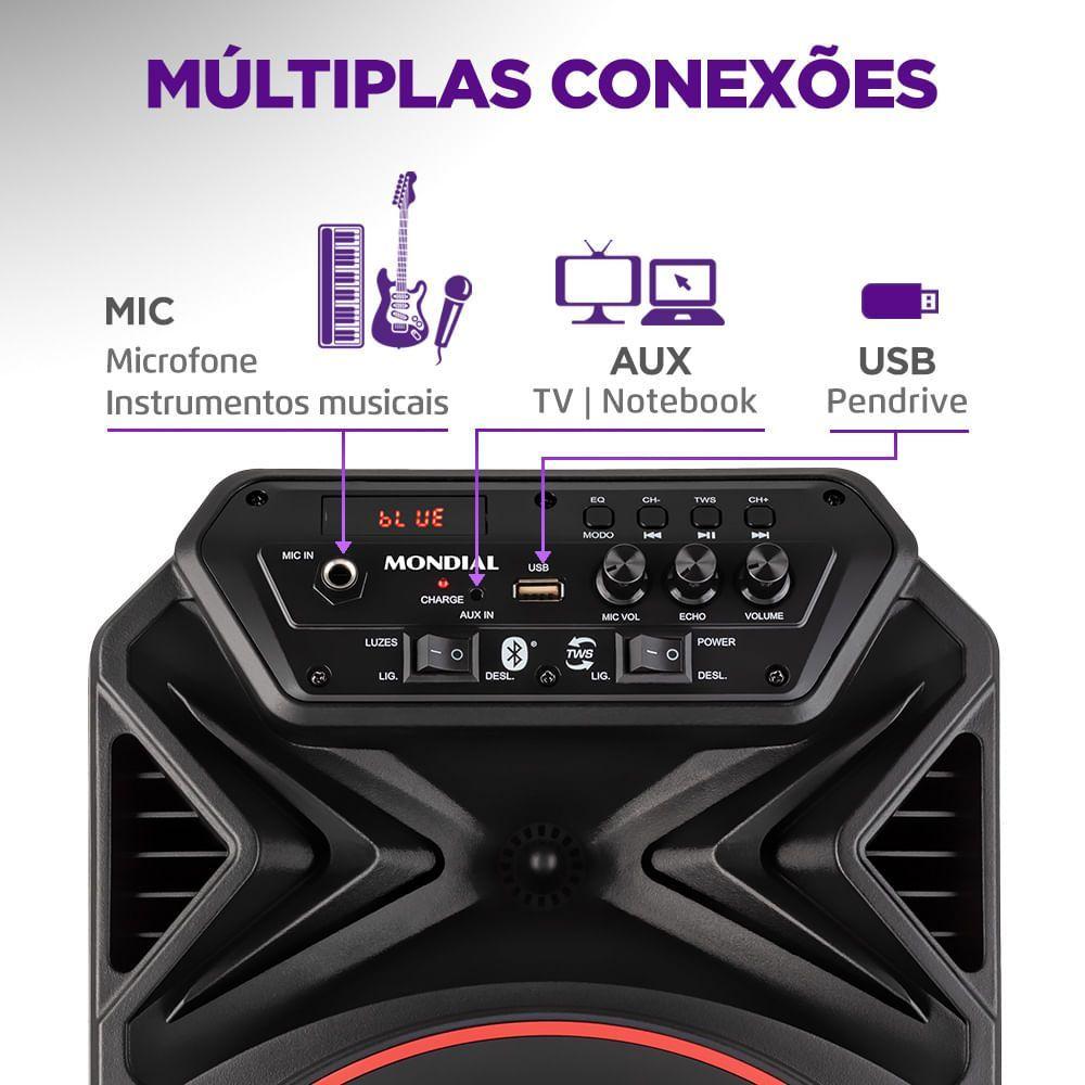 Caixa Amplificada Mondial Connect Partyplus Cm-250 Caixa Amplificada Cm-250 Bivolt .A Caixa Amplificada de som Connect Party Plus Bivolt CM-250 tem 250W RMS, alto-falante 8", função TWS, BLUETOOTH, entradas USB, AUXILIAR, de MICROFONE ou GUITARRA, BATERIA RECARREGÁVEL, alça e LUZES QUE PISCAM.Com alto-falantes de 08 polegadas e FUNÇÃO TWS (True Wireless Stereo) conecte 02 caixas de som CM 250 sem o uso de fios e tenha potencia de 250 watts de som em dois locais da sua festa sem o uso de cabos - a caixa de som CM250 tem função Bluetooth para conexão simultânea, diversas entradas, conexões e funções sonoras (USB/AUX/MIC, entradas para conectar Pen Drive, MP3, MP4, microfone ou guitarra ), conta com volume independente do microfone e eco, e EQUALIZAÇÃO sonora que ajusta diversos ritmos musicais. Funções de Display digital, Radio FM, Luzes piscantes; acompanha cabo P2 e alça de transporte. Garantia de 1 ano.Modelo - CM-250Cor - PretoPotência - 250WBluetooth - SimFunção TWS - SimBateria interna recarregável - SimEntrada para bateria externa - -Entrada e saída de áudio (L/R) - -Entrada USB - SimEntrada auxiliar - SimEntrada micro SD card - -Entrada para microfone - SimEntrada para instrumentos musicais - SimDisplay Digital - SimRádio FM - SimEqualizador digital - Não se aplicaFunção troca pasta - Não se aplicaFunção gravar - Não se aplicaVolume independente microfone - SimVolume independente guitarra - -Função eco - SimGrave - -Agudo - -Rodas para transporte - NãoAlça para transporte - SimFlash light - SimEntrada tripé - NãoControle remoto - NãoVoltagem (Tensão) - BivoltItens inclusos - 01 Caixa Amplificada; 01 Cabo de carregador; 01 cabo P2/P2 e 01 Manual de InstruçõesDimensões do produto - 47cm x 29cm x 21cm (AxLxP)Peso do produto - 1kgGarantia - 1 Ano