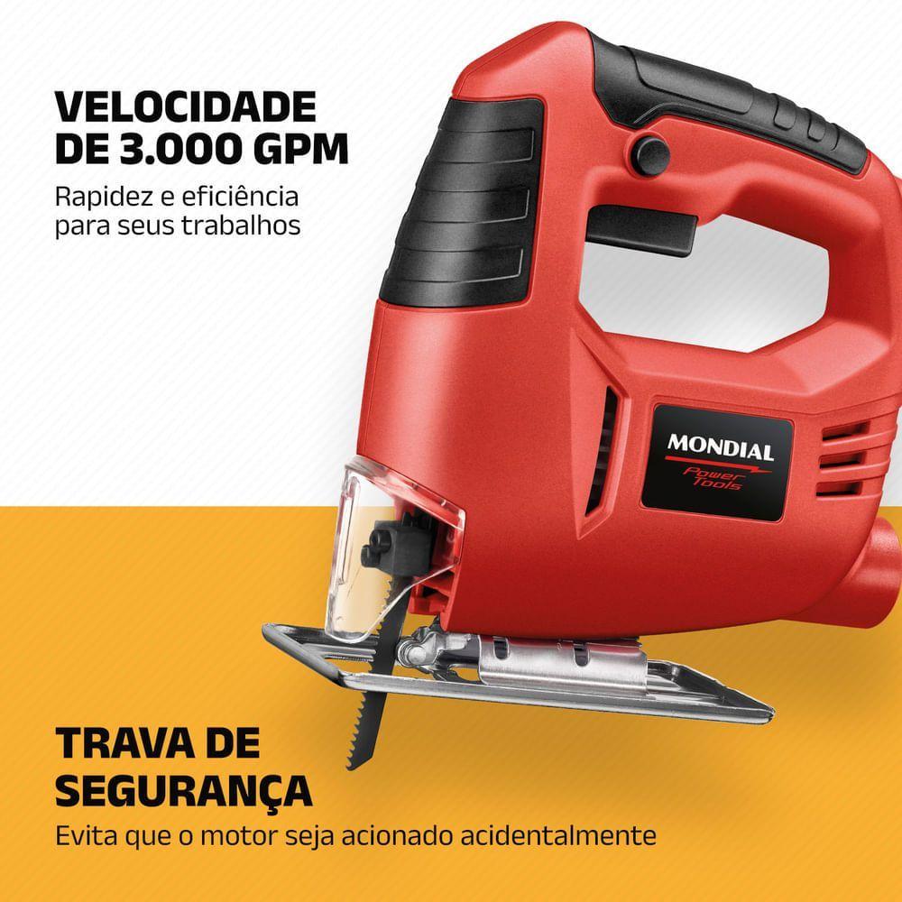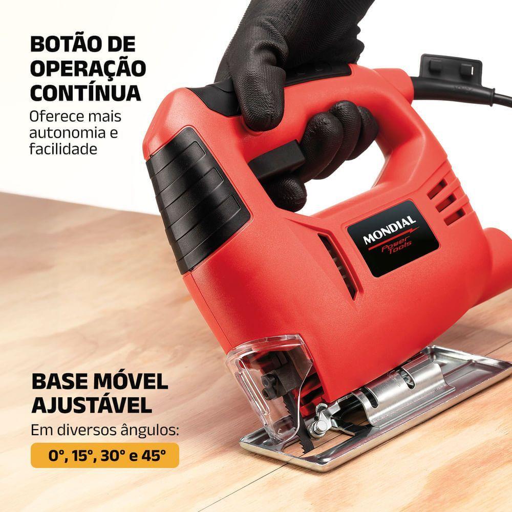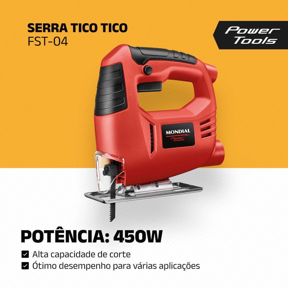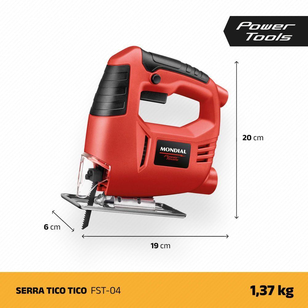 Serra Tico-tico 3000 Gpm Mondial Vermelho 450w - Fst-04 220vA Serra Tico-Tico FST-04 da Mondial é o item perfeito para quem deseja colocar a mão na massa e realizar seus projetos no melhor estilo “Faça Você Mesmo”. A ferramenta tem potência de 450W velocidade de 3.000 GPM e base ajustável em 0° 15° 30° e 45°. Além disso o protetor frontal da lâmina oferece mais segurança ao uso. Saiba mais sobre a FST-04:Motor de 450W: O motor da ferramenta tem 450W de potência e alta capacidade de corte o que proporciona um excelente desempenho para uma grande variedade de aplicações.Velocidade de 3.000 GPM: Mais rapidez e eficiência aos seus trabalhos.Base Móvel Ajustável: Para fazer cortes em ângulos diversos de 0° 15° 30° e 45°.Profundidade de Corte: Indicada para cortar até 40 mm em madeira 5 mm em aço e 10 mm em alumínio.Botão de Operação Contínua: Oferece mais autonomia e facilidade permitindo o uso contínuo com um único toque.Protetor Frontal de Lâmina: Mais segurança para você nos seus projetos.Um Ano De Garantia Mondial: A Mondial é a escolha de milhões de consumidores. Mondial a escolha inteligente!Modelo - FST04Cor - VERMELHOVoltagem (Tensão) - 127V / 220VItens inclusos - 01 Serra Tico-Tico; 01 Lâmina de Serra; Manual de Instruções e Manual de Assistência Técnica.Potência - 450WVelocidade - 300 GPMÂngulos base ajustável - 0°, 15°, 30° e 45°Profundidade de corte em madeira - 40mmProfundidade de corte em aço - 5mmProfundidade de corte em alumínio - 10mmBotão de operação contínua - SimProtetor frontal da lâmina - SimEstrutura emborrachada - SimCabo de energia - -Dimensões do produto - 20cm x 19cm X 6cm (AxLxP)Peso - 1,370KgGarantia - 1 anoMarca - Mondial