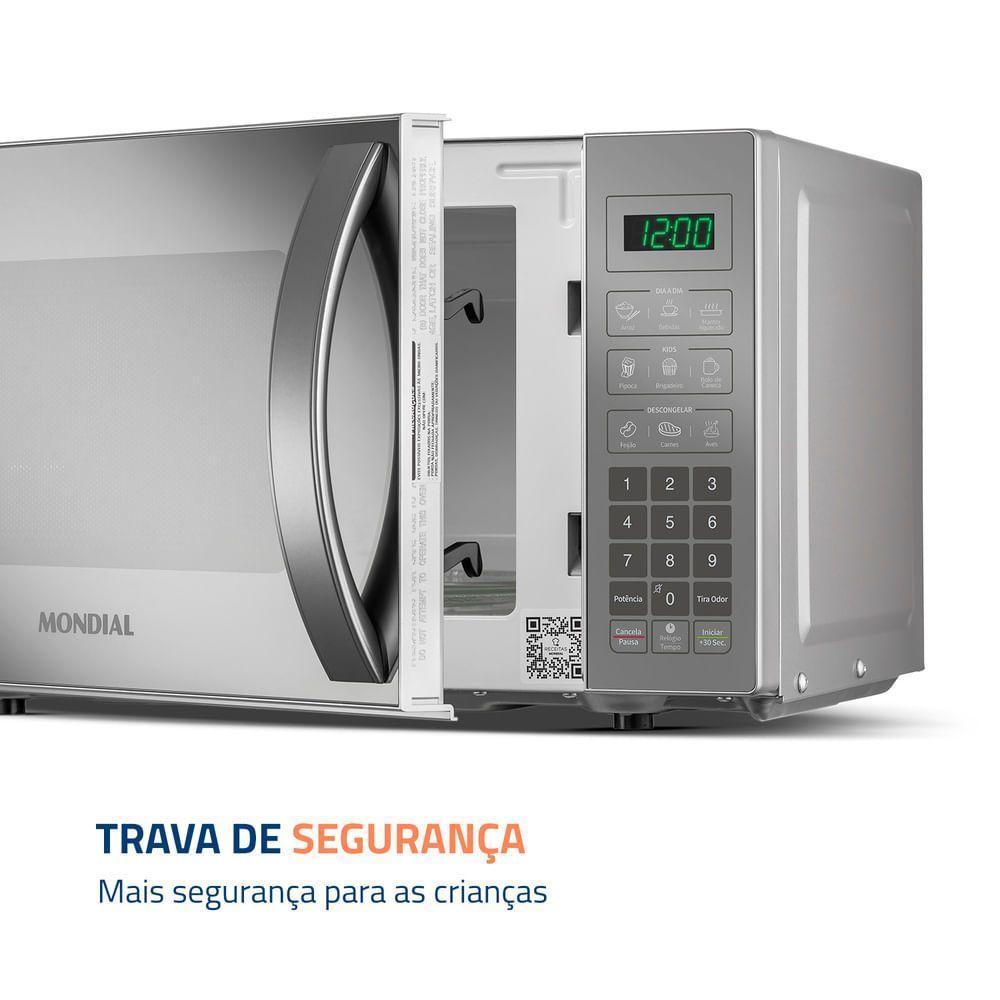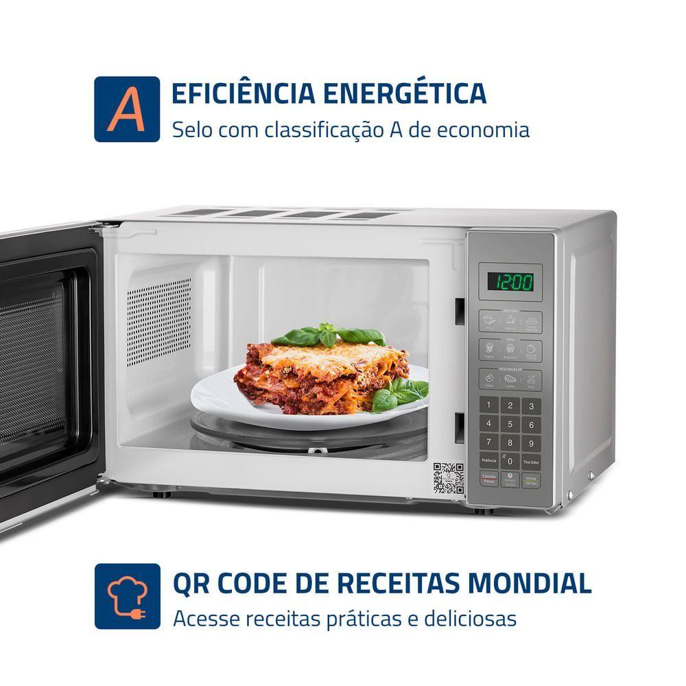 Micro-ondas Mondial Cinza E Espelhado 1200w Mo-01-21-e 220O Micro-ondas Espelhado da Mondial é sofisticado, eficiente e possui funções que facilitam sua vida na cozinha! Tem capacidade de 21 litros, 1.200W de potência, Display Digital e funções como Menu Dia a Dia, que oferece opções rápidas para refeições cotidianas, e Menu Kids, com receitas especiais para crianças. Descubra todas as funcionalidades do MO-01-21-E e transforme sua rotina!CAPACIDADE DE 21 LITROS: Oferece a flexibilidade necessária para cozinhar, aquecer e descongelar uma variedade de pratos, desde refeições rápidas até pratos mais complexos.POTÊNCIA: 1200W: Com alta potência, você prepara e descongela seus alimentos com mais rapidez e eficiência, facilitando sua rotina diária.MODELO ESPELHADO: Garante sofisticação e um visual moderno para a sua cozinha, complementando a decoração com elegância. Escolha o modelo espelhado e transforme seu espaço!MENU DIA A DIA: Prepare as receitas que você mais usa com apenas um clique, otimizando seu tempo.FUNÇÃO DESCONGELAR: A praticidade de descongelar alimentos de forma rápida e fácil, com apenas um toque.FUNÇÃO MANTER AQUECIDO: Mantém seu prato na temperatura ideal até o momento de servir, garantindo sempre uma refeição quente e saborosa.MENU KIDS: Prepare facilmente as receitas que as crianças adoram, como pipoca, brigadeiro e bolo de caneca. A hora do lanche vai ficar divertida e deliciosa! 10 AJUSTES DE POTÊNCIA: Com 10 níveis de potência, você pode ajustar facilmente a intensidade para cozinhar, aquecer ou descongelar seus alimentos de forma eficiente.FUNÇÃO TIRA ODOR: Mantenha seu forno micro-ondas limpo por mais tempo, eliminando os odores indesejados das refeições anteriores.TRAVA DE SEGURANÇA: A função de trava de segurança proporciona tranquilidade, impedindo que as crianças utilizem o micro-ondas sem supervisão.DESIGN COMPACTO: Sua cozinha fica organizada com o micro-ondas da Mondial, que ocupa menos espaço sobre a bancada, armário embutido ou em suportes.EFICIENCIA ENERGÉTICA: Baixo consumo de energia: selo com classificação A de economia.QR CODE DE RECEITAS MONDIAL: O QR Code vem no próprio aparelho e possibilita que você acesse diversas receitas práticas e deliciosas para serem feitas no micro-ondas.UM ANO DE GARANTIA MONDIAL: A Mondial é a escolha de milhões de consumidores. Mondial, a escolha inteligente!Modelo - MO-01-21-EPotência - 1200WConsumo - 1,2Kw/hVoltagem - 127V/220VCor - Cinza / EspelhadoDimensões - 26,2cm x 45,5cm x 34,8cm (AxLxP)Material - Aço Galvanizado e ABSItens Inclusos - 01 Forno Microondas; 01 Suporte do Prato Giratório; 1 Prato Giratório de Vidro e 01 Manual de Instruções.Capacidade - 21LNíveis de potência - 10Funções - Tira odor, descongelar, manter aquecido, menu dia a dia/menu kids e função relógioPrato giratório - SimTecla iniciar fácil - SimMarca - Mondial