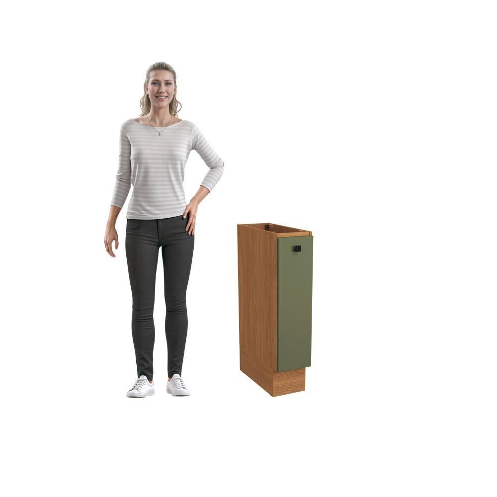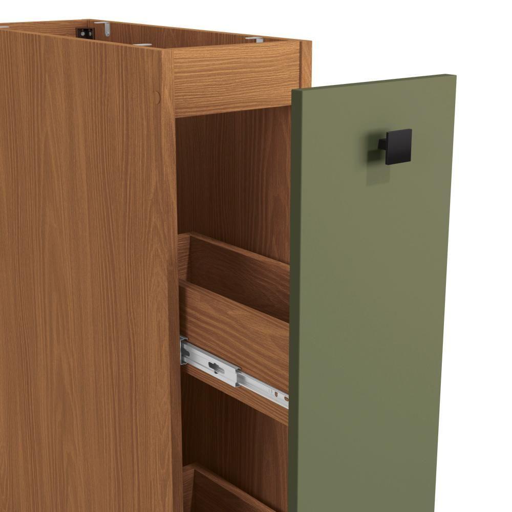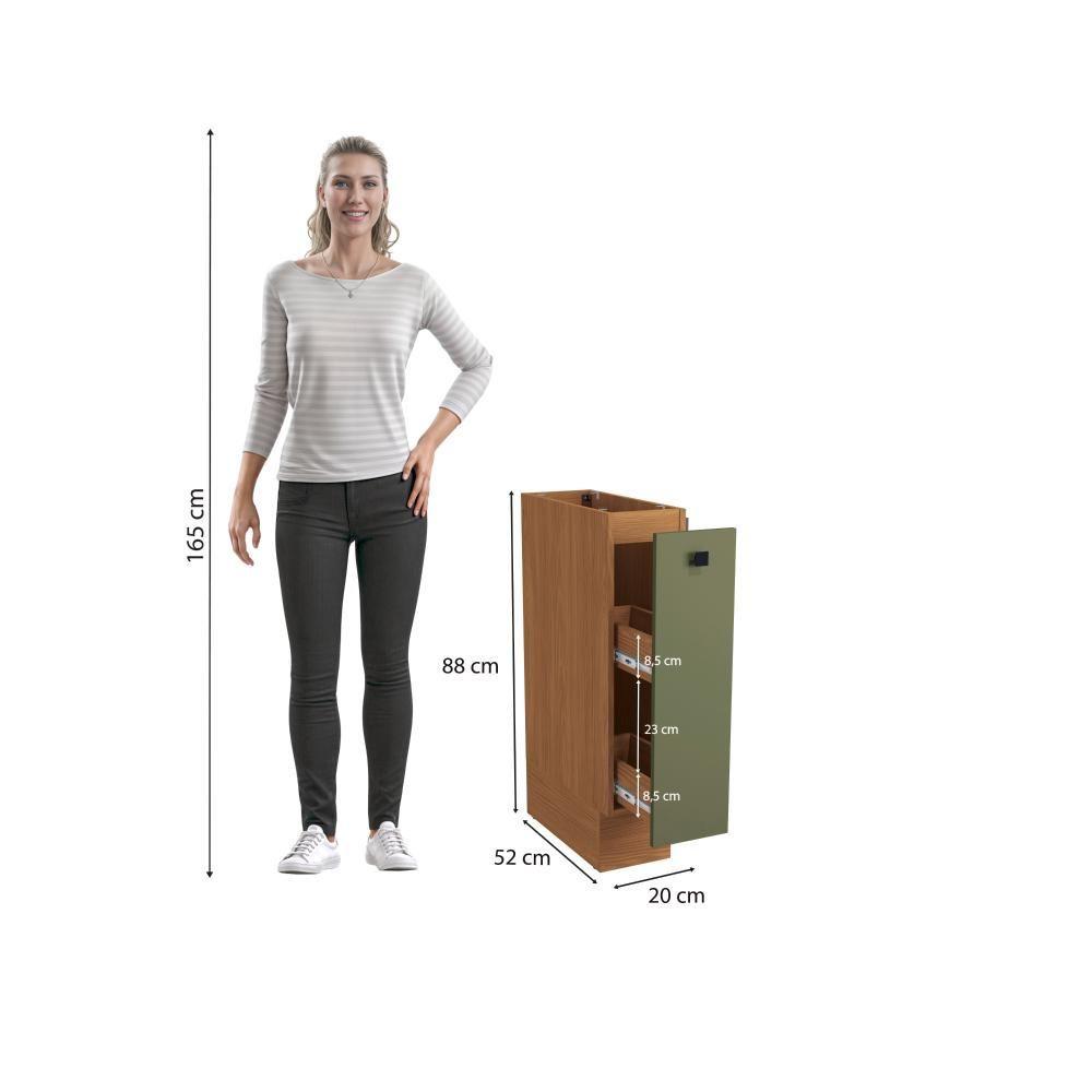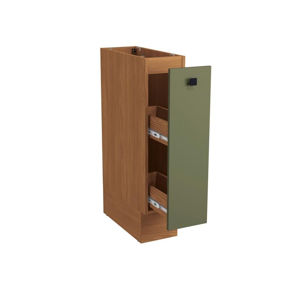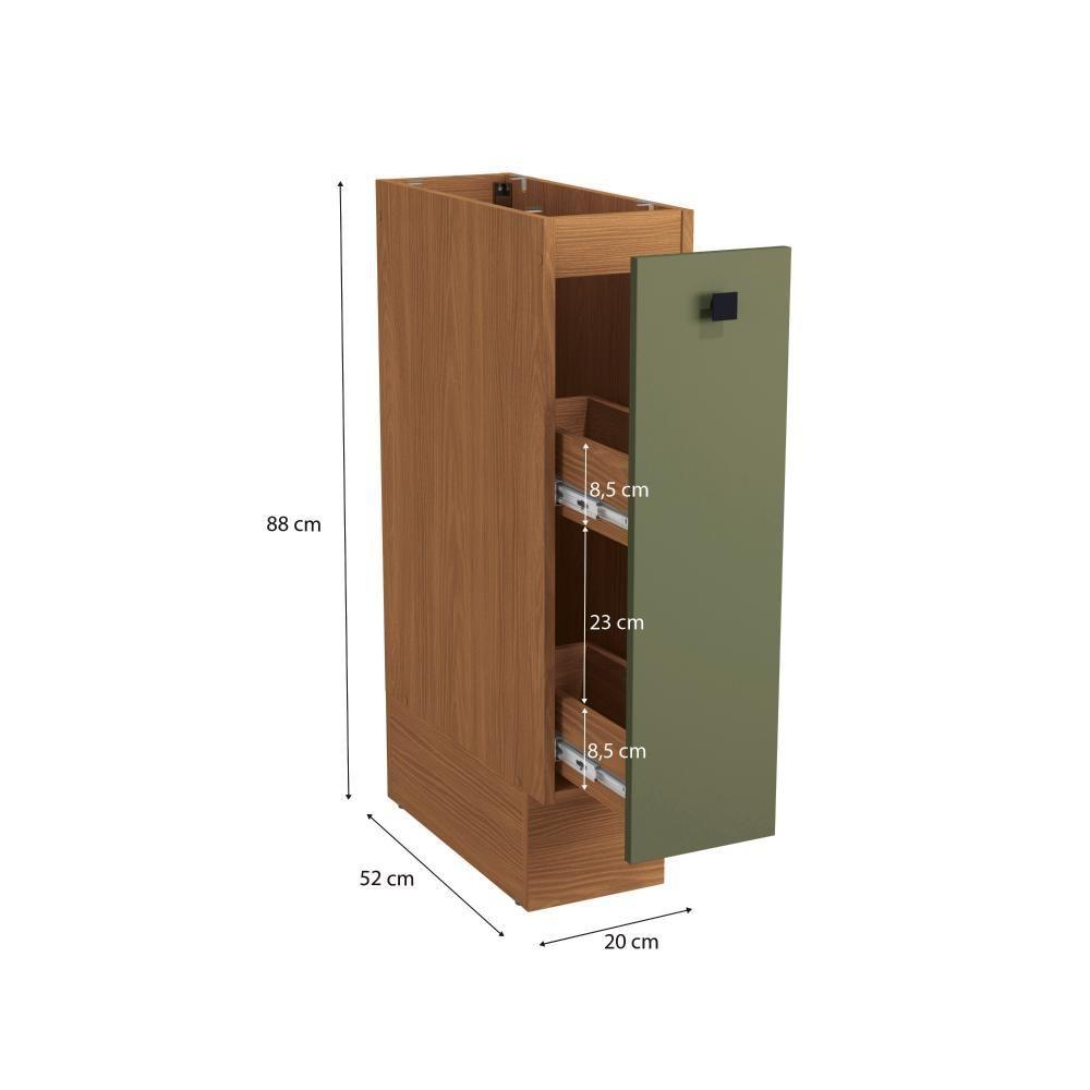 Nicho Porta Condimentos Kappesberg Pixel Canela/verde Frevo 20cmTransforme sua cozinha e a deixe mais completa com a beleza e praticidade do Nicho Porta Condimentos 20cm R660 da Cozinha Pixel da Kappesberg. Produzido em chapa MDP de 15mm, garante robustez, firmeza e qualidade, além de um acabamento lindo.Com até sete camadas de pintura, a caixaria possui acabamento touch na cor canela, com a textura dos veios da madeira, enquanto a porta, em MDP e acabamento BP, é mais resistente contra riscos, arranhões e gotas d'água, e na cor verde frevo, possui acabamento fosco. Uma combinação aconchegante e moderna, que dará ainda mais destaque ao seu espaço, remetendo aos tons da natureza e deixando sua cozinha perfeita.Fechando ótimas combinações com o aéreo do mesmo tamanho, o nicho pode ser montado com tampo ou pedra, e para um melhor acabamento, ele conta com rodapé, mas acompanha as ferragens para ser montado suspenso, e se você preferir, também pode adquirir os pés separadamente, garantindo muita praticidade. Com medidas de 88cm de altura, 20cm de largura e 52cm de profundidade, o nicho conta com uma porta corrediça e duas prateleiras, ideais para a organização de temperos e outros condimentos, facilitando o acesso e o preparo de suas receitas.O diferencial fica para as corrediças telescópicas, que permitem a abertura total e um melhor aproveitamento de espaço, além de maior resistência a peso. Já o puxador, metálico na cor preta, conta com detalhes em alto-relevo que completam o estilo e a qualidade do produto, garantindo um diferencial único para sua cozinha. Renove seu espaço e o deixe ainda mais completo com a Cozinha Pixel da Kappesberg.Medidas:- 88 cm de altura- 20 cm de largura- 52 cm de profundidadeItens inclusos:- Uma (1) gaveta (corrediças telescópicas)- Dois (2) porta condimentos- Produzido em MDP- RodapésCódigo do produto: R660-CNVFInformações importantes:- As imagens são ilustrativas.- A Kappesberg não disponibiliza serviço de montagem (recomendamos a contratação de um profissional qualificado).- O manual de montagem acompanha o produto.- 3 meses de garantia para defeitos de fabricação.Acabamento: 100% BP / Pintura Touch | Cor: CANELA/VERDE FREVO | Corrediças: Telescópicas | Garantia: 3 meses para defeito de fabricação | Gavetas: Internas | Matéria-prima: MDP / MDP BP | Peso suportado por gaveta: 6 kg | Quantidade de gavetas: 2 | Sistema de montagem: Parafuso Philips | Materiais do corpo: MDP | Inclui manual de montagem: Sim | Requer montagem: Sim | Tipo de móveis de cozinha: Balcão