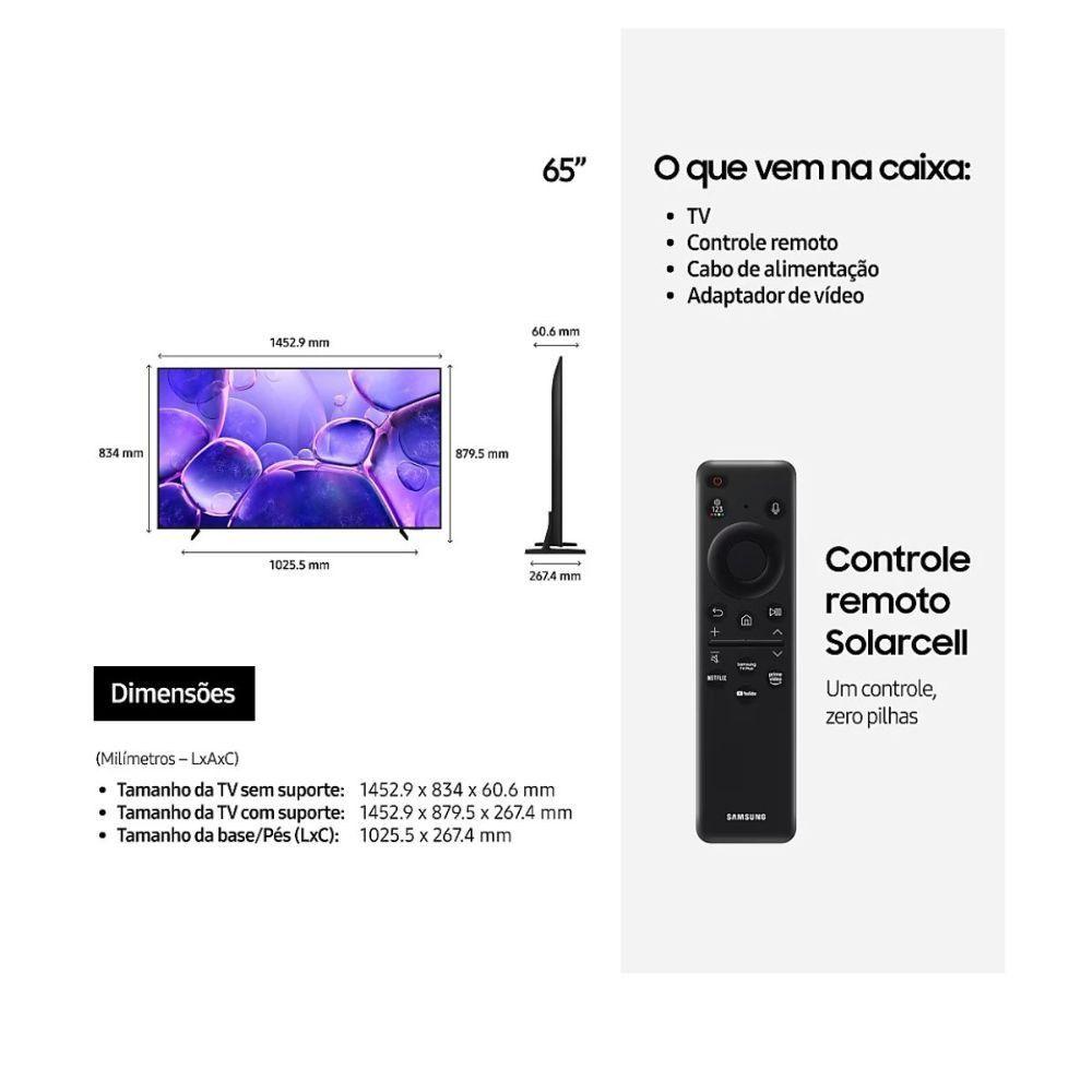 Smart TV 65 Samsung Crystal UHD 4K U8600F Xbox Cloud Gaming Preto BivoltO Futuro do Entretenimento em Sua Sala. Transforme sua experiencia de assistir TV com a Samsung Smart TV 65 Crystal UHD 4K U8600F. Com uma tela enorme e qualidade de imagem 4K impressionante, ela e ideal para quem busca o melhor em performance, conectividade e inovacao.Principais Caracteristicas: Crystal UHD 4K. Aproveite a nitidez e os detalhes excepcionais da resolucao 4K, proporcionando imagens vibrantes e realistas para todos os tipos de conteudo.Xbox Cloud Gaming Integrado Acesse milhares de jogos nas plataformas Xbox Cloud Gaming e Nvidia GeForce Now, sem necessidade de downloads ou de consoles. E, com o Samsung TV Plus e apps parceiros*, desfrute de canais de filmes, noticias, infantil, esportes, novelas e musicas, tudo gratis e sem assinatura.MODELO: UN65U8600FGXZDTela:Tamanho da tela: 65Resolucao: 4K (3,840 x 2,160)Frequencia do painel: 60HzVideo:Processador: Processador Crystal 4KHDR (High Dynamic Range): HDRHDR 10+: SuporteContraste: Mega ContrasteMicro Dimming: Esmaecimento UHDContrast Enhancer: SimTecnologia Motion: Motion XceleratorColor Booster: SimModo Filmmaker: SimAudio:Som em Movimento: Som em Movimento VirtualSincronia Sonora: SimPotencia (RMS): 20WCanais de audio: 2 CanaisSom adaptativo: SimFuncoes Smart:Sistema operacional: Tizen Smart TV ( 7 Anos de Atualizacao)Bixby: SimAssistente de Voz Integrado: Alexa IntegradaSamsung TV Plus: SimSamsung Gaming Hub: SimApp Xbox Cloud Gaming: SimApp NVidia GeForce Now: SimNavegador (Web Browser): SimHub SmartThings / Hub Matter / Funcionalidade IoT-Sensor / App de Controle Remoto: SimExperiencia de Multiplos Dispositivos: Espelhamento do Smartphone de Imagem e Som para TVControle Por Gestos: SimCompartilhamento de Dados entre Dispositivos: SimApple AirPlay: SimHub Daily+: SimFuncoes Game:Auto Game Mode ALLM: SimVRR: SimHGiG: SimGaming Hub: SimSintonizador Transmissao:Transmissao digital: ISDB-TSintonizador analogico: Sim (Trinorma)Data Broadcasting: GINGATV Key: SimConectividade:Wi-Fi: Sim (Wi-Fi 5)Bluetooth: Sim (BT 5.2)HDMI: 3Canal de Retorno de Audio HDMI: eARC/ARCAnynet+ (HDMI-CEC): SimUSB: 1 x USB-AEthernet (LAN): 1Entrada de RF (terrestre/entrada de cabo): 1 / 1 (Uso Normal para o Terrestre) / 0Design:Design: FinaTipo de Borda: 3 bordas infinitasTipo de suporte: FLAT FEETRecursos:EPG: SimControle de IP: SimIdioma: Idioma localAcessibilidade:Guia de Voz: Ingles (EUA), Portugues (Brasil), Espanhol (Mexico)Suporte para deficientes visuais: Menu e Texto com Zoom, Auto contraste, See Colors, Inversao de Cor, Escala Cinza, Modo de Imagem Auto OffSuporte para deficientes auditivos: Legenda, Multipla Saida de Audio, Zoom em Linguagem de Sinais.Suporte para deficientes motores: Botao de repeticao em modo lento, App de Controle Remoto.Alimentacao:Alimentacao de Energia: AC100-240V 50/60HzConsumo de Energia (Maximo): 170 WSensor Ecologico: SimAI Energy Mode: SimDesligamento Automatico: SimDimensoes com base:Altura: 87,9 cmLargura: 145,29 cmProfundidade: 26,74 cmPeso: 16,4 kgDimensoes sem base:Altura: 83,4 cmLargura: 145,29 cmProfundidade: 6,06 cmPeso: 15,9 kgGarantia: 12 meses