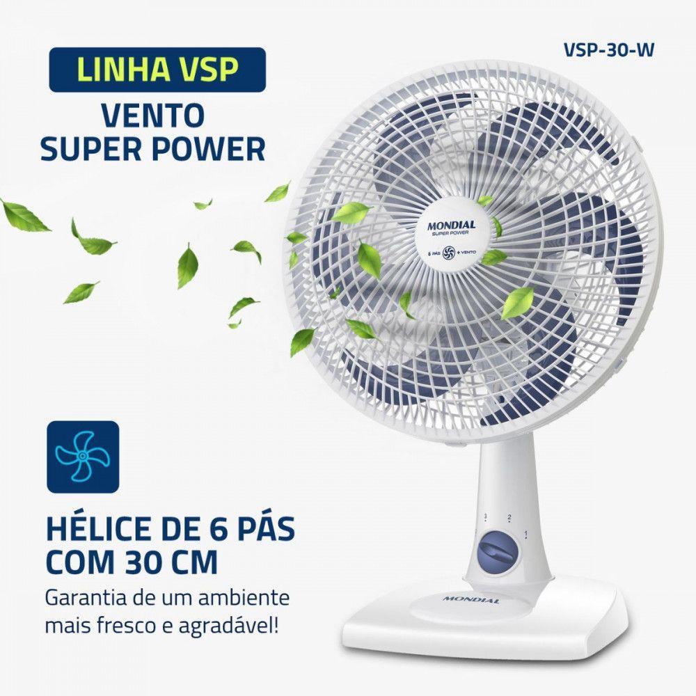 Ventilador Mesa Vsp-30-w 30cm Mondial Branco 127 VVentilador de 30cm + 6 Pas: Promove maior intensidade do vento e um ambiente fresco e agradavelMais Silencio: O sistema de ventilacao da Mondial apresenta baixo nivel de ruido, assegurando o conforto necessario para uma excelente noite de sono Oscilacao Horizontal: Amplia o raio de alcance do vento; Voce escolhe distribuir o ar no ambiente ou direcionar o fluxo, fixando o botao inclinacao vertical Regulavel: Promove um direcionamento ideal do fluxo do ar Controle de Velocidade: As 3 opcoes de velocidade permitem adequar o vento a sua necessidade Facilidade na Limpeza: As grades (frontal e traseira) e a helice sao removiveis e facilitam a limpeza, simplificando a lavagem e a remocao da poeira. Diferencial: Quantidade de pas: 6 Botao Inclinacao Vertical: Regulavel Controle de Velocidade: 3 opcoes Grades frontal e traseira: removiveis Helice: removivel Alca transporte: sim Conteudo da embalagem: 01 Ventilador Mesa Vsp-30-w 30cm Mondial Modelo: VSP-30-W Dimensoes do produto: Altura: 49 cm Largura: 35 cm Profundidade: 24,5 cm Peso: 1,6 kg Garantia do Fornecedor: 12 meses (Contra defeito de fabricacao a contar do momento da emissao da Nota Fiscal).