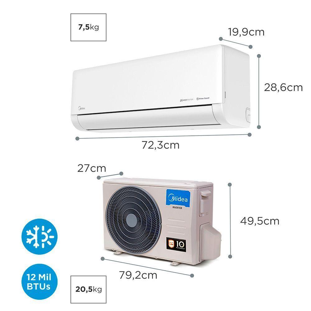 Ar Condicionado Split Midea Ai Ecomaster 12000 Inverter Q/f Branco 220 VChegou o Inverter dos Inverters: o novo ar-condicionado com Inteligencia Artificial. A exclusiva Tecnologia AI ECOMASTER oferece ate 30 mais economia de energia, em qualquer temperatura escolhida, garantindo conforto e a climatizacao ideal para o seu ambiente.Alem disso, a Inteligencia Artificial tambem controla a umidade do ambiente com o AI Controle de Umidade, enquanto a conectividade avancada via aplicativo SmartHome permite controle por voz via Assistente Virtual com Comando de Voz, Google Assistant e Apple Siri. Acompanhe o consumo de energia em tempo real com notificacoes sobre gastos e explore diversas funcoes exclusivas.E mais: com o Smart Turbo, sinta o ambiente mais fresco em apenas 30 segundos e conte com o Air Magic para um ambiente com ar mais puro. Disponivel nos modelos de 9.000, 12.000, 18.000 e 24.000 BTUs nos modos Frio e Quente/Frio.MODELO: AI EcomasterTipo de produto: Ar-condicionado InverterTecnologia principal: AI ECOMASTEREconomia de energia: Ate 30Funcao de inteligencia artificial: Controle automatico de temperatura e umidadeControle de umidade: AI Controle de UmidadeConectividade: SmartHome (aplicativo)Assistentes compativeis: Assistente Virtual com Comando de Voz, Google Assistant, Apple SiriMonitoramento: Consumo de energia em tempo realNotificacoes: Gastos de energiaFuncao de resfriamento rapido: Smart Turbo (ambiente fresco em 30 segundos)Funcao de purificacao do ar: Air MagicCapacidade disponivel: 9.000 / 12.000 / 18.000 / 24.000 BTUsModos de operacao: Frio e Quente/FrioDimensoes:Altura: 28,6 cmLargura: 72,3 cmProfundidade: 19,9 cmPeso: 7,5 KgDimensoes da Condensadora:Altura: 49,5 cmLargura: 79,2 cmProfundidade: 27 cmPeso: 20,5 KgGarantia do Fornecedor: 12 Meses